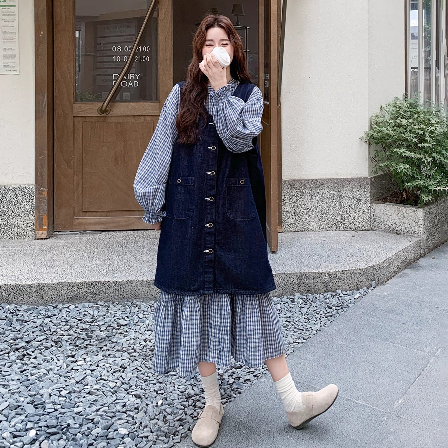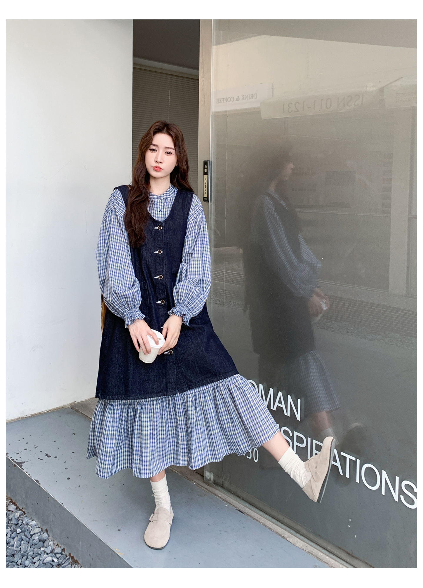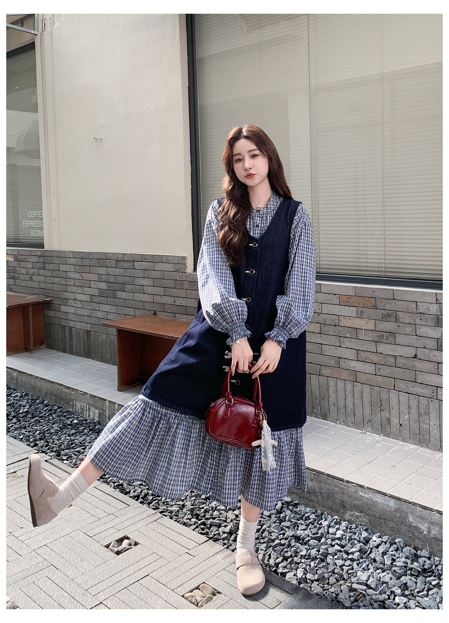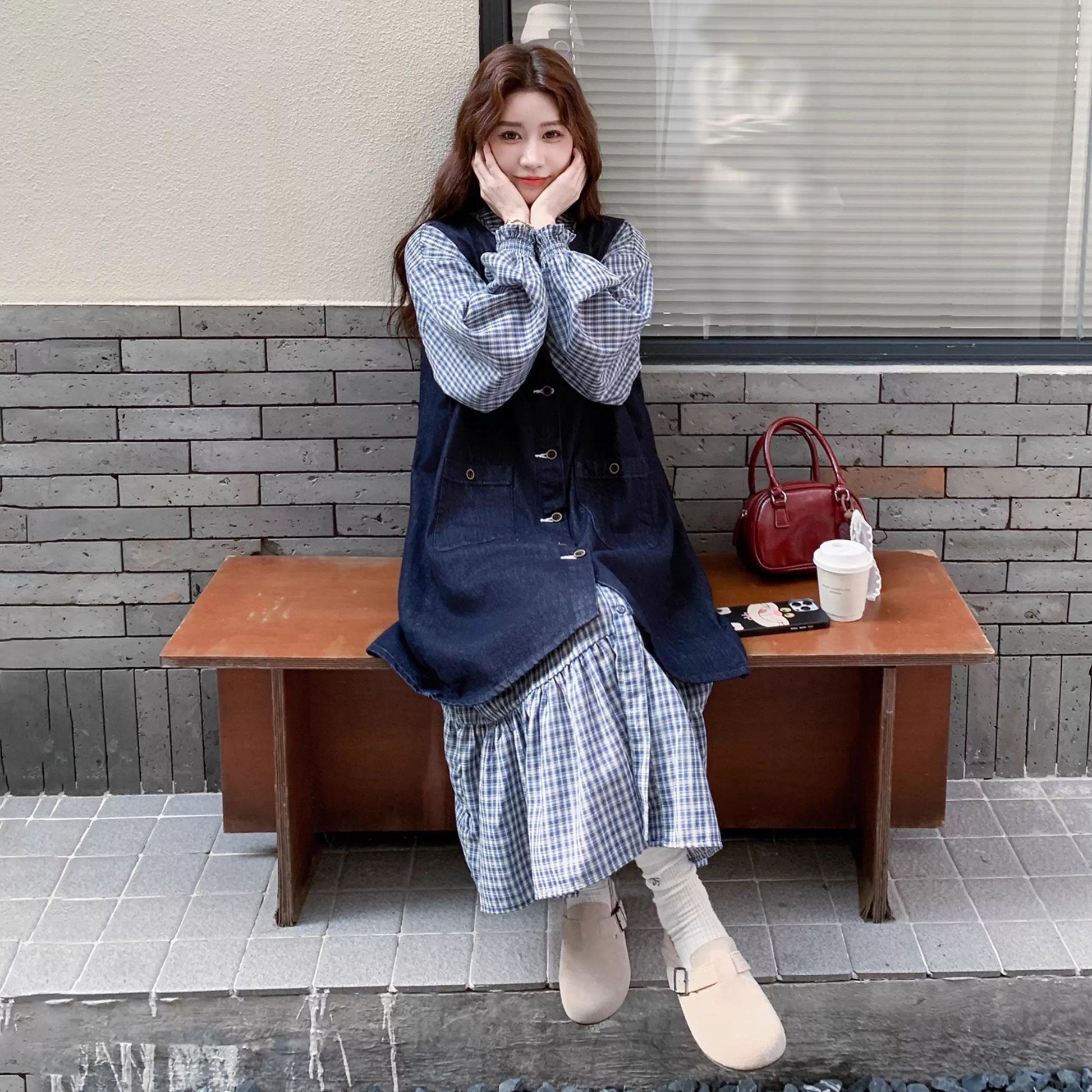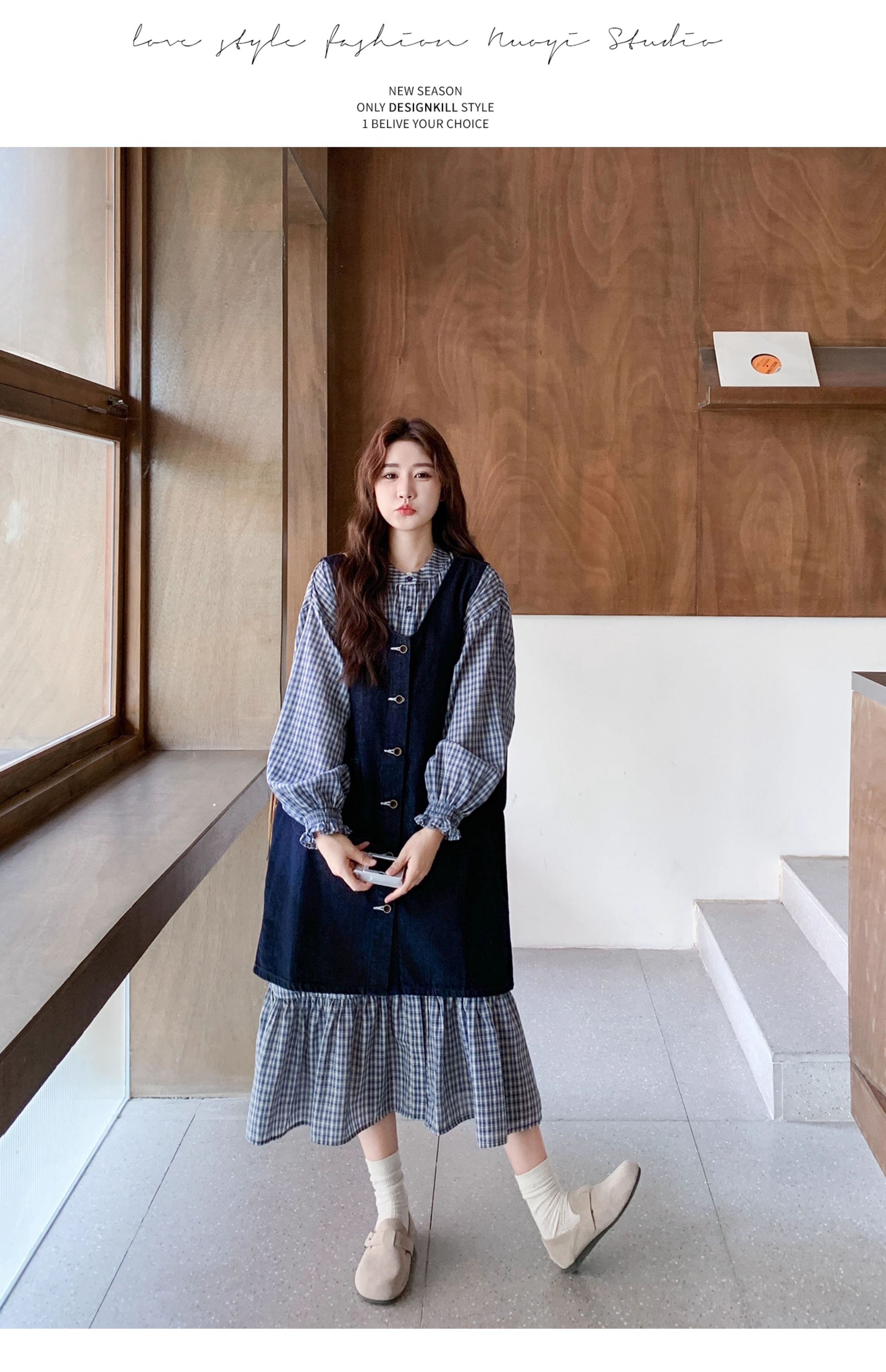 2点セット【セットアップ】韓国風 レトロ 学院スタイル デニム ジレワンピースセット レディース 2025年秋新作 チェック柄【SHシリーズ】