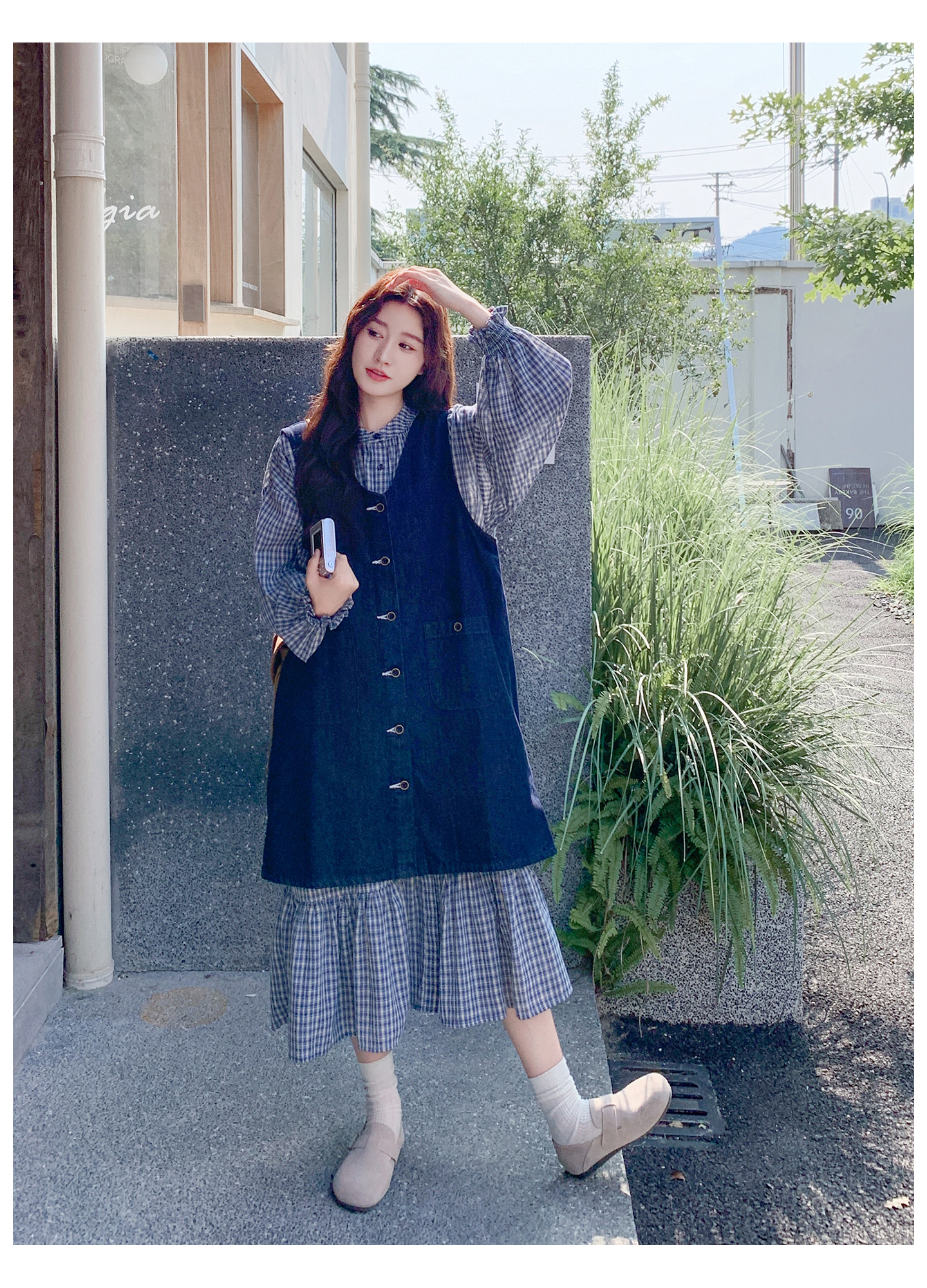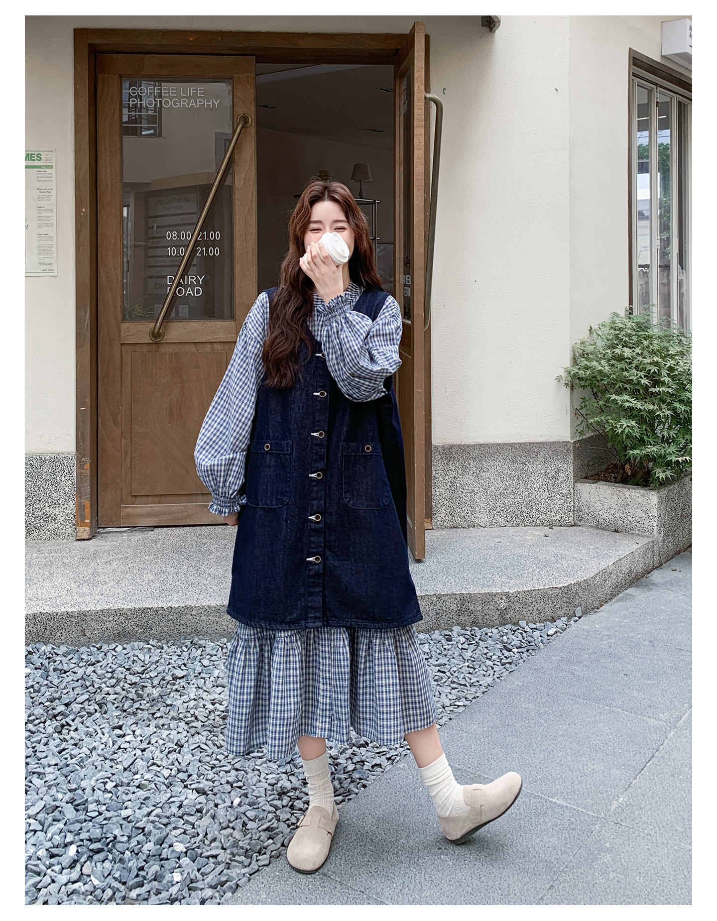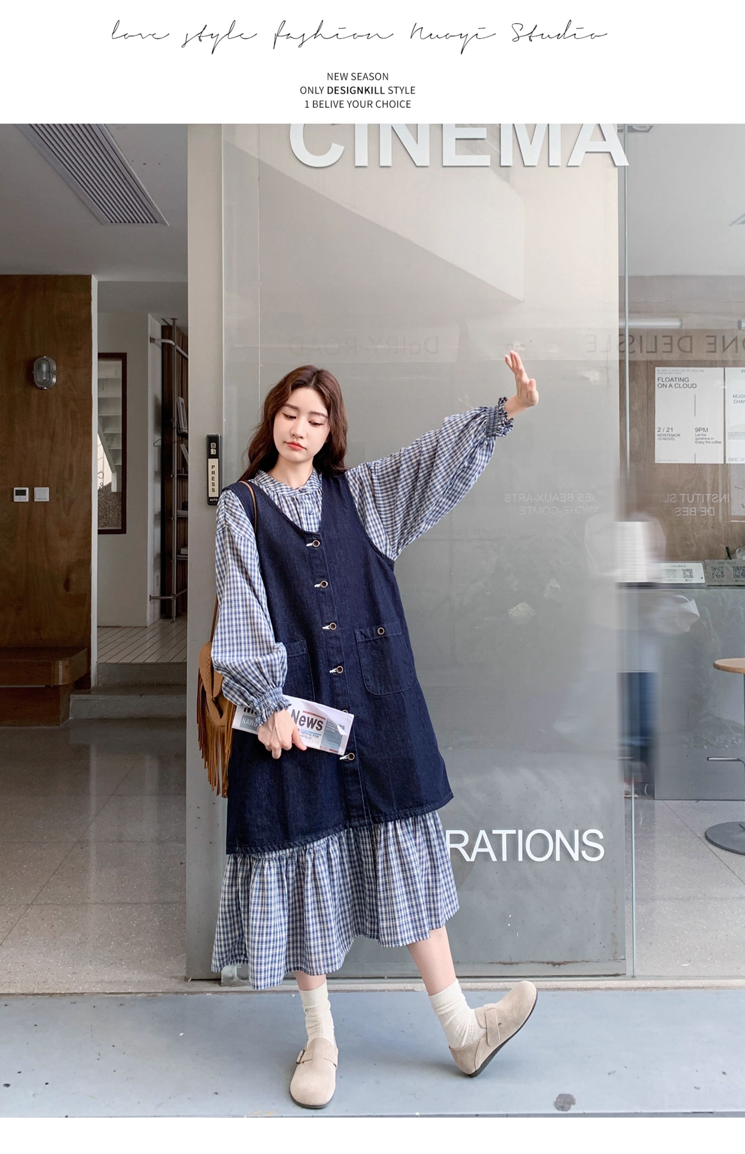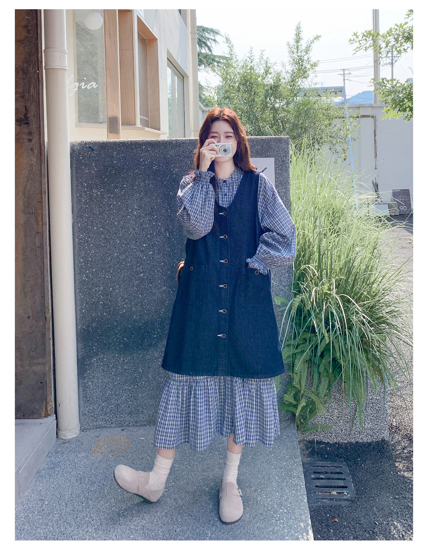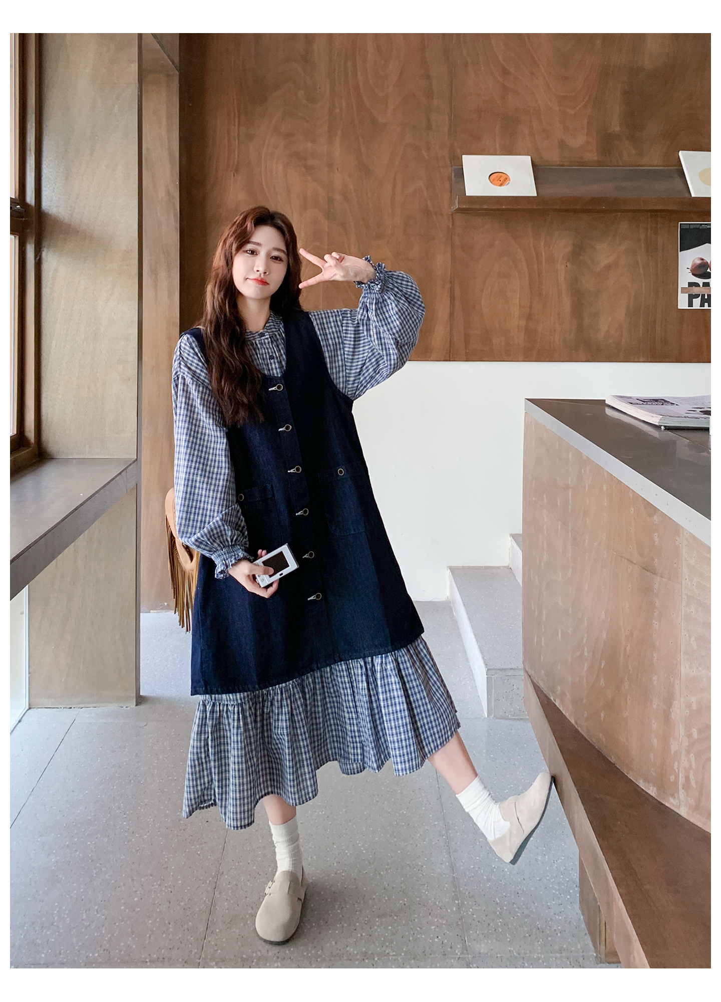 2点セット【セットアップ】韓国風 レトロ 学院スタイル デニム ジレワンピースセット レディース 2025年秋新作 チェック柄【SHシリーズ】