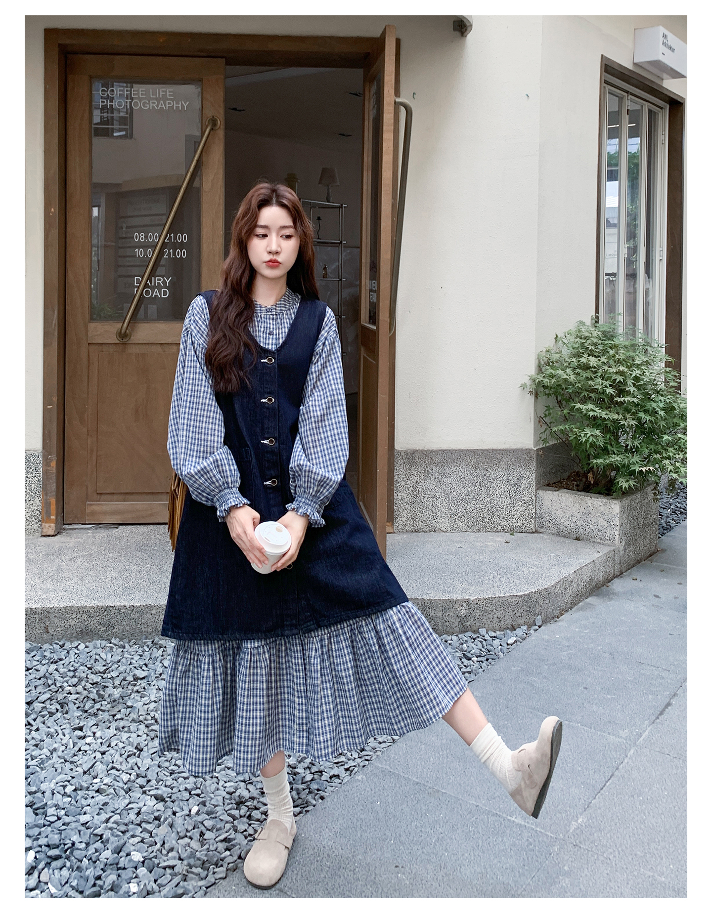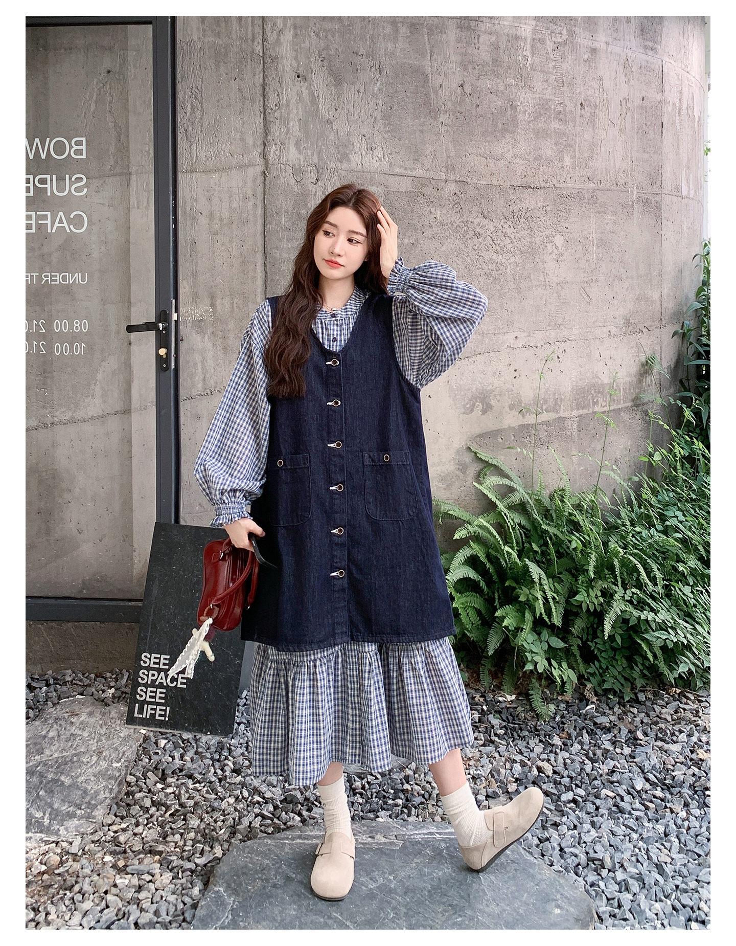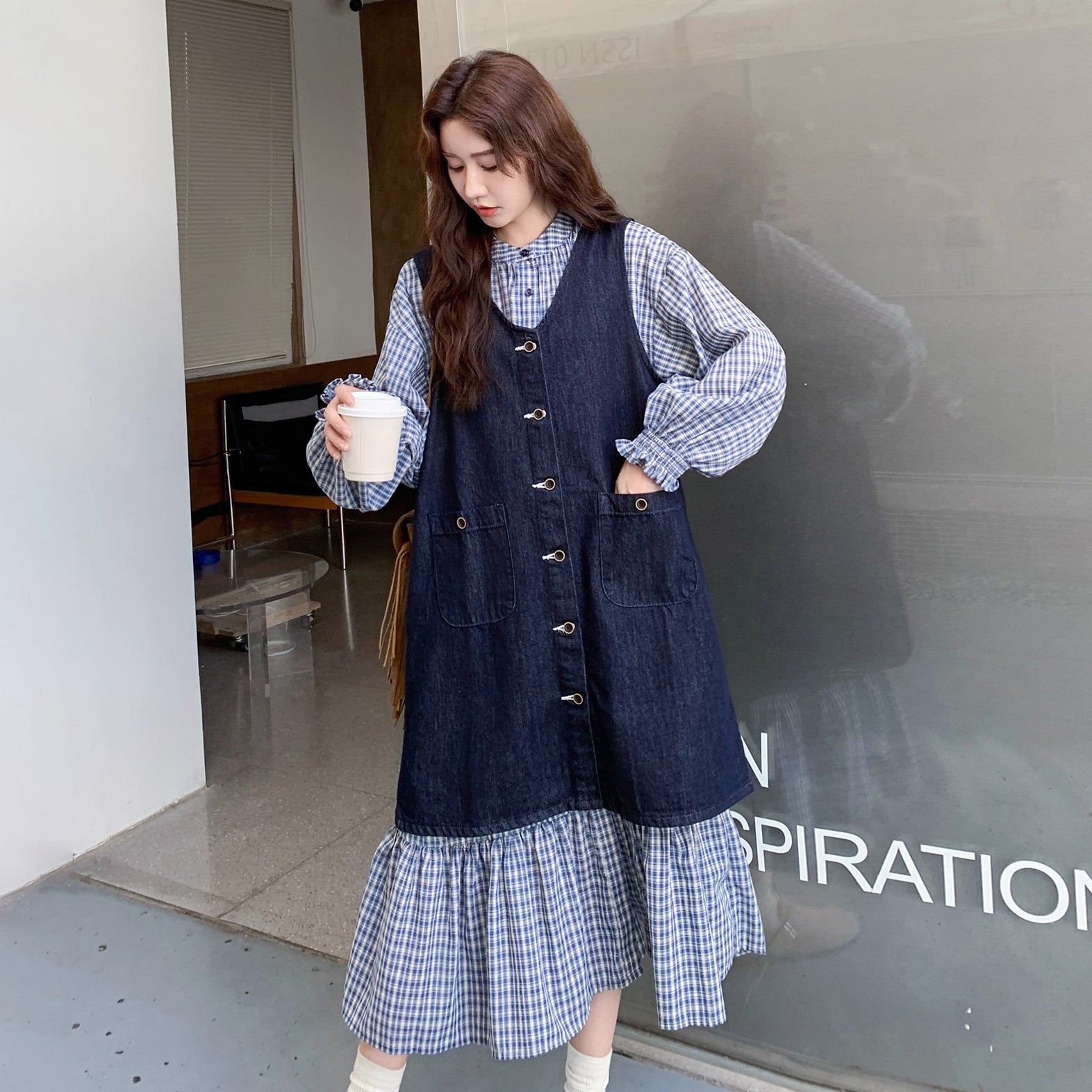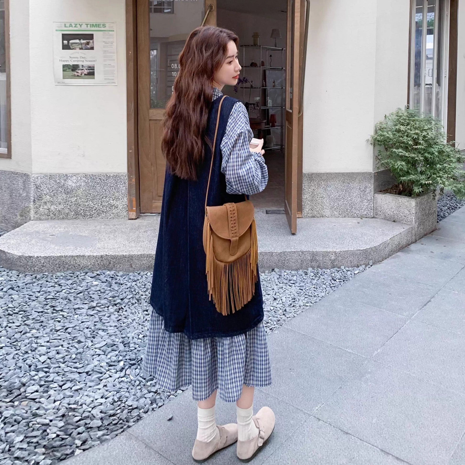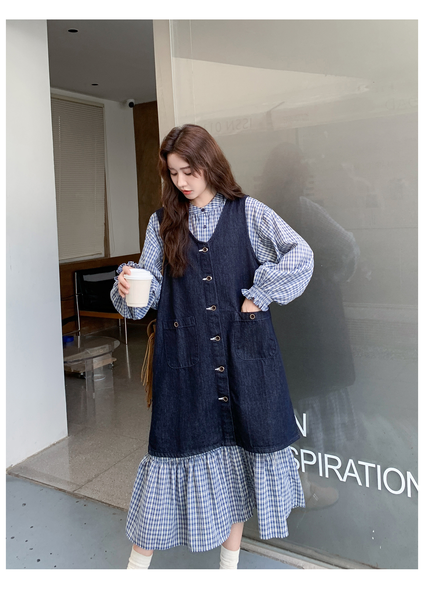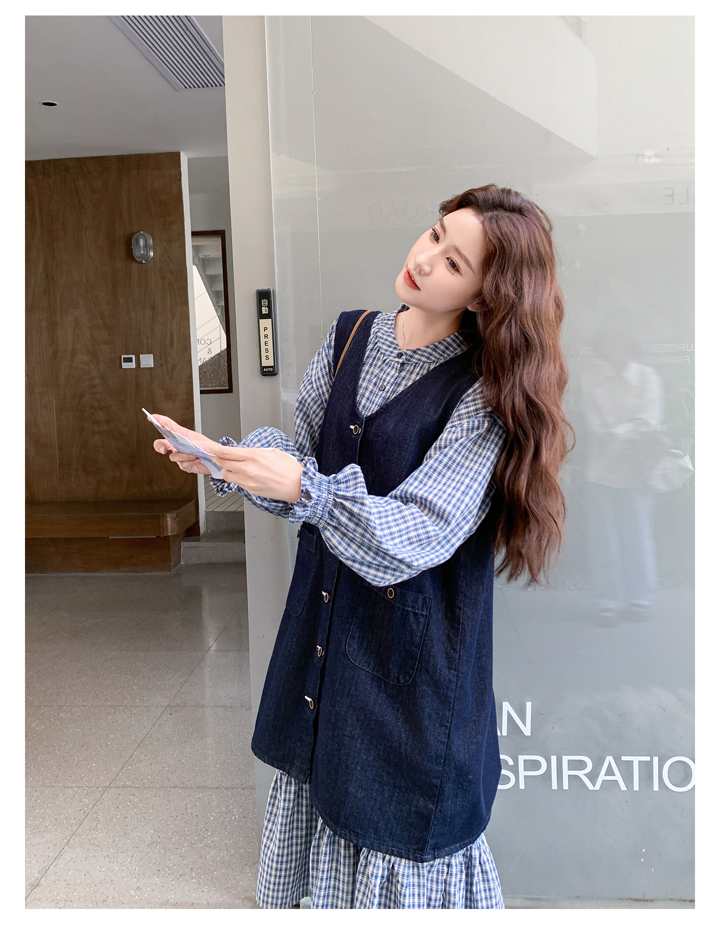 2点セット【セットアップ】韓国風 レトロ 学院スタイル デニム ジレワンピースセット レディース 2025年秋新作 チェック柄【SHシリーズ】