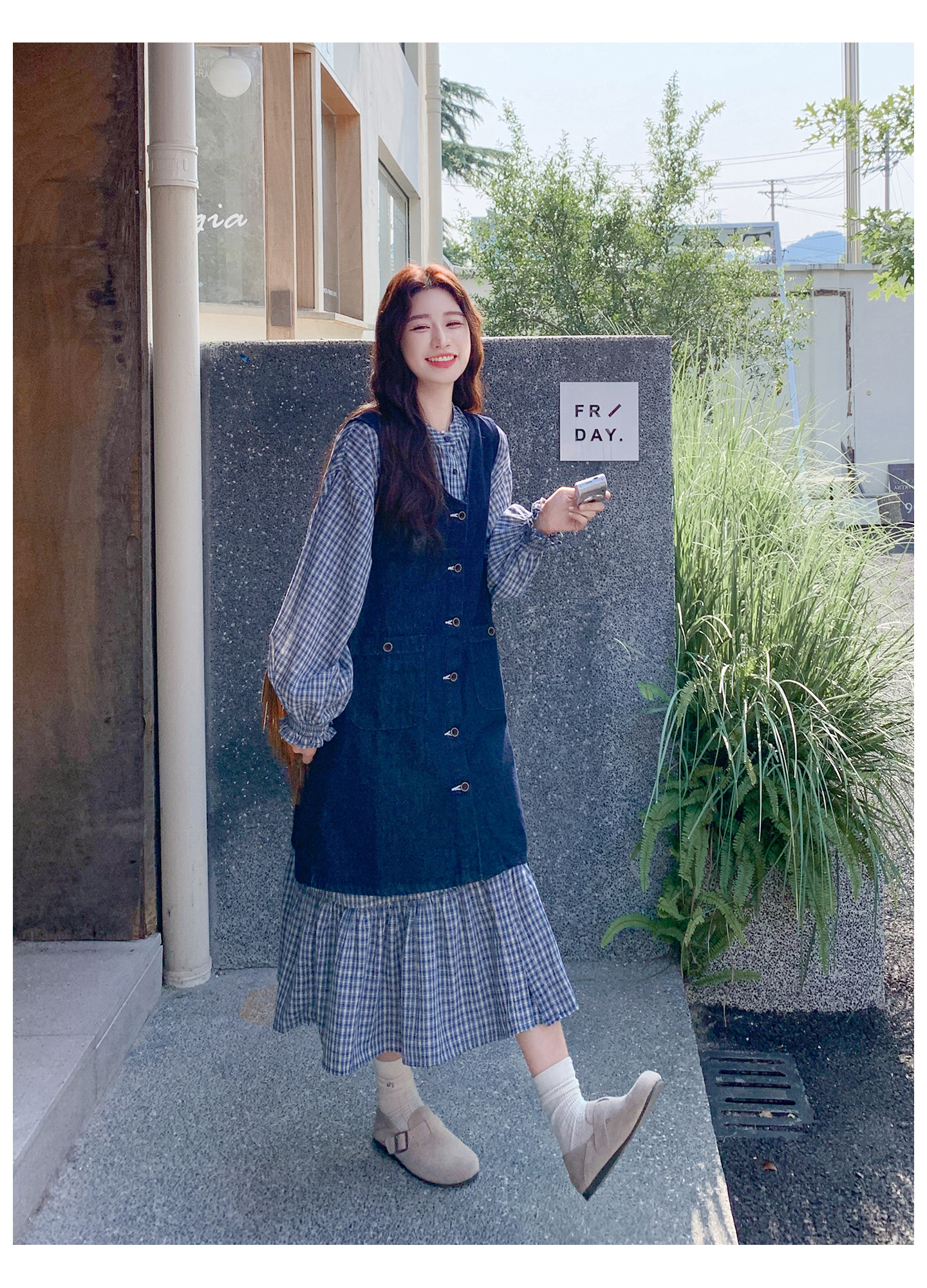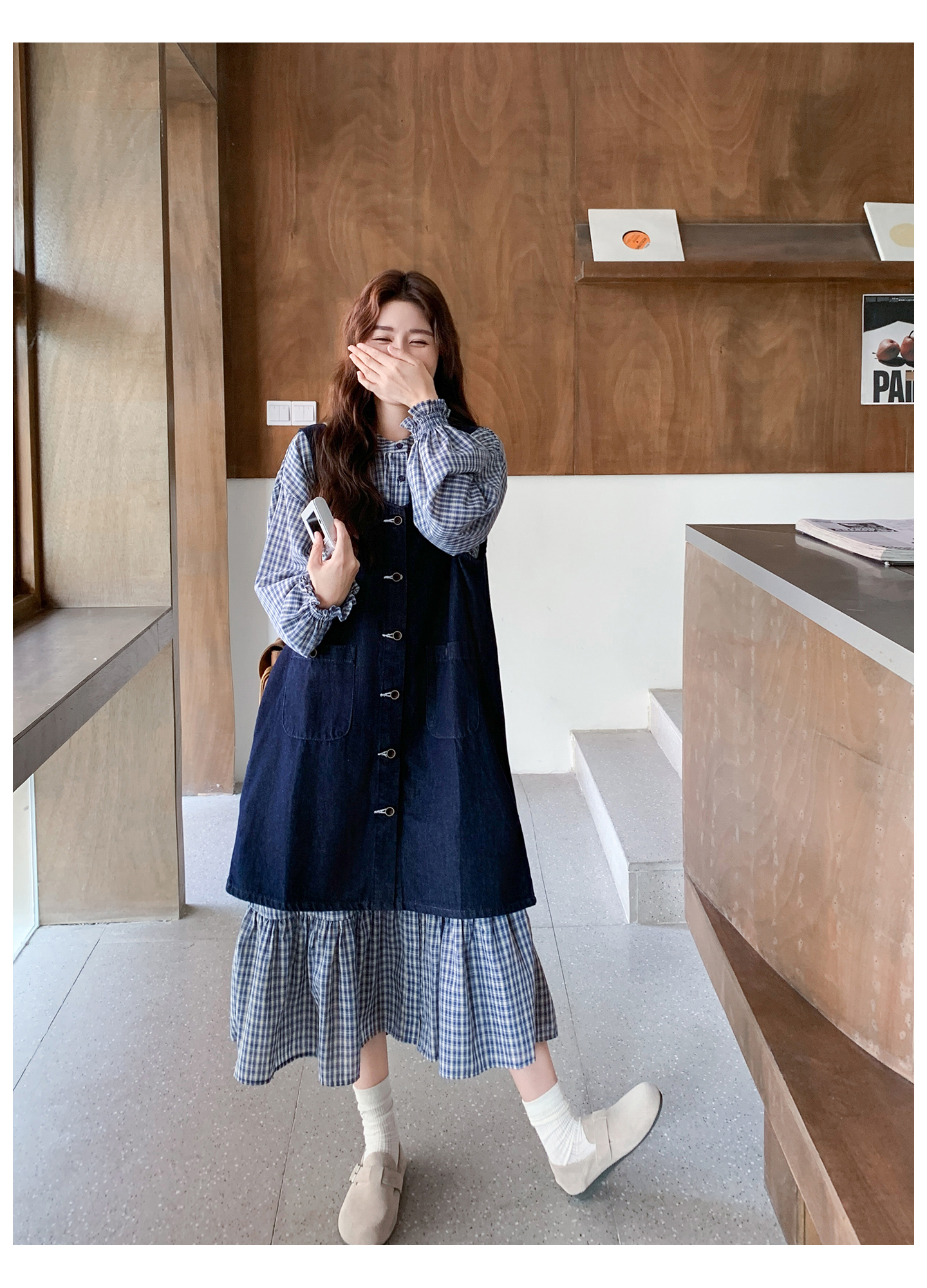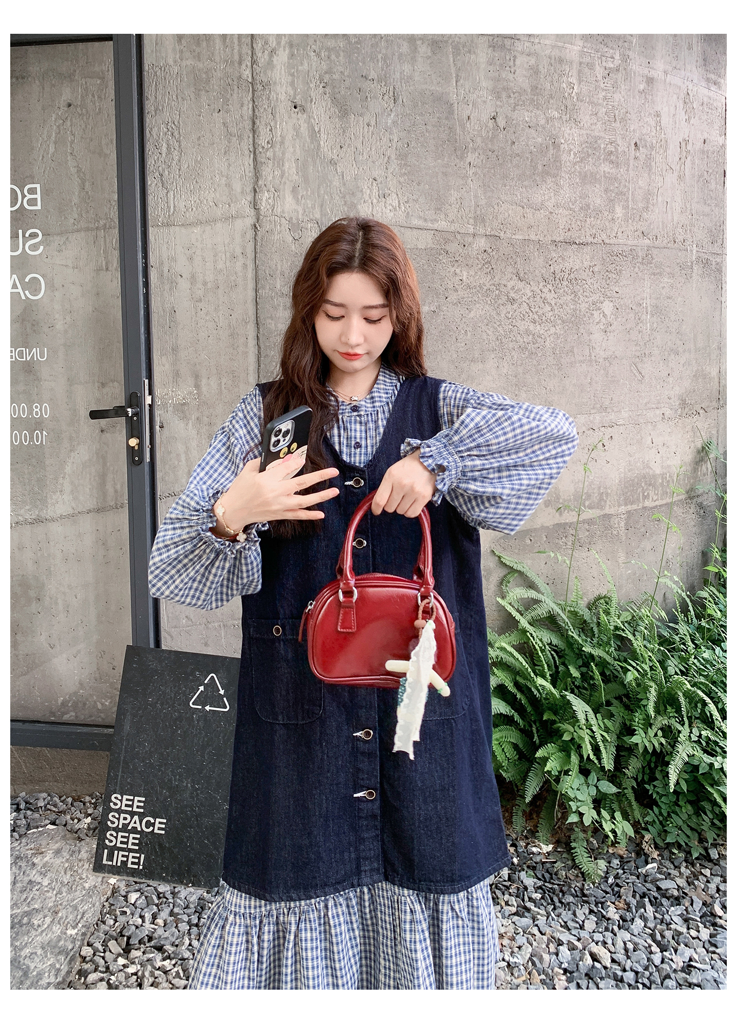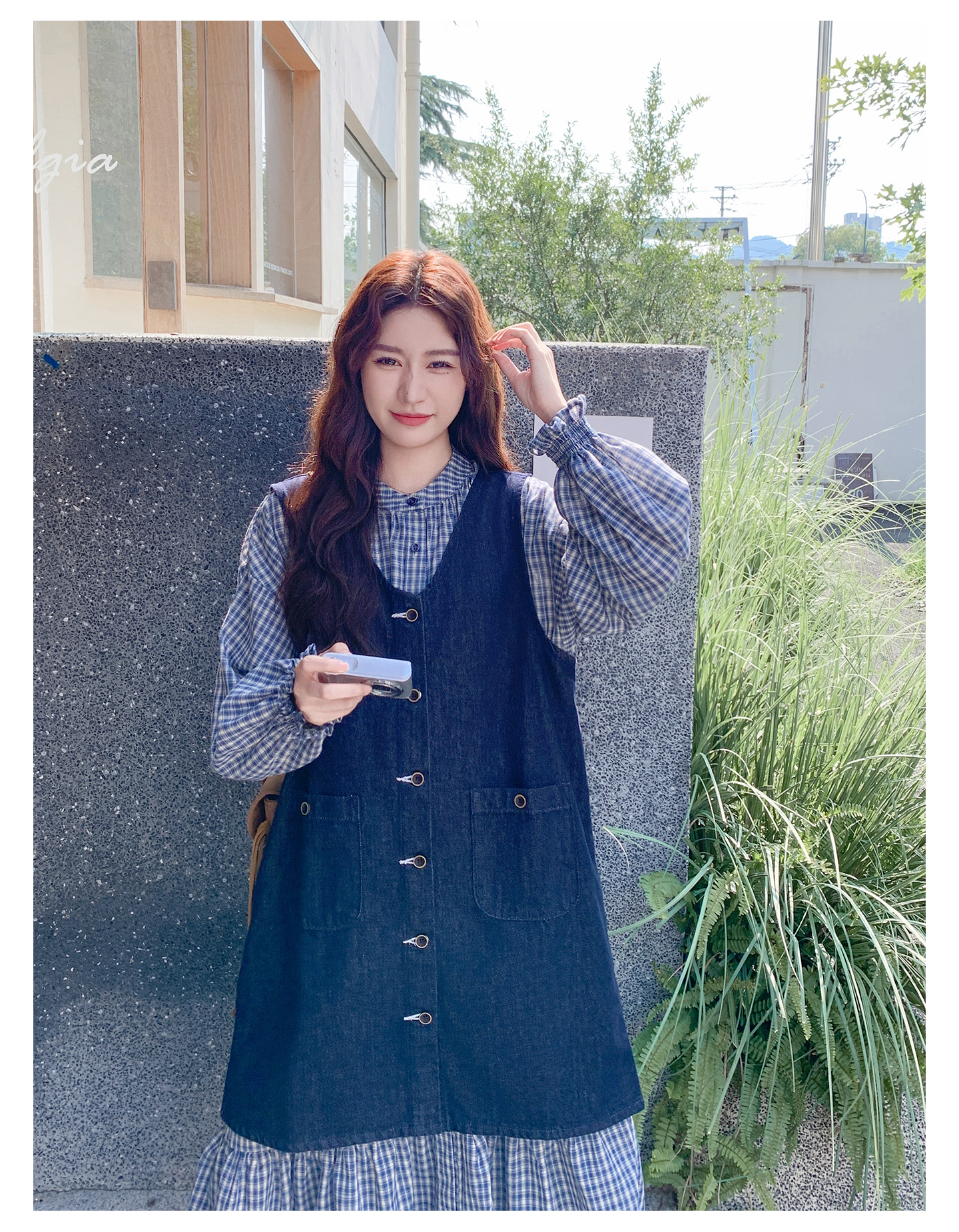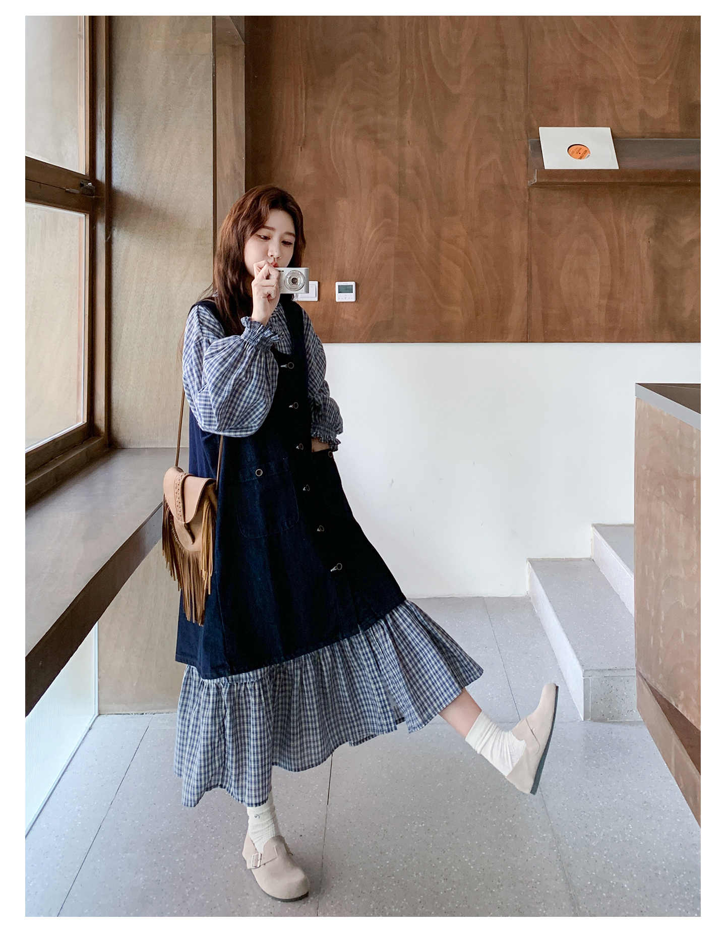 2点セット【セットアップ】韓国風 レトロ 学院スタイル デニム ジレワンピースセット レディース 2025年秋新作 チェック柄【SHシリーズ】