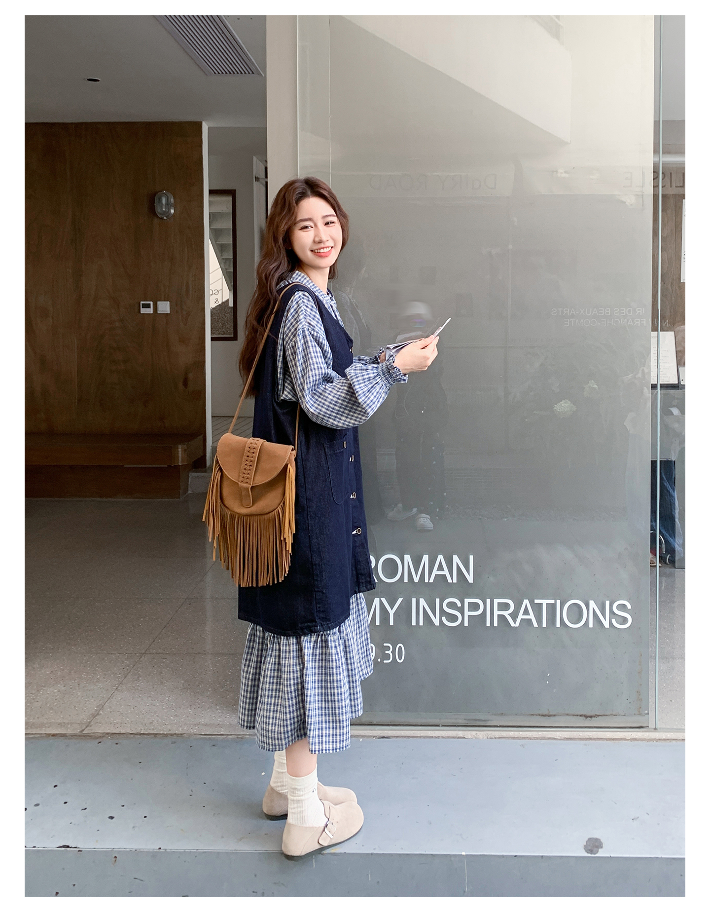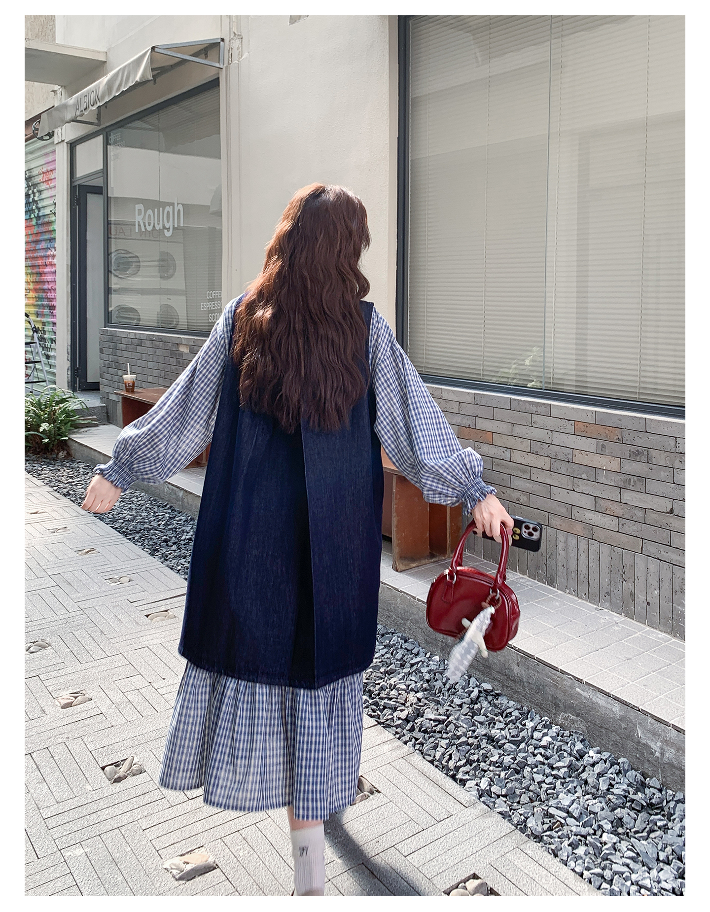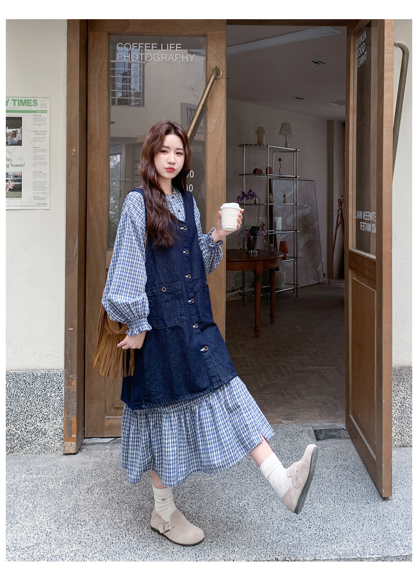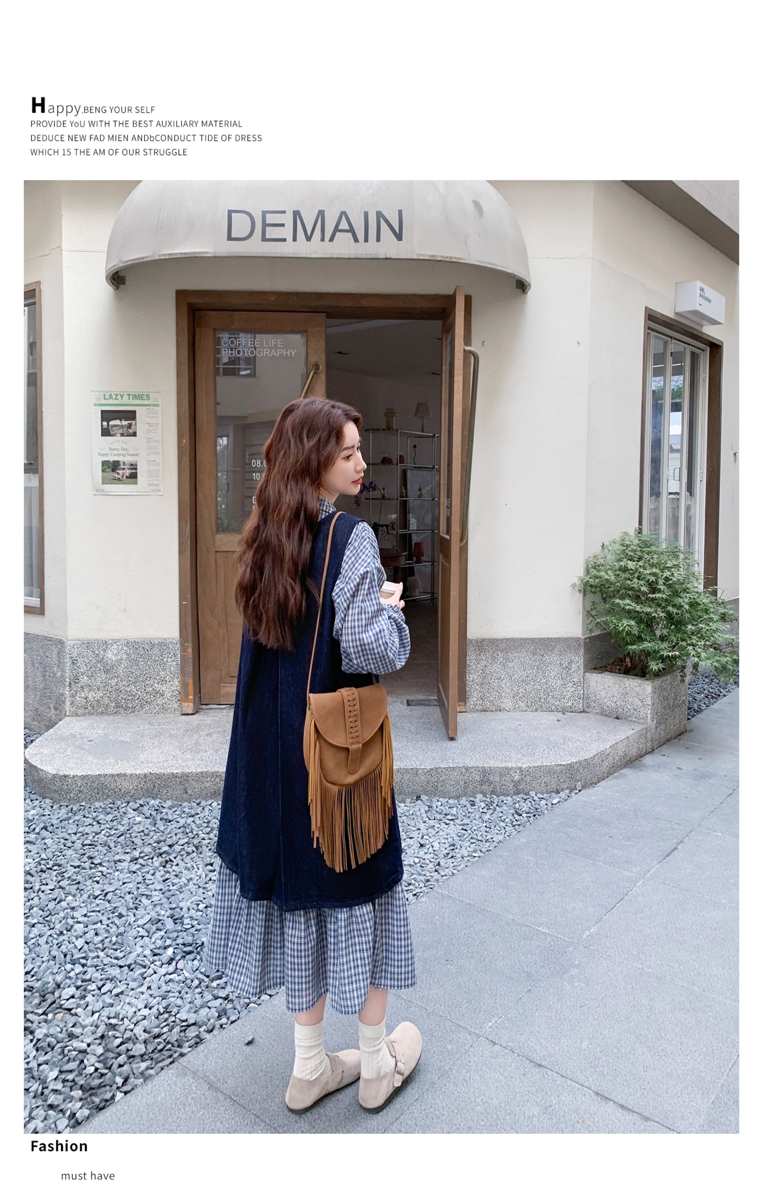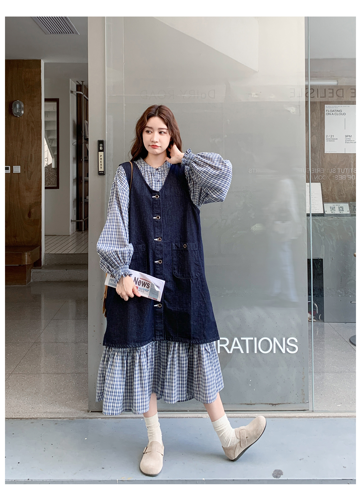 2点セット【セットアップ】韓国風 レトロ 学院スタイル デニム ジレワンピースセット レディース 2025年秋新作 チェック柄【SHシリーズ】