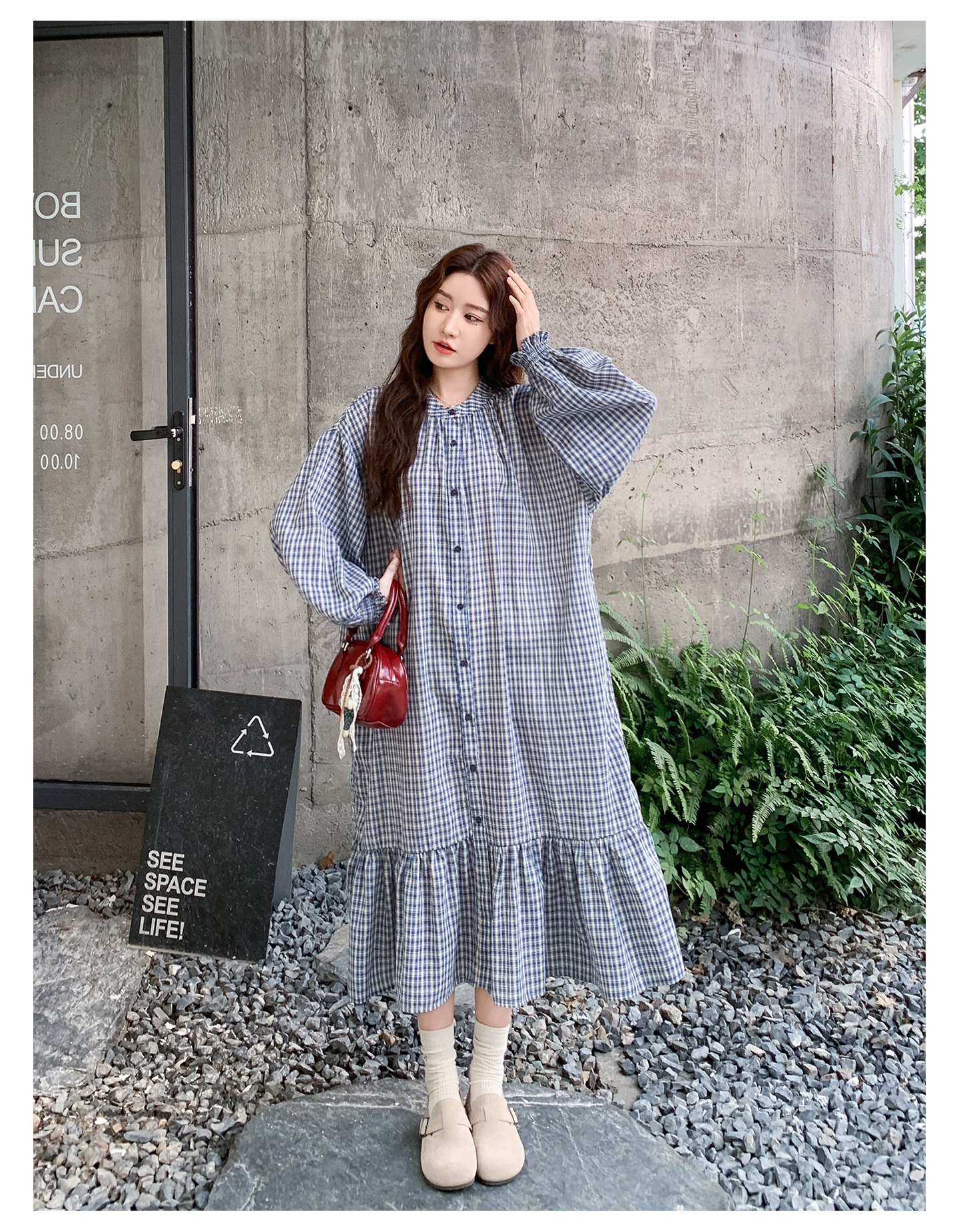 【ワンピース】起毛素材 チェック柄 レトロ クルーネック 長袖 ワンピース 【JZシリーズ】