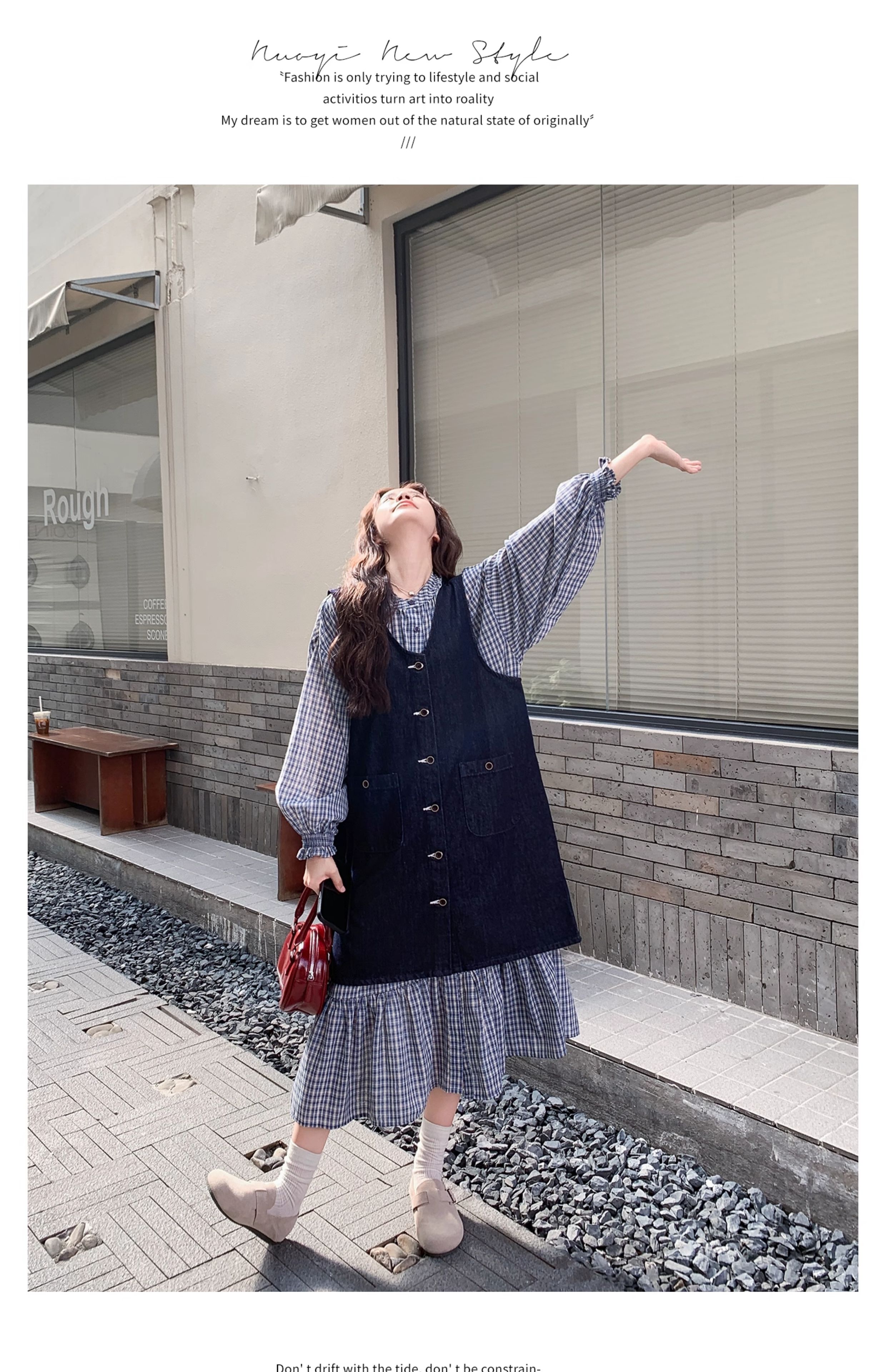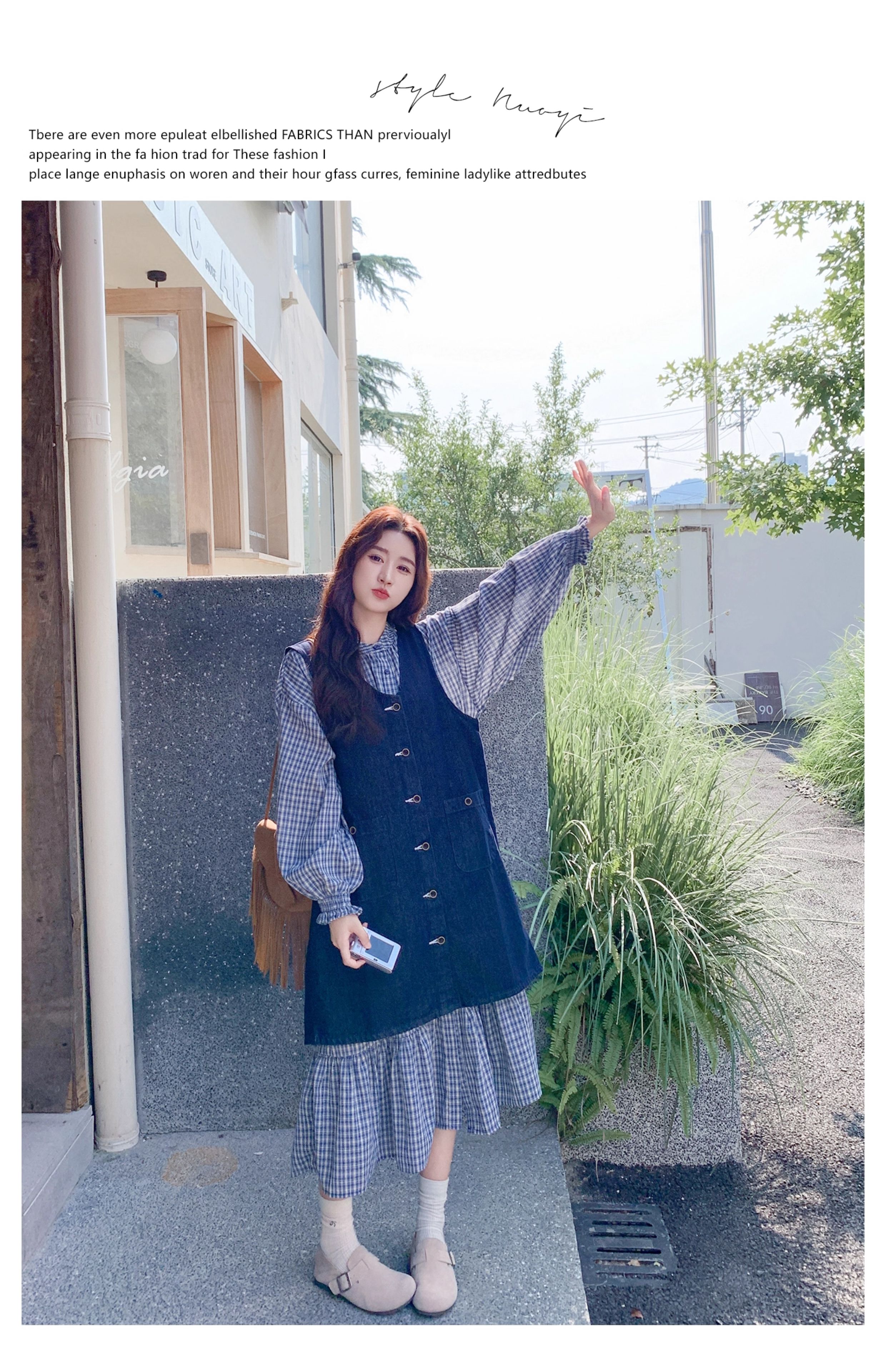 【商品名】2点セット【セットアップ】韓国風 レトロ 学院スタイル デニム ジレワンピースセット レディース 2025年秋新作 チェック柄【SHシリーズ】