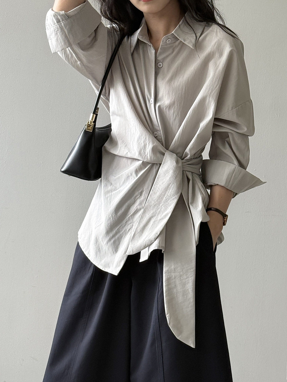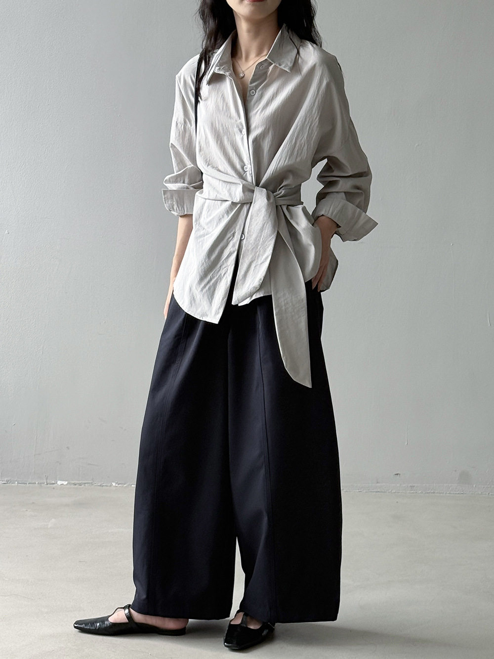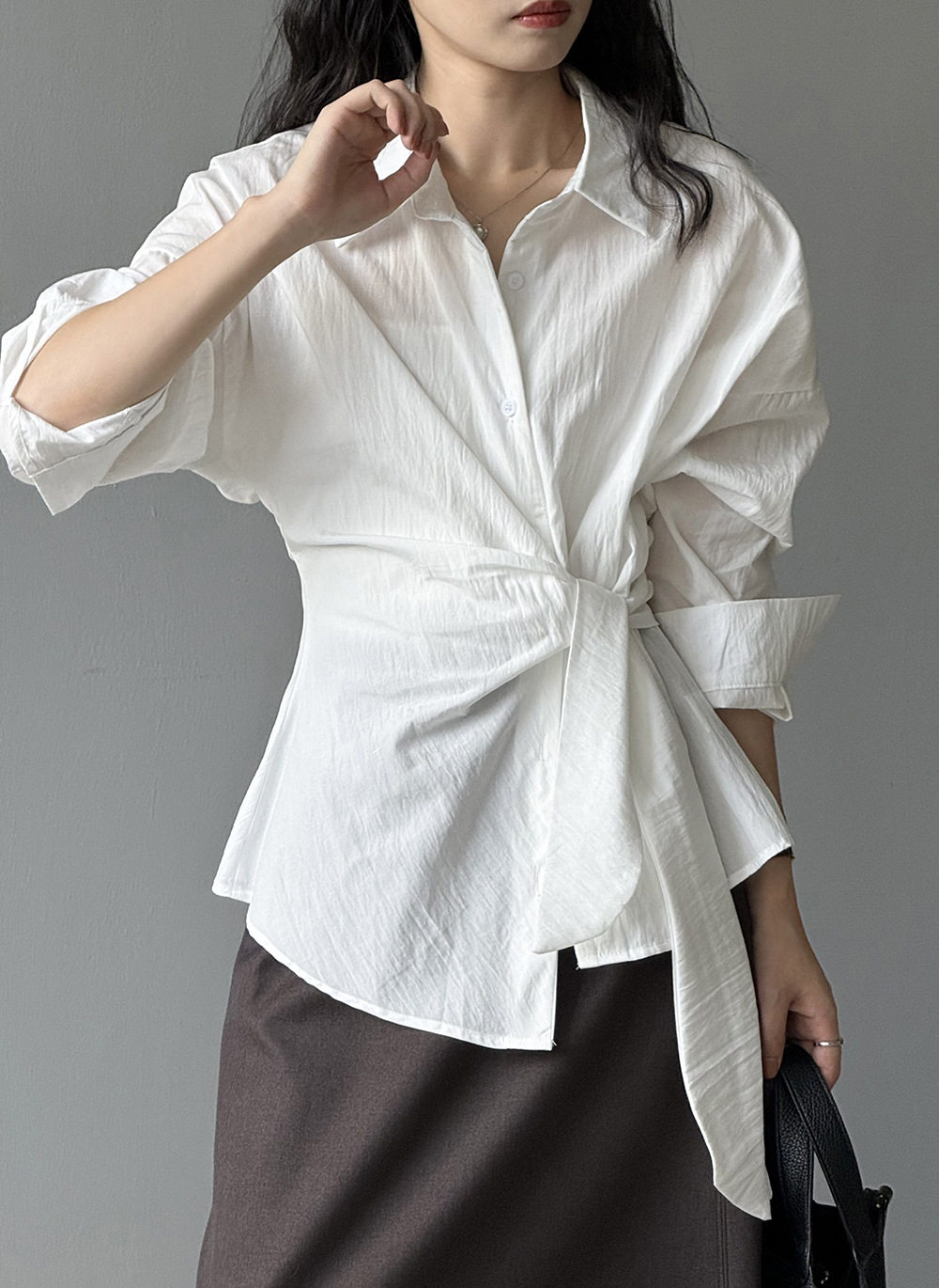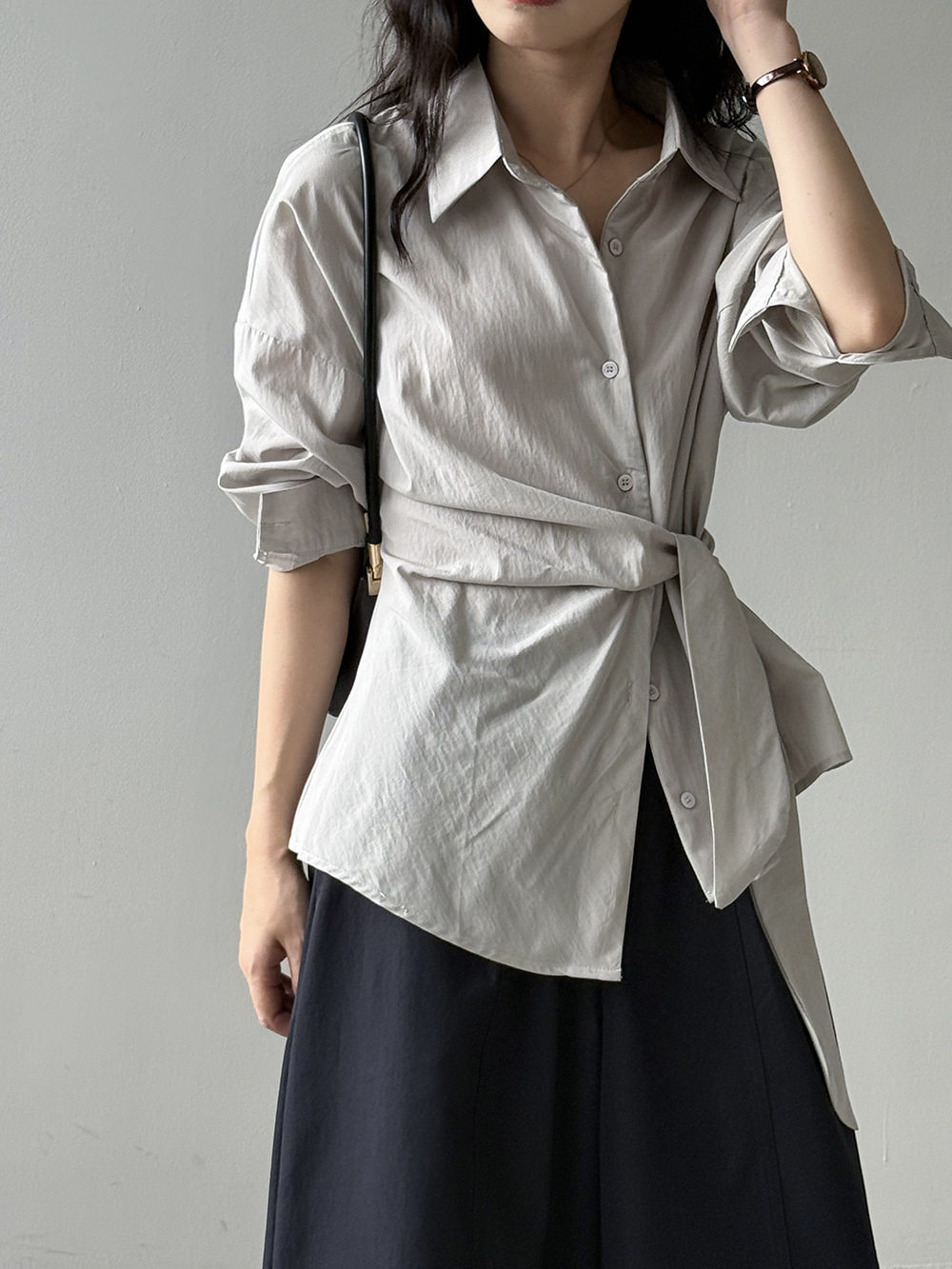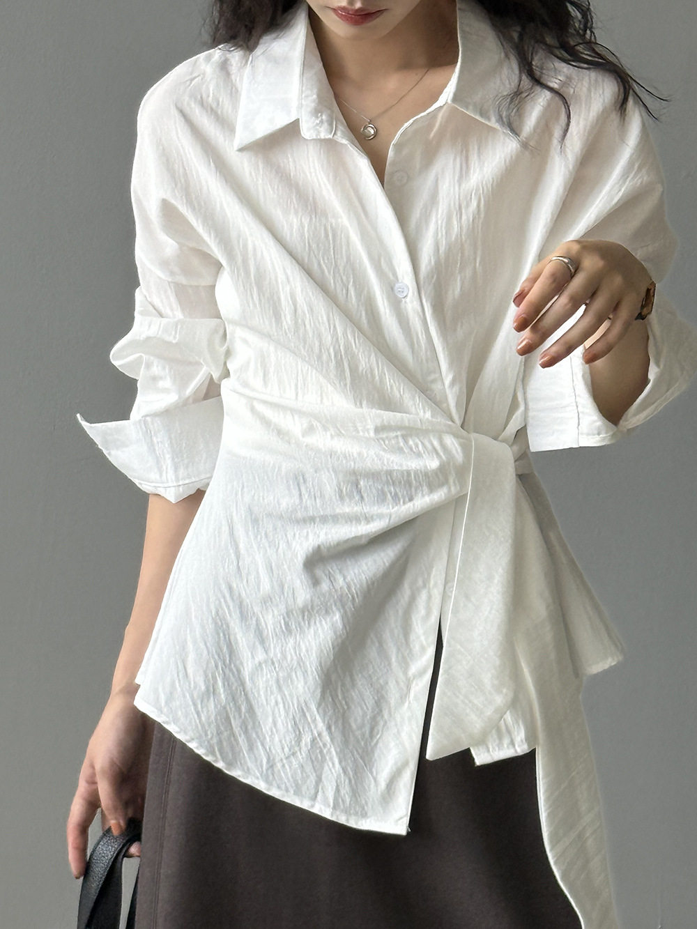 【商品名】【トップス】テンセルコットン ウエストリボン シャツ レディース 秋新作 開襟シングルボタン ゆったり細見え シャツ【JZシリーズ】