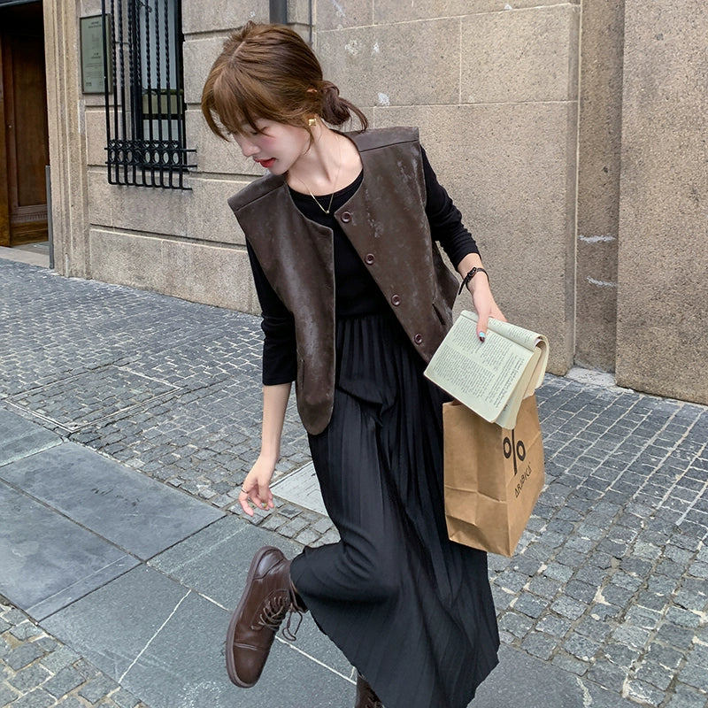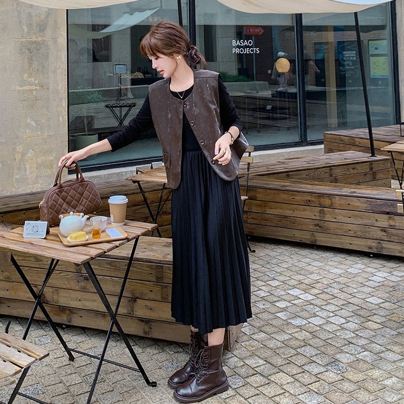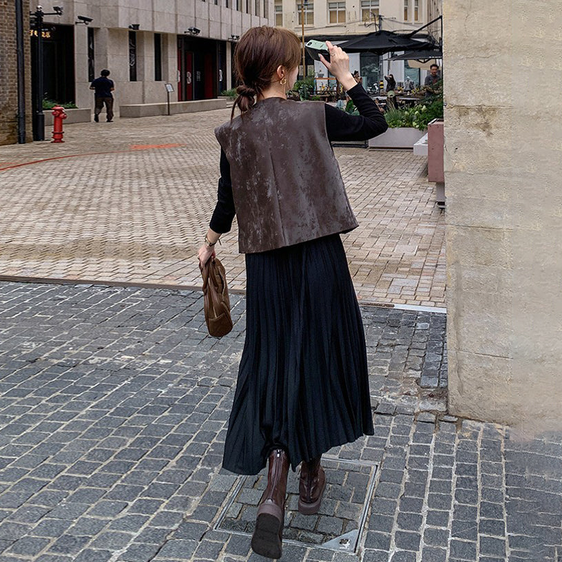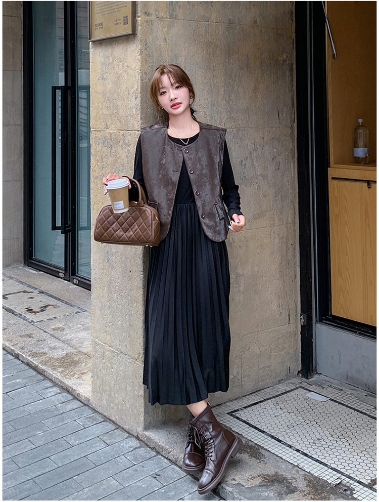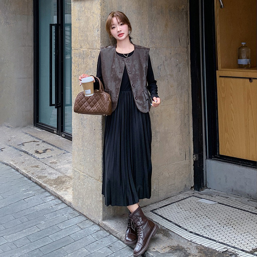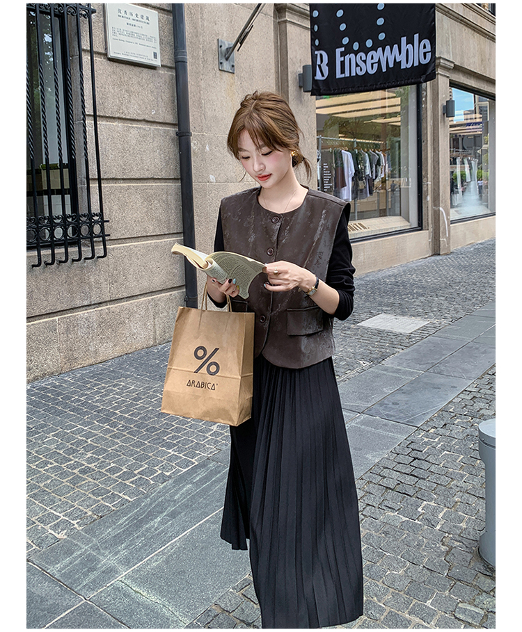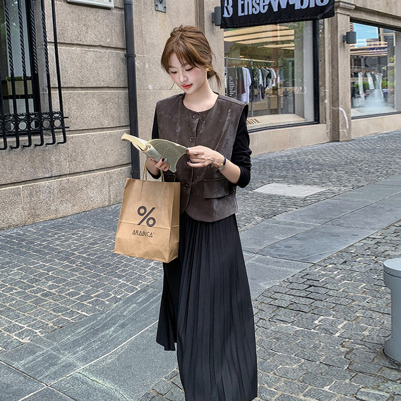 2点セット!【セットアップ】フレンチデザイン プリーツワンピース+ベスト セット 秋新作 大人カジュアル ファッションコーデ【JZシリーズ】