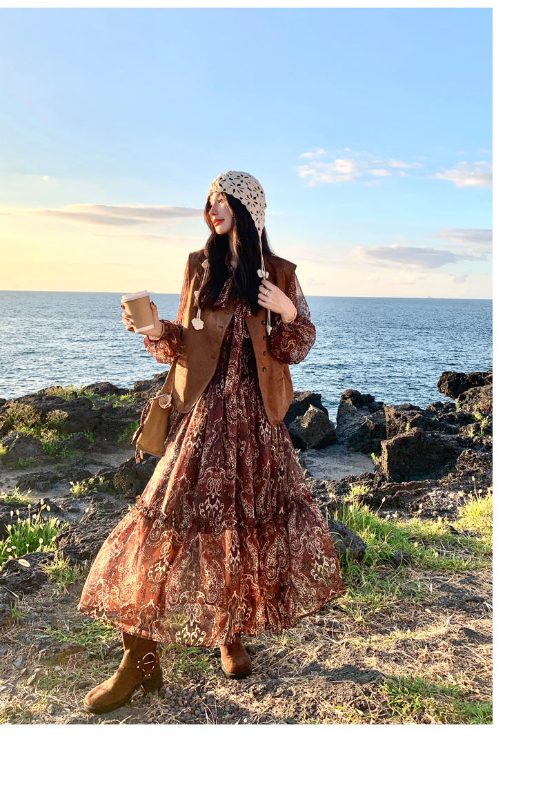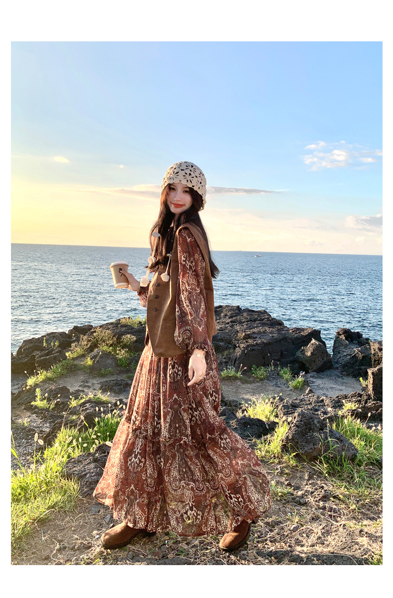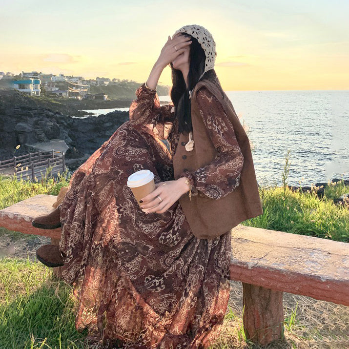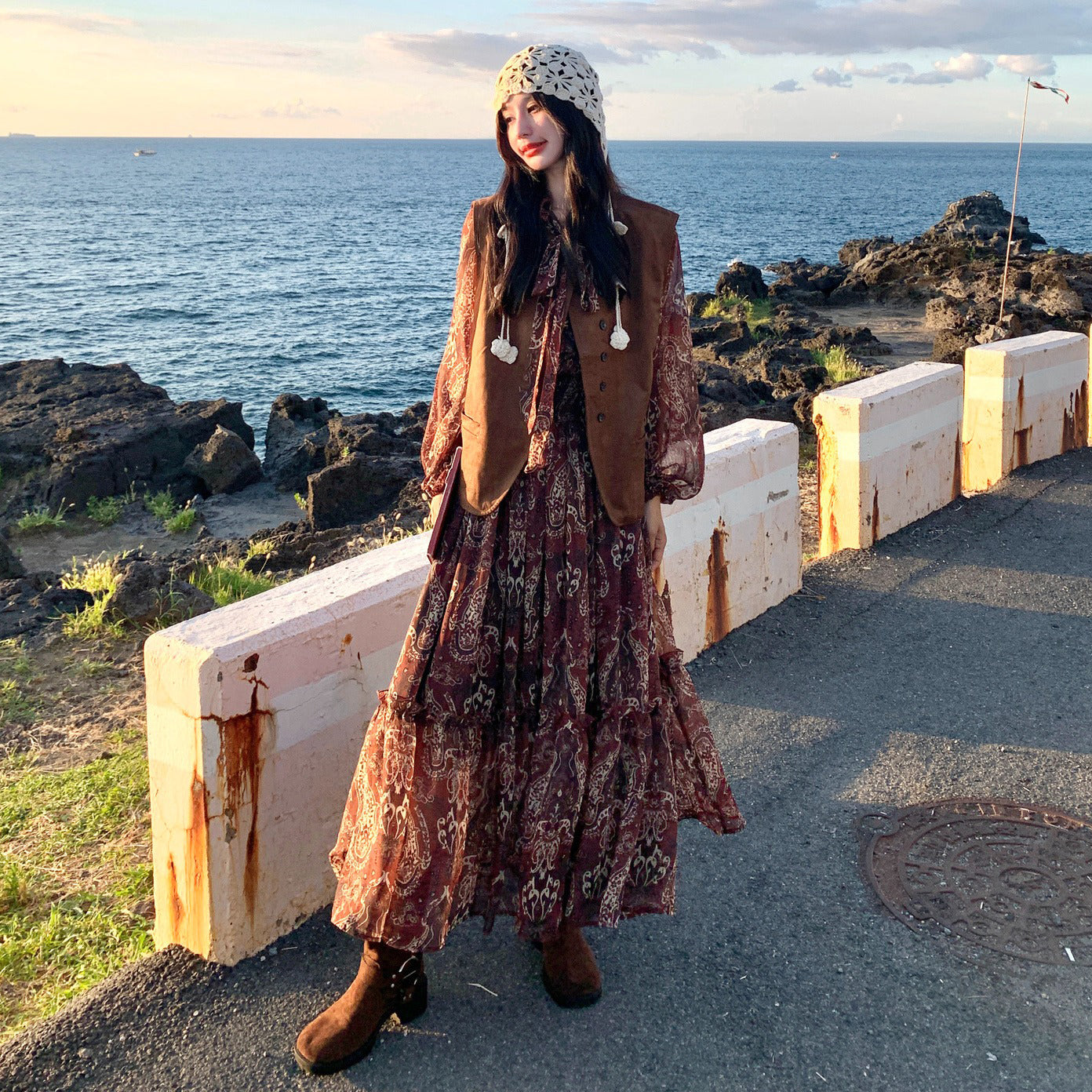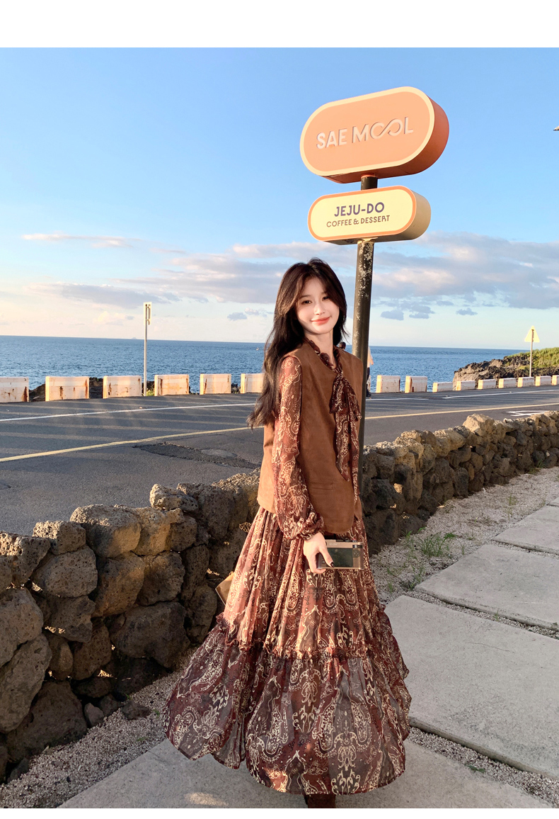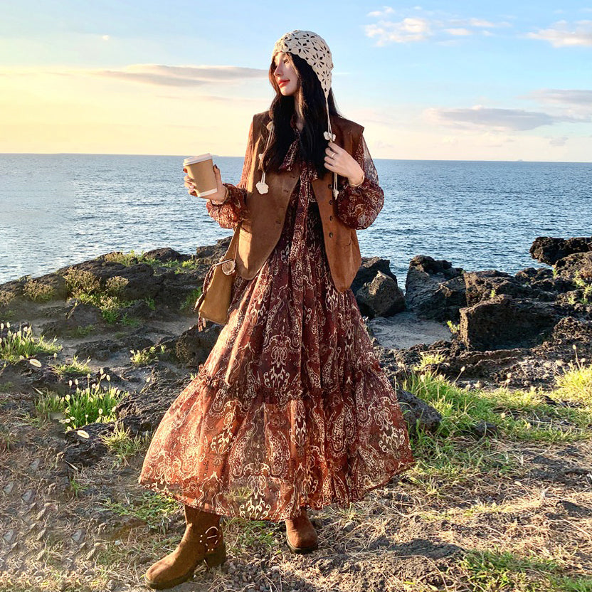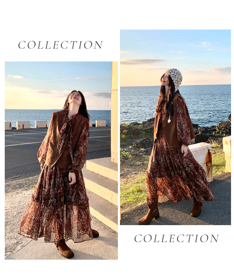 【商品名】【ワンピース】ブラウン 花柄 長袖ワンピース ベスト付きセット レディース 2025秋新作 旅行 リゾート【SHシリーズ】
