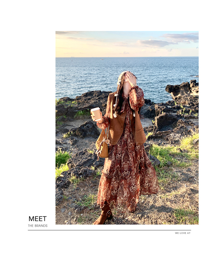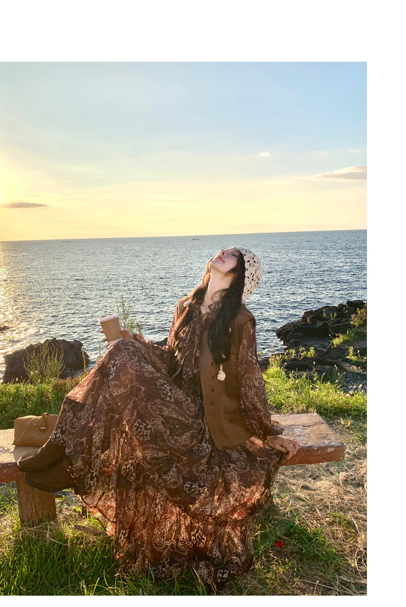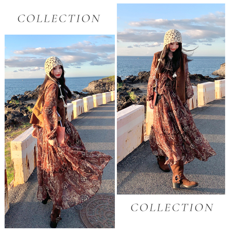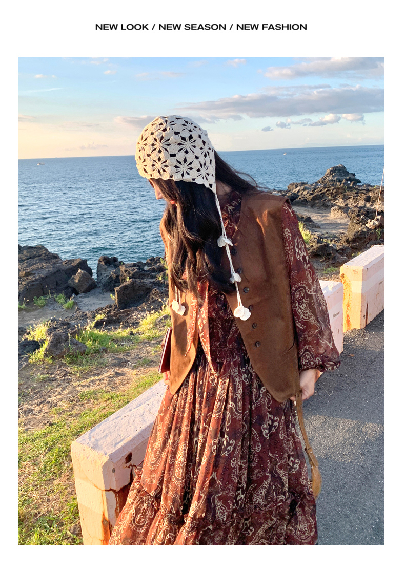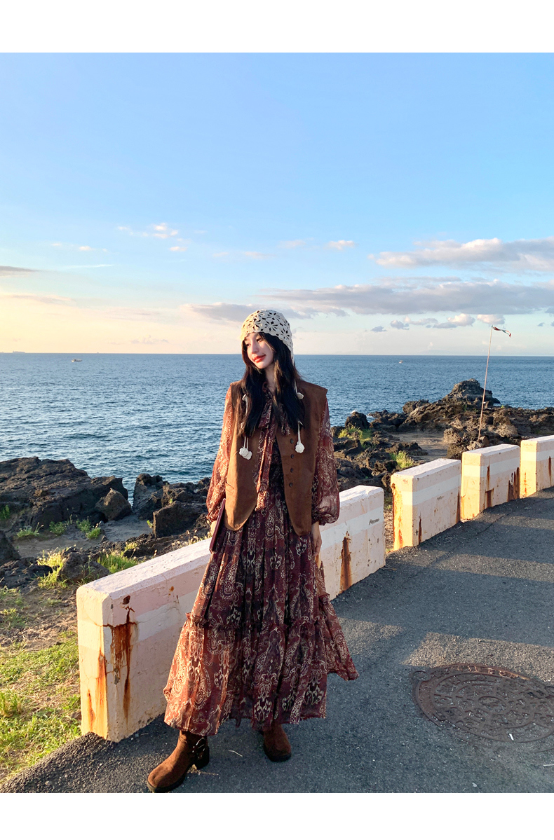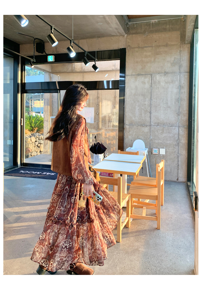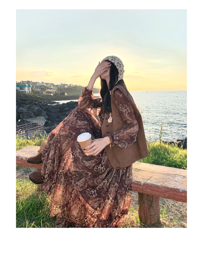【商品名】【ワンピース】ブラウン 花柄 長袖ワンピース ベスト付きセット レディース 2025秋新作 旅行 リゾート【SHシリーズ】