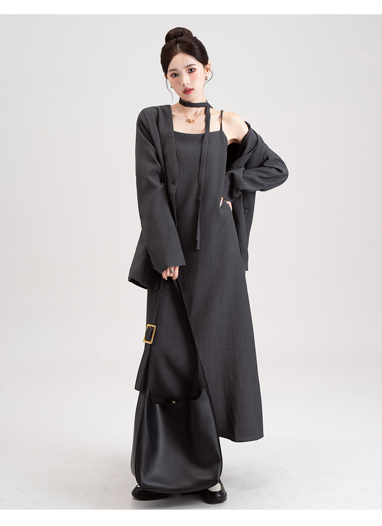 【セットアップ】韓国風 大人女子感 ジャケット+キャミワンピース セット レディース ウエストベルト付き【シリーズ】