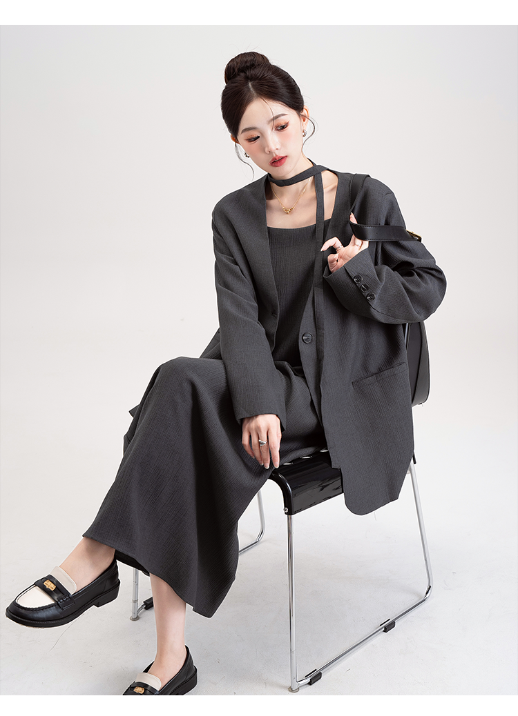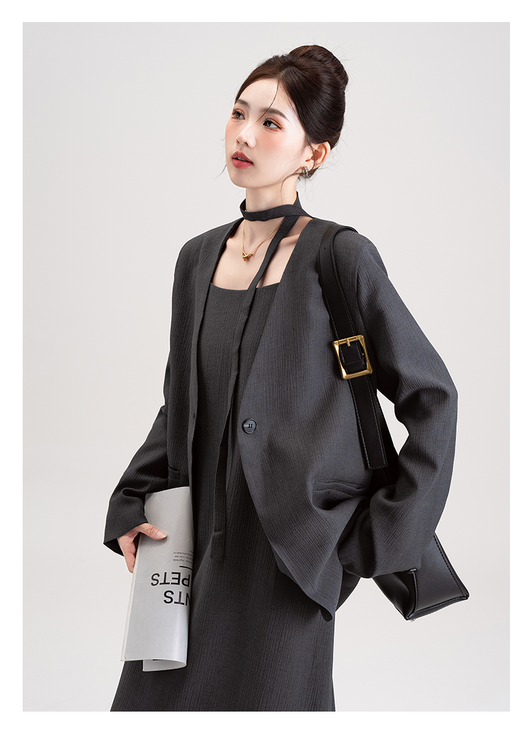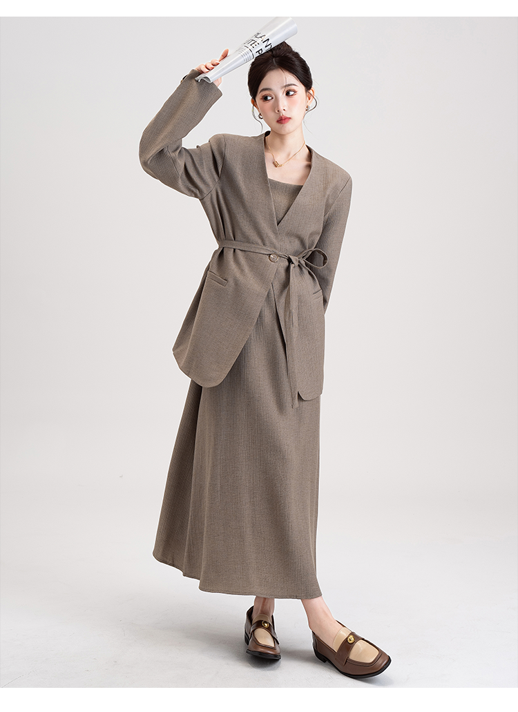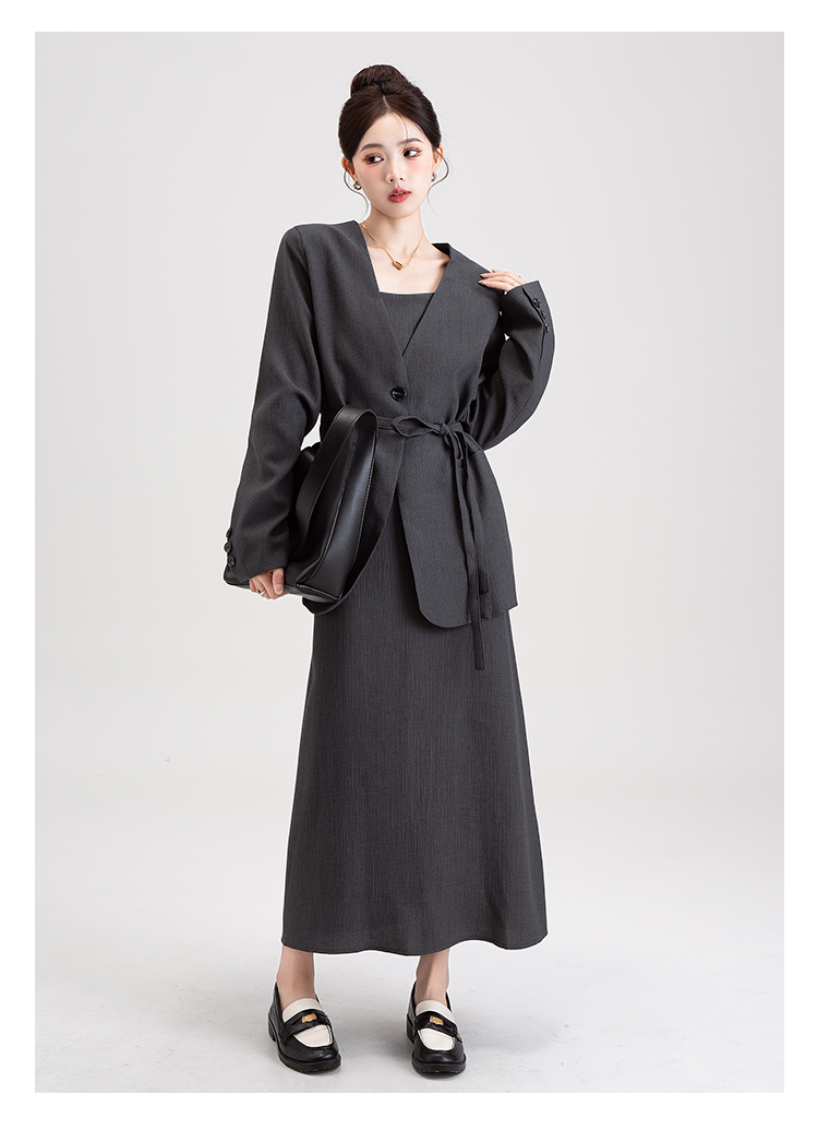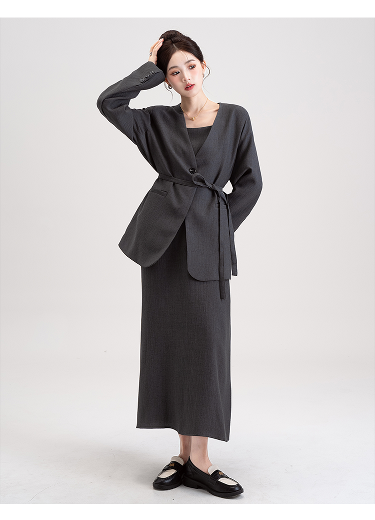【商品名】【セットアップ】韓国風 大人女子感 ジャケット+キャミワンピース セット レディース ウエストベルト付き【シリーズ】