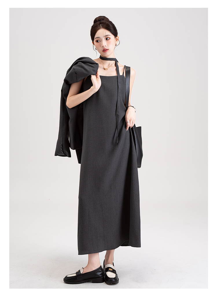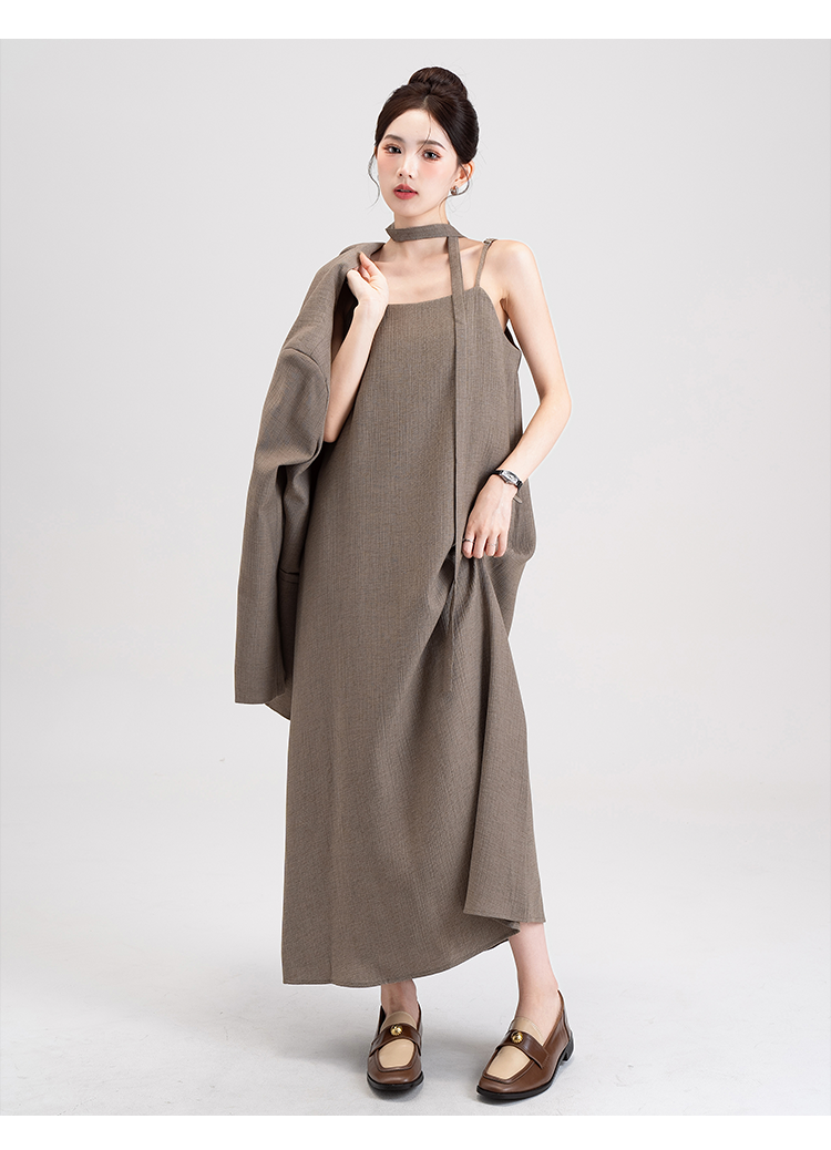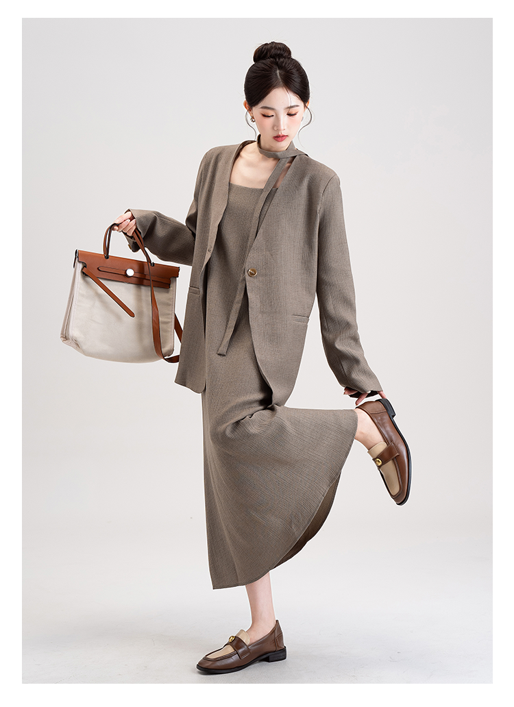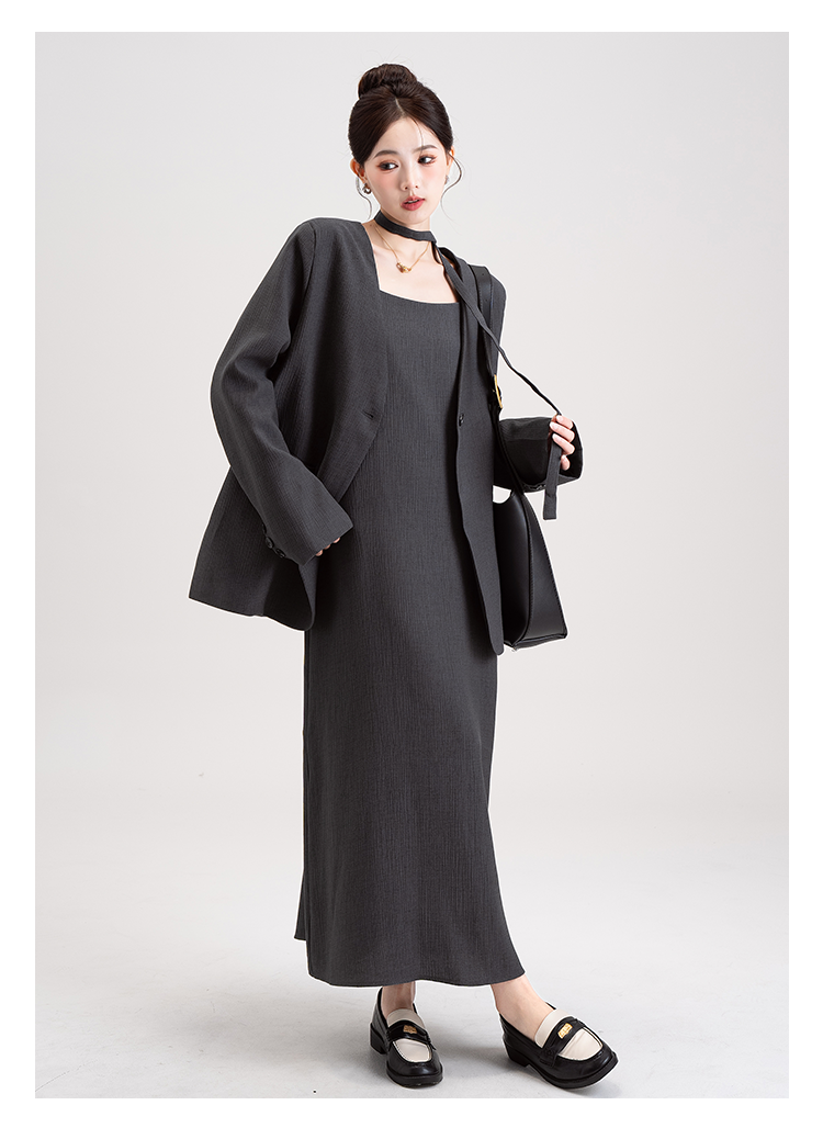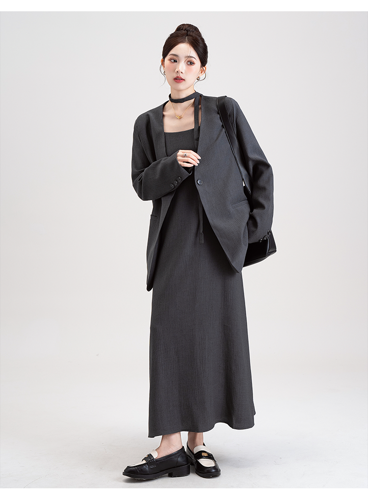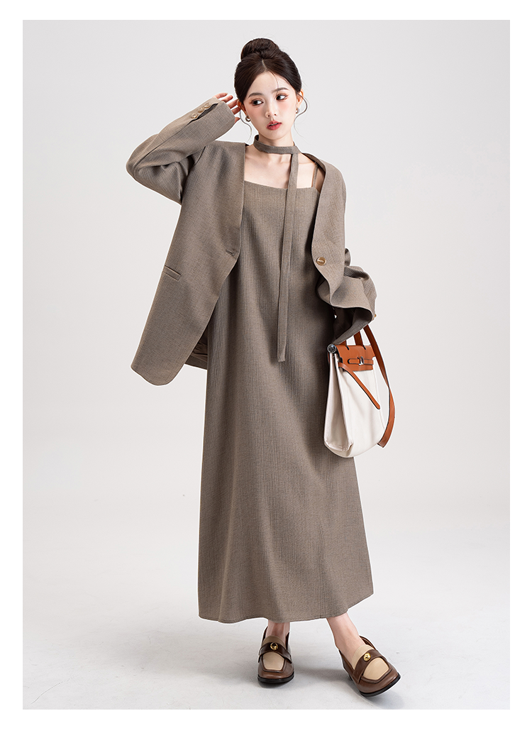 【商品名】【セットアップ】韓国風 大人女子感 ジャケット+キャミワンピース セット レディース ウエストベルト付き【シリーズ】