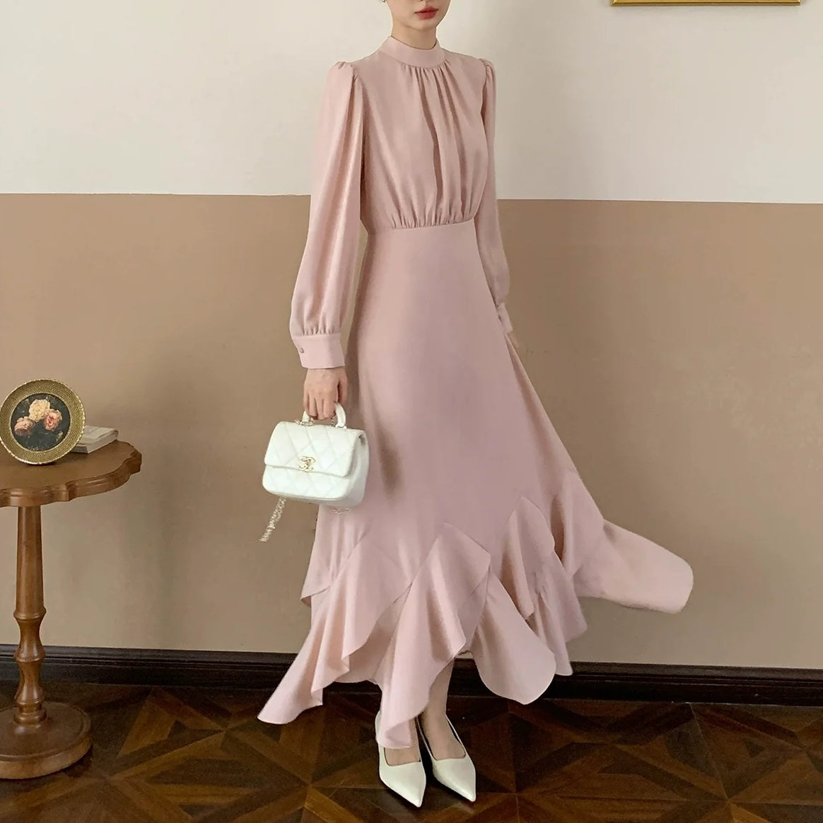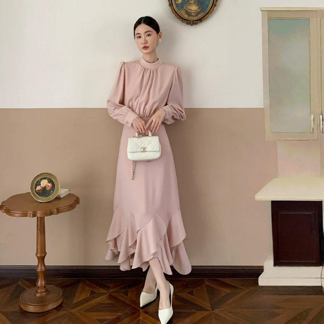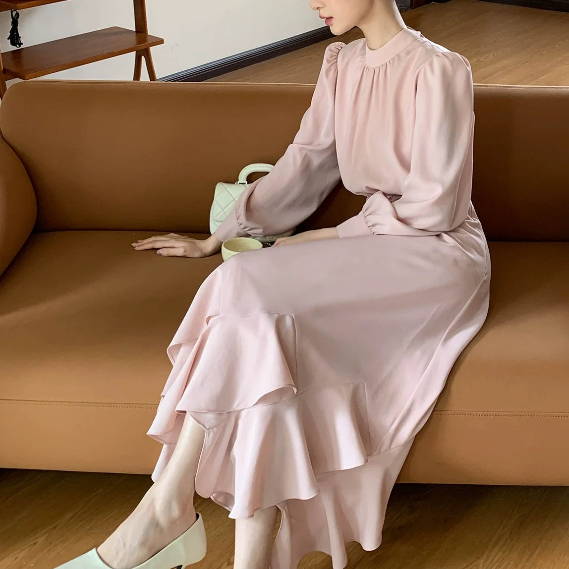 【商品名】【ワンピース】春 秋 冬 花柄裾デザイン 通勤コーデ 立体裁断切り替え 長袖 ワンピース 【JZシリーズ】