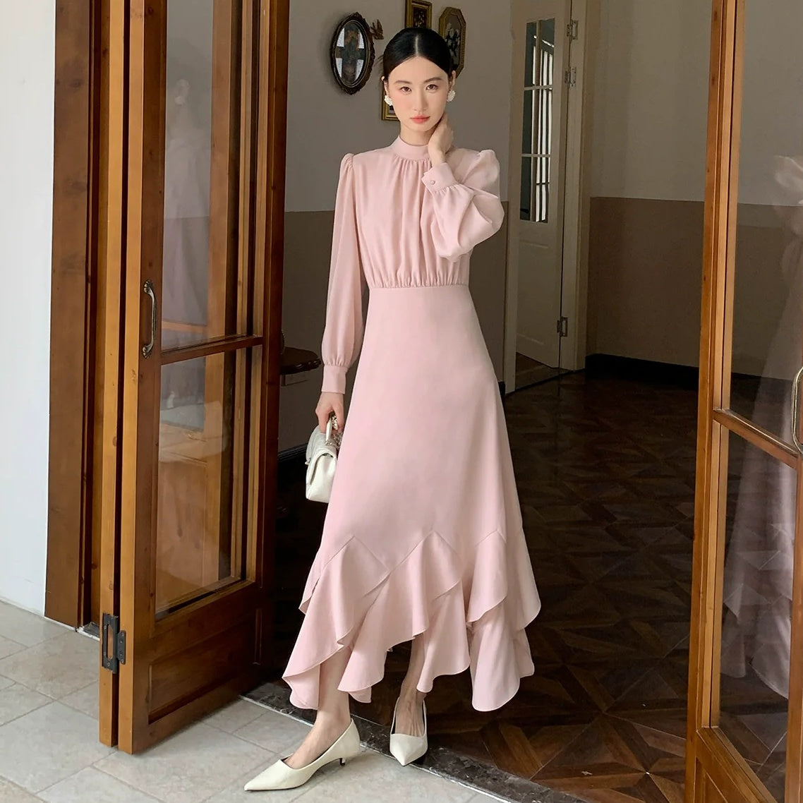 【ワンピース】春 秋 冬 花柄裾デザイン 通勤コーデ 立体裁断切り替え 長袖 ワンピース 【JZシリーズ】