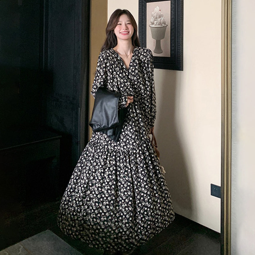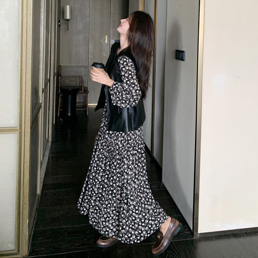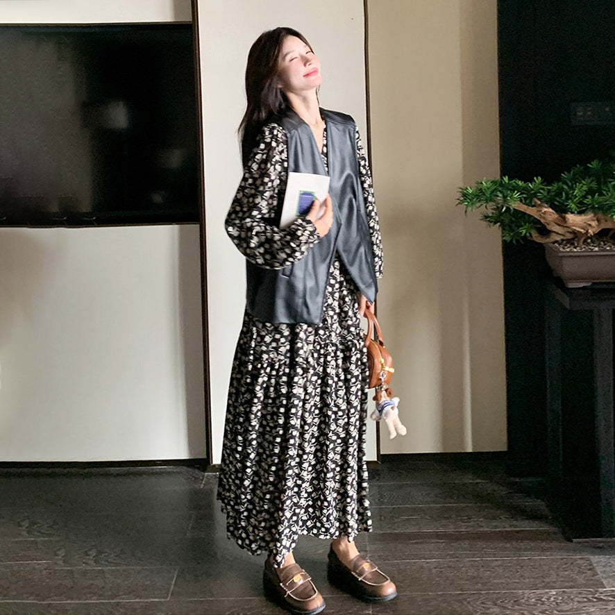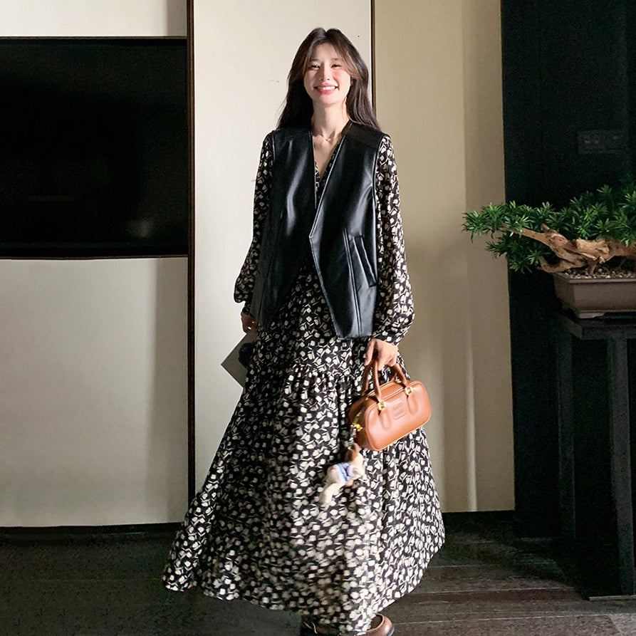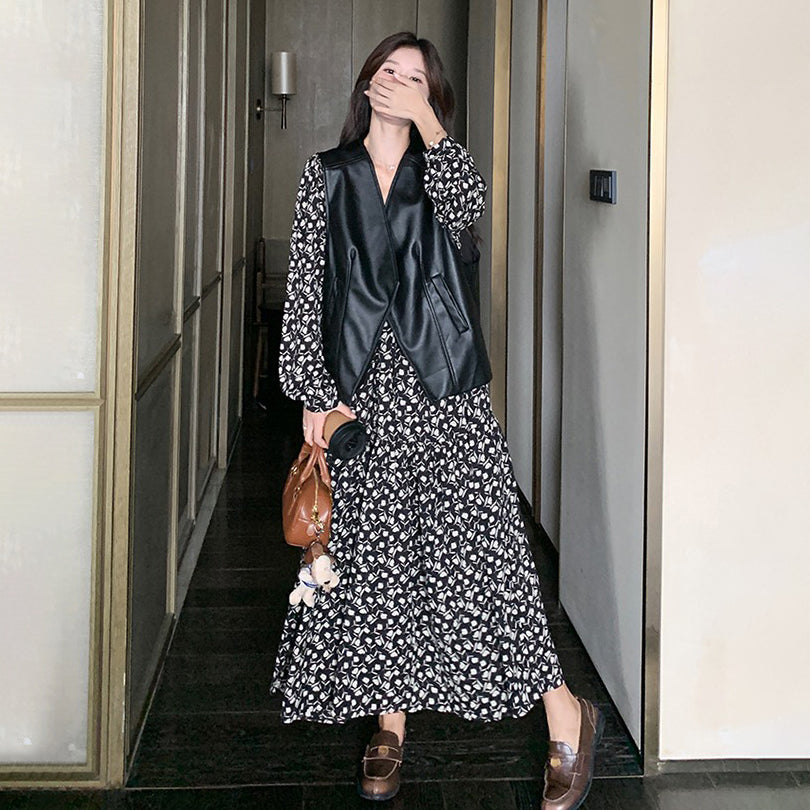 2点セット【セットアップ】PUレザーベスト+ 花柄 長袖ワンピース 2点セット レディース 春秋 高級感 韓国風 コーディネート おしゃれ【SHシリーズ】