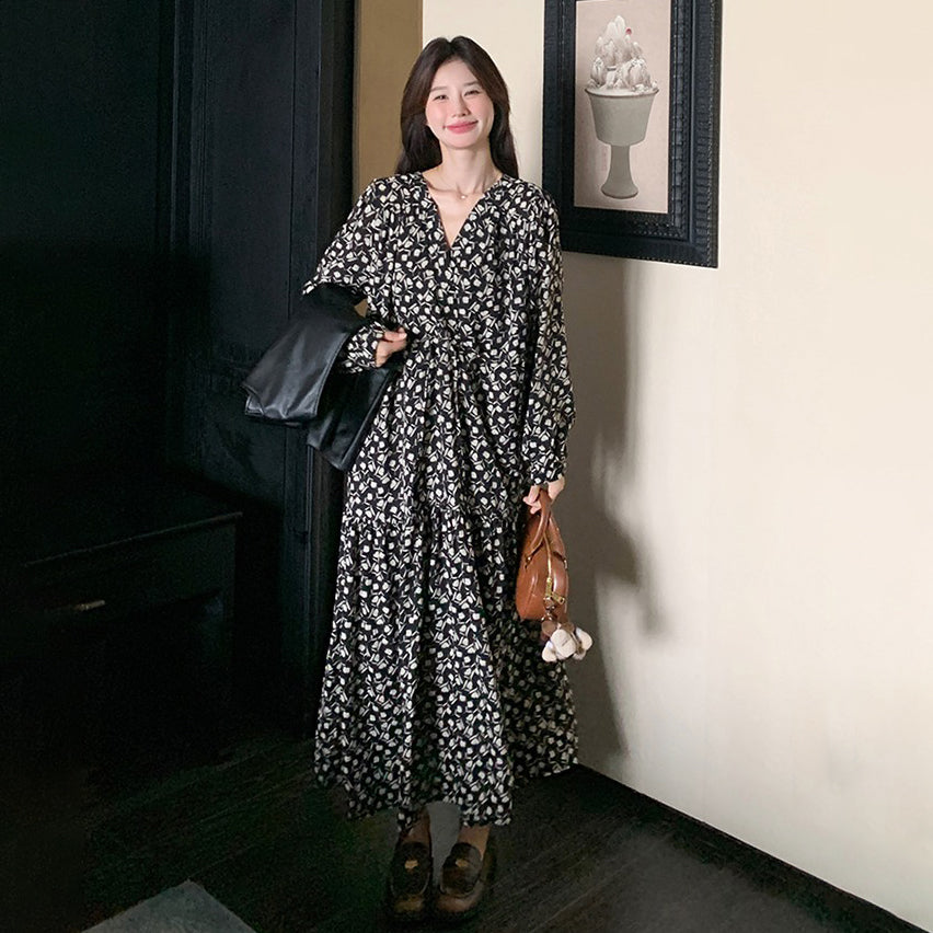 【ワンピース】細見え 日系 Vネック 無地 長袖ワンピース 切替デザイン ゆったり 気質ロング【JZシリーズ】【AHシリーズ】
