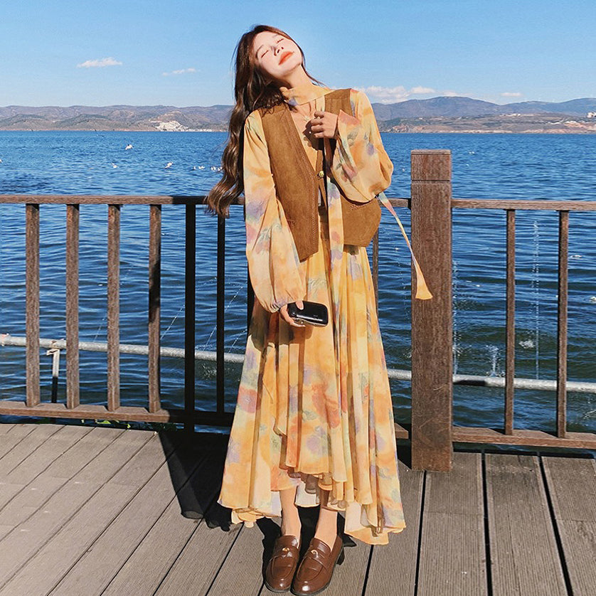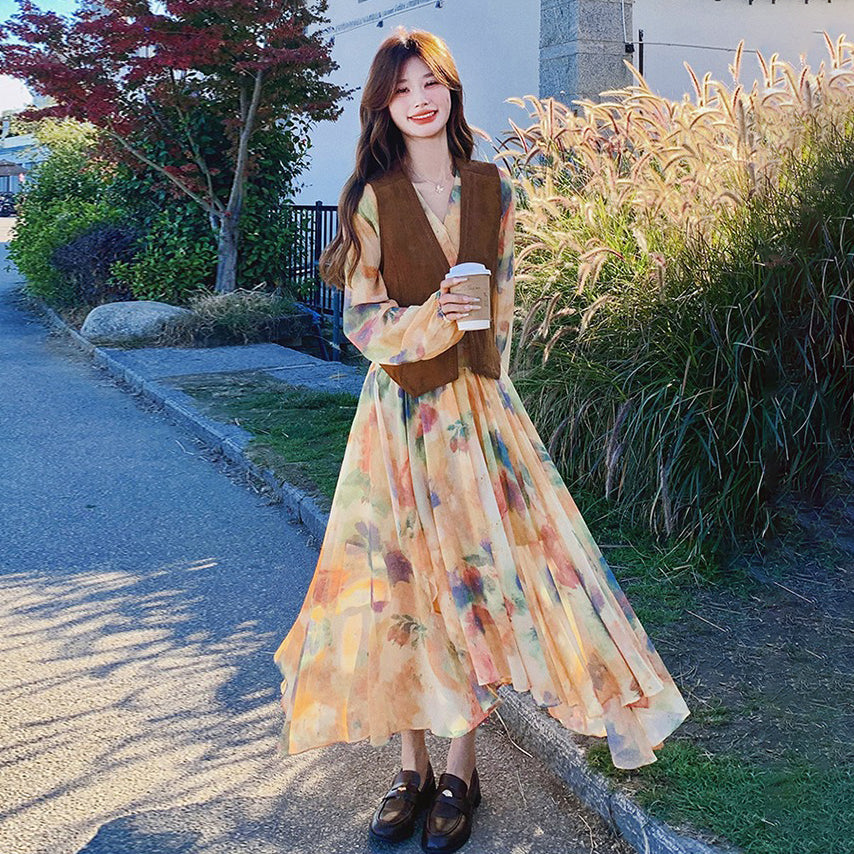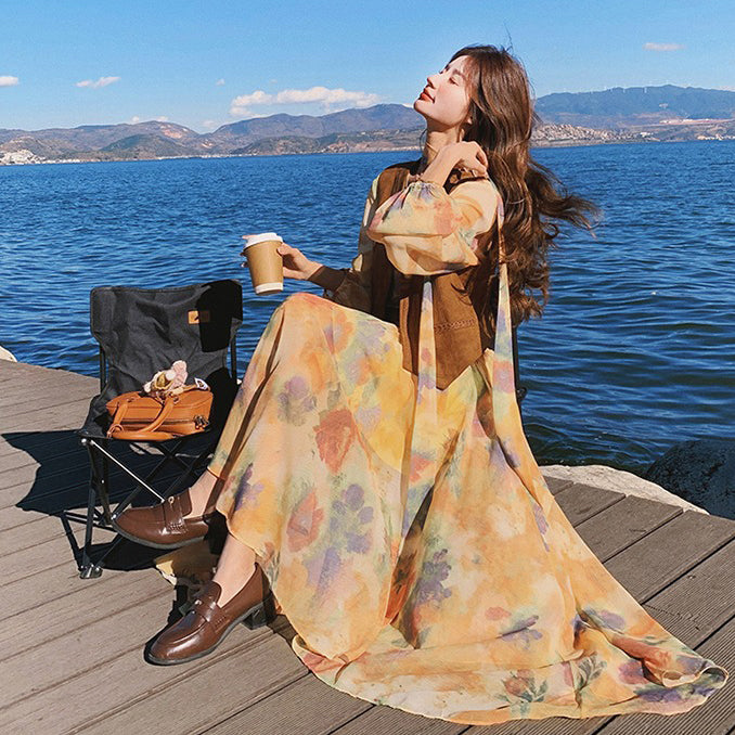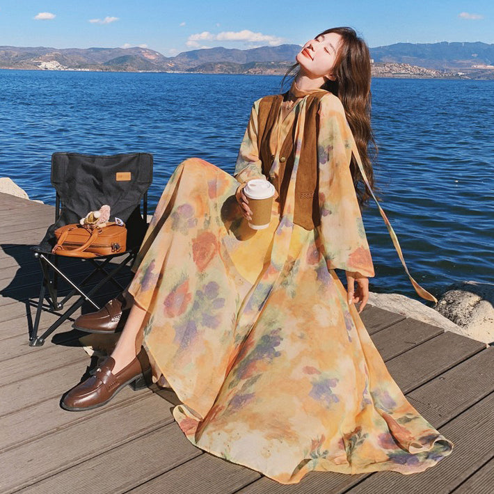 【セットアップ】ベスト付き 花柄フレア 長袖ワンピース セット 春秋 海辺リゾート 高級感【SHシリーズ】