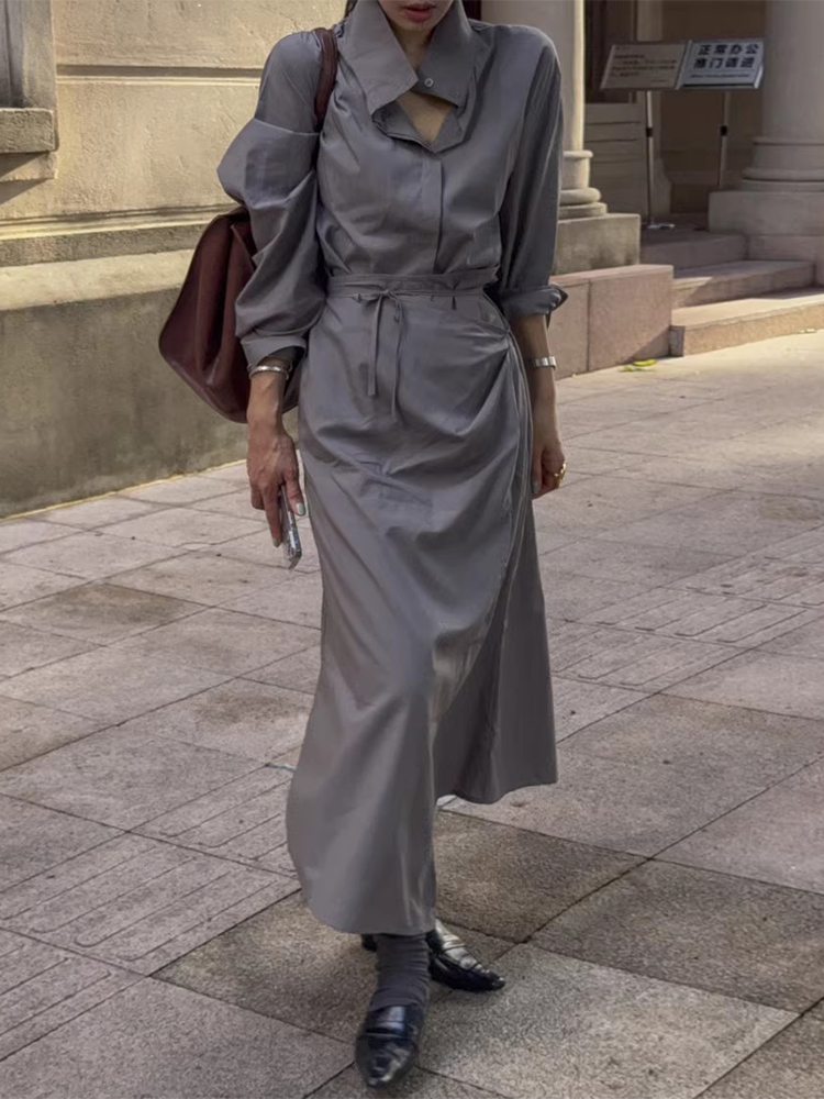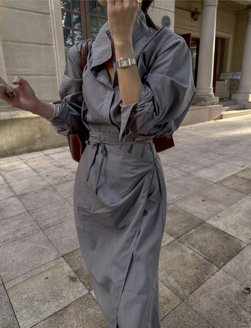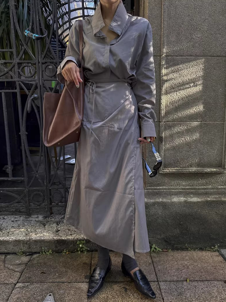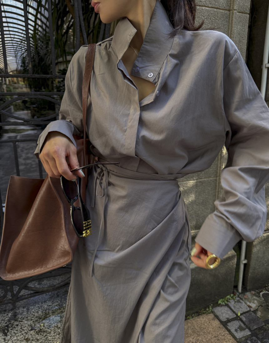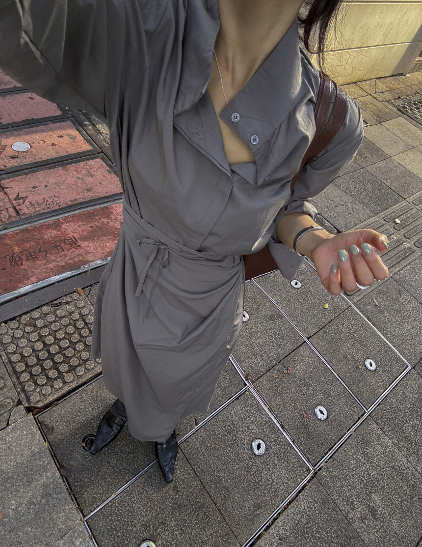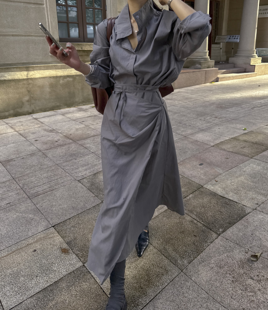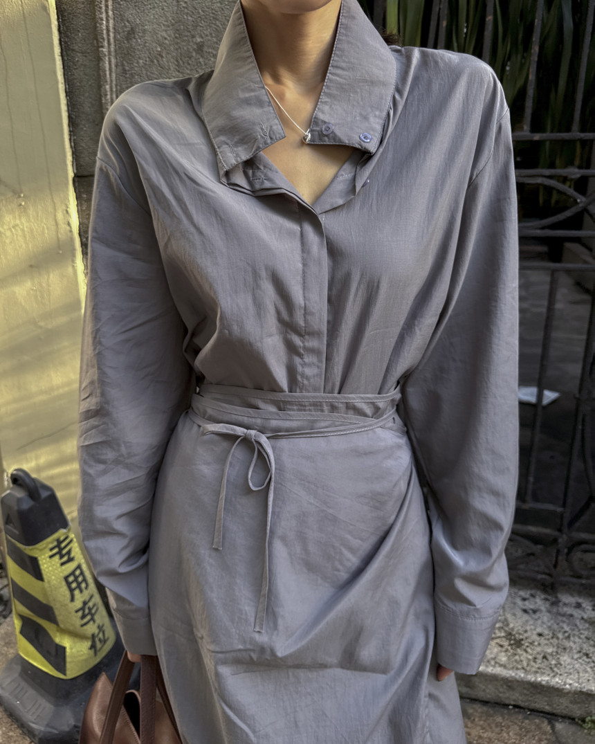 【商品名】【ワンピース】春 秋 冬 アシンメトリー ウエストリボン 長袖シャツ ワンピース 【JZシリーズ】