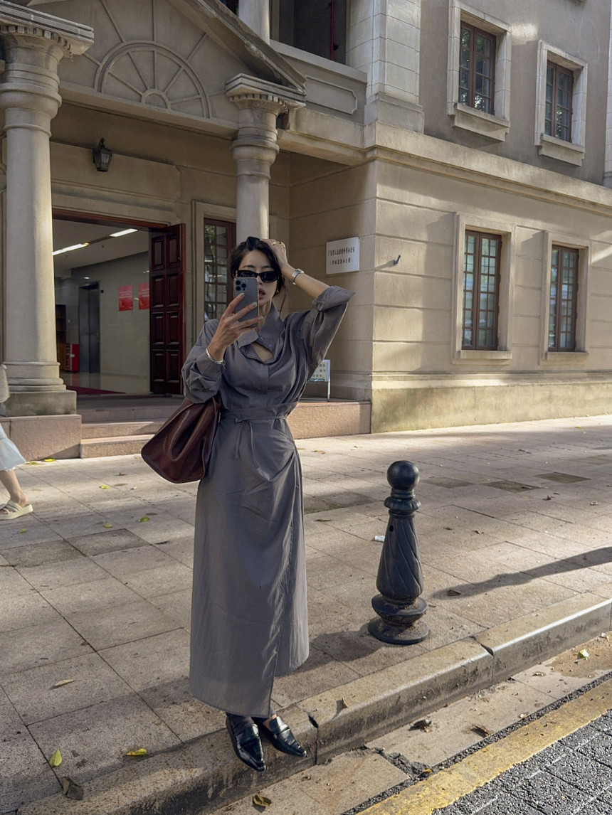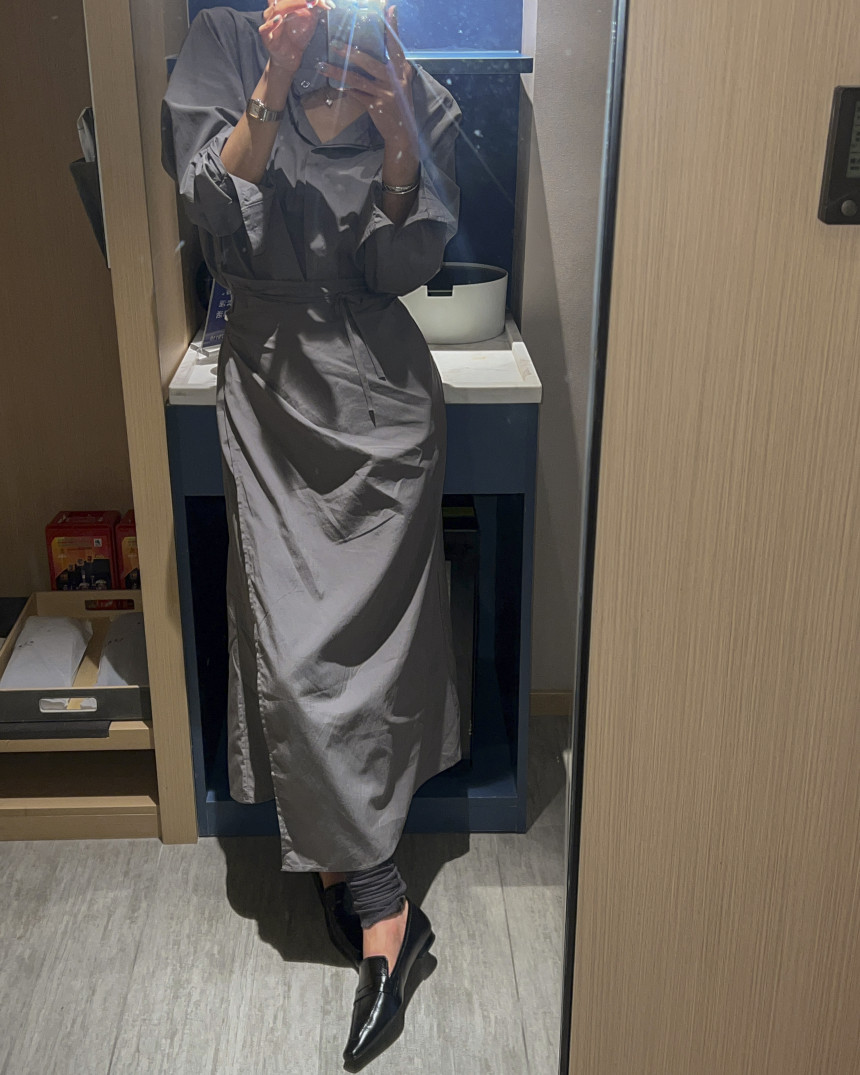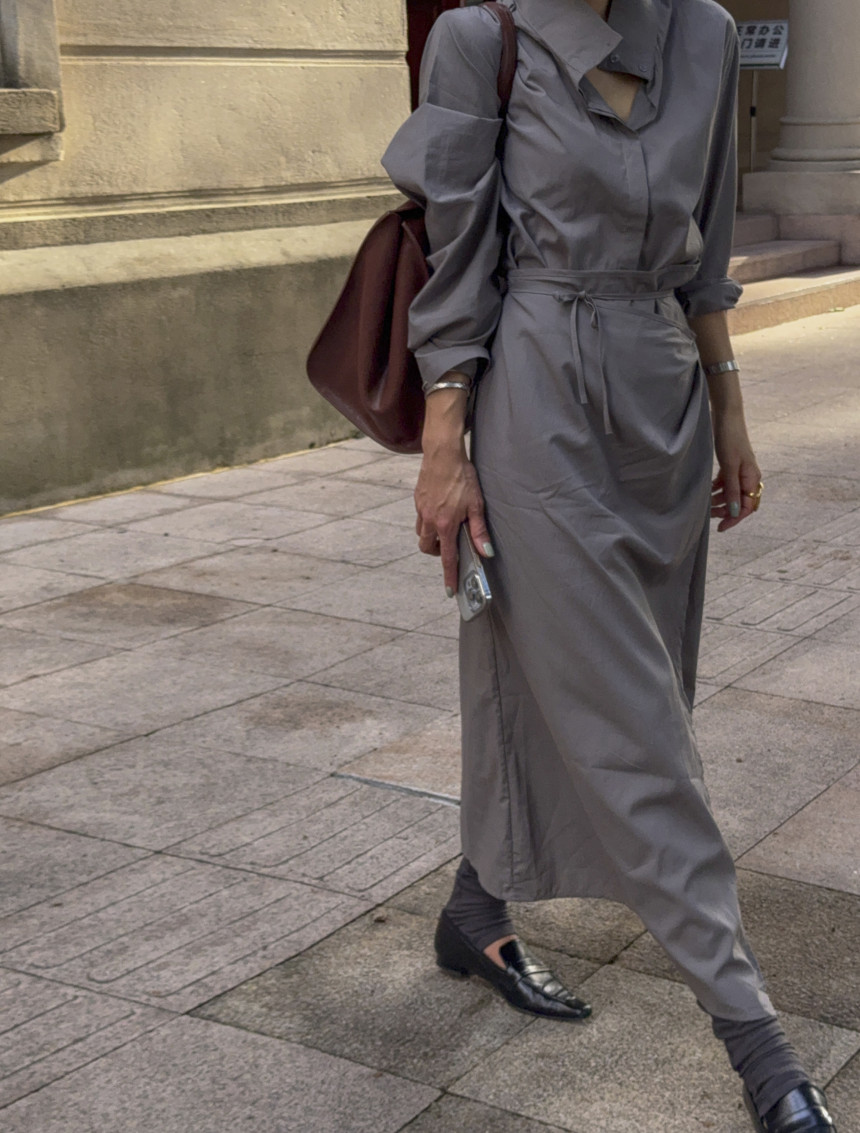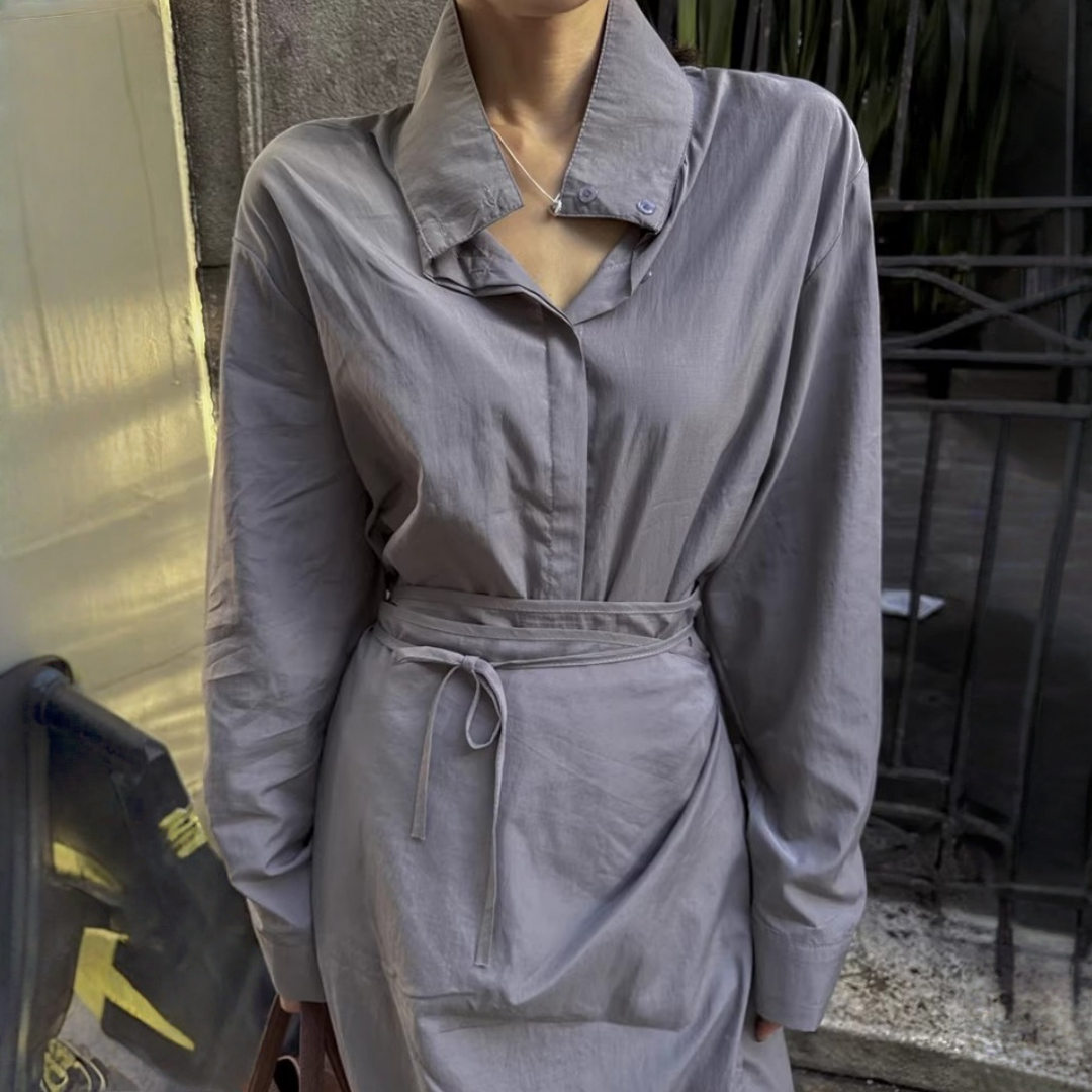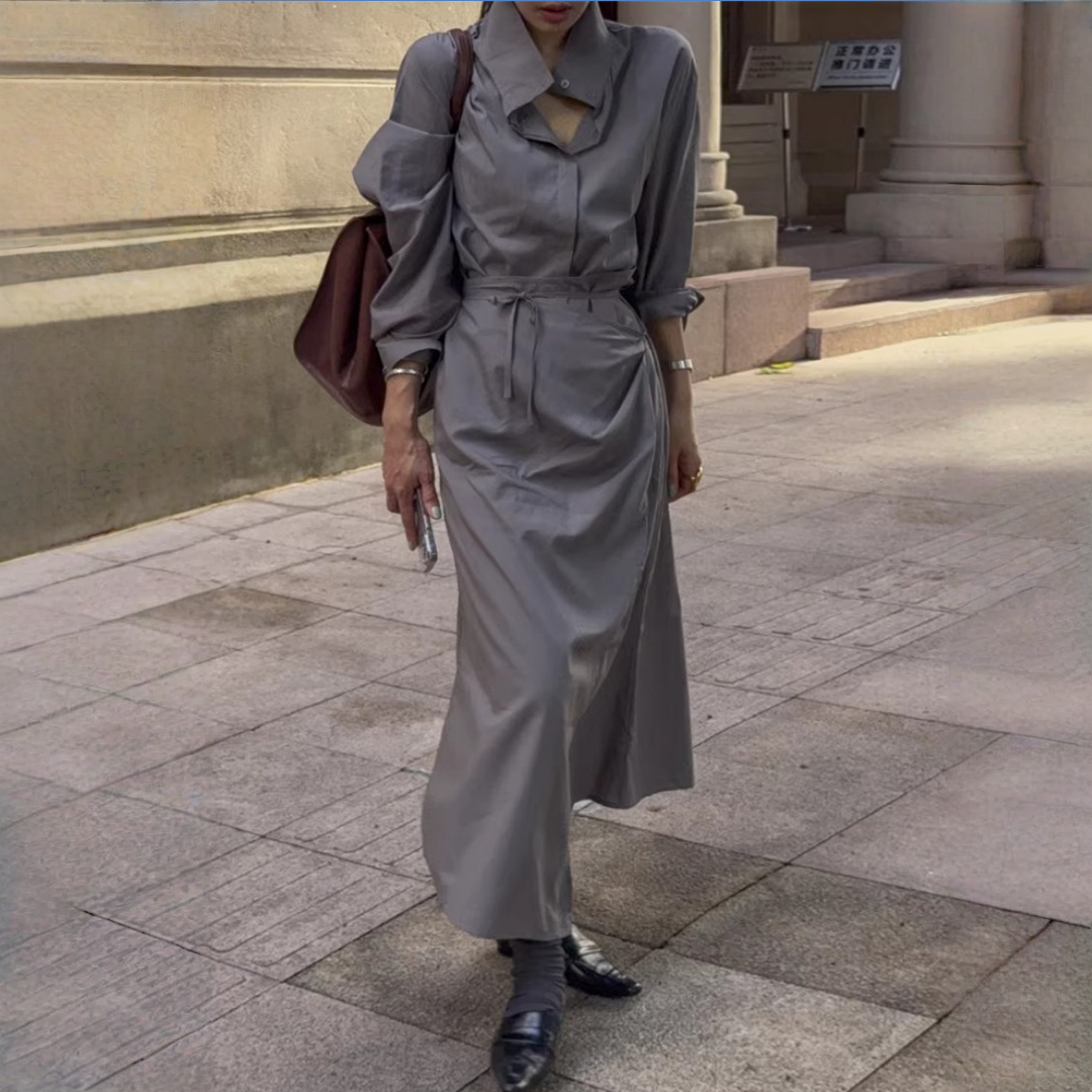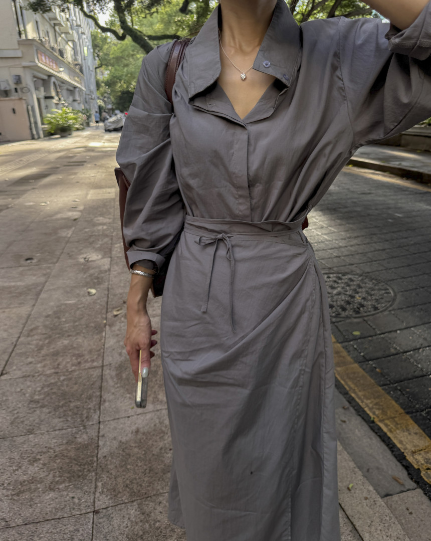 【商品名】【ワンピース】春 秋 冬 アシンメトリー ウエストリボン 長袖シャツ ワンピース 【JZシリーズ】