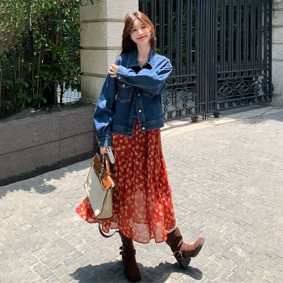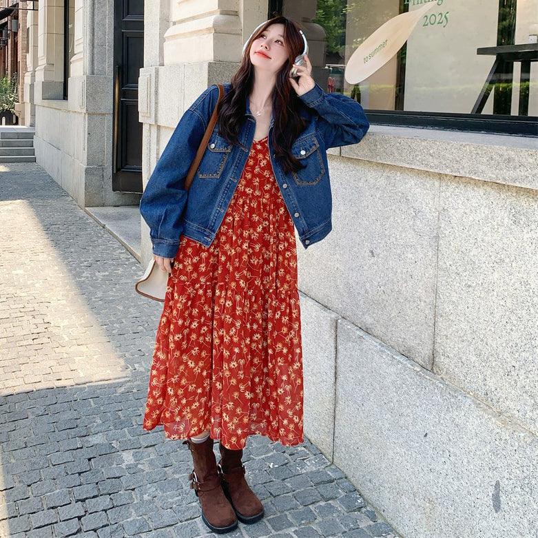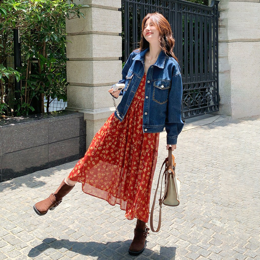 【セットアップ 】超可愛い レトロデニムジャケット+花柄キャミワンピース レディース おしゃれ 人気ノースリーブワンピース【SHシリーズ】
