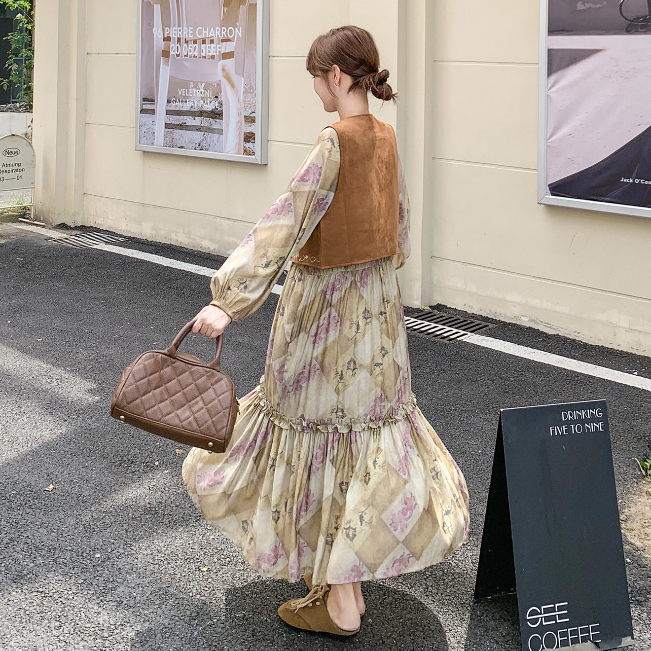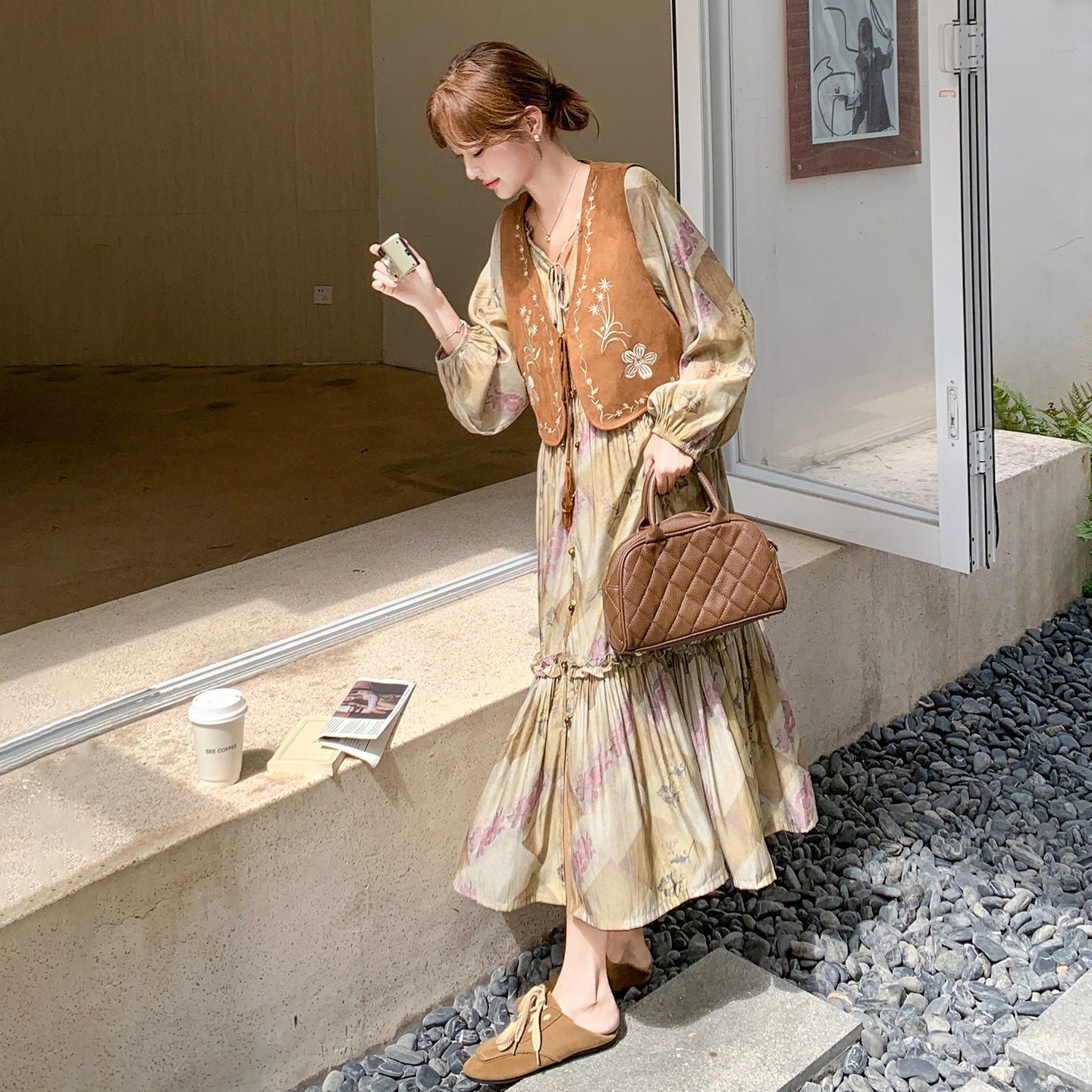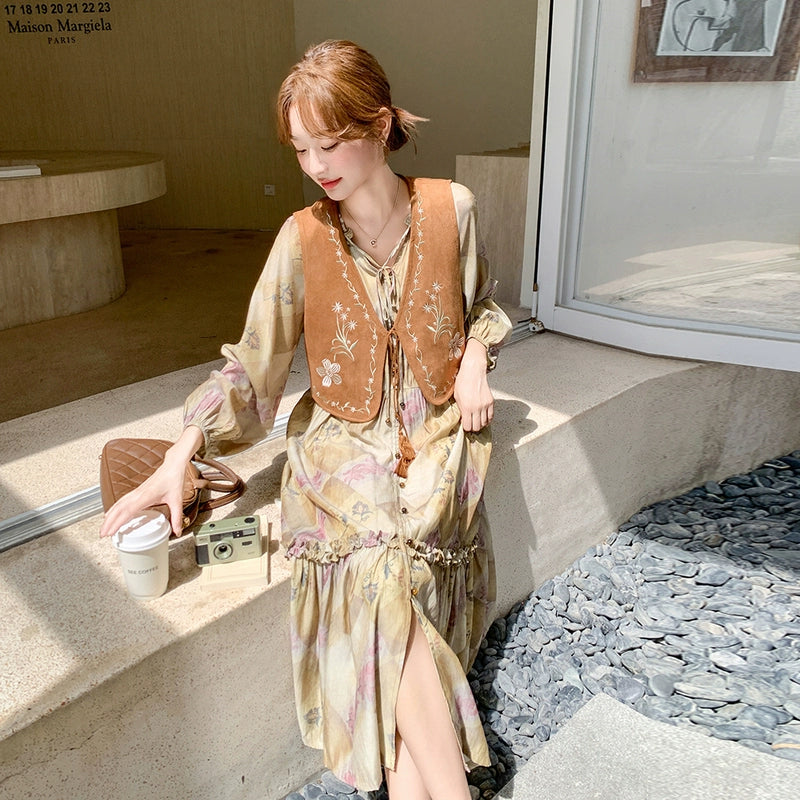 【セットアップ】ボヘミアン風 レイヤード 花柄刺繍レース ベスト+レトロ 長袖ワンピース レディース 秋新作【SHシリーズ】