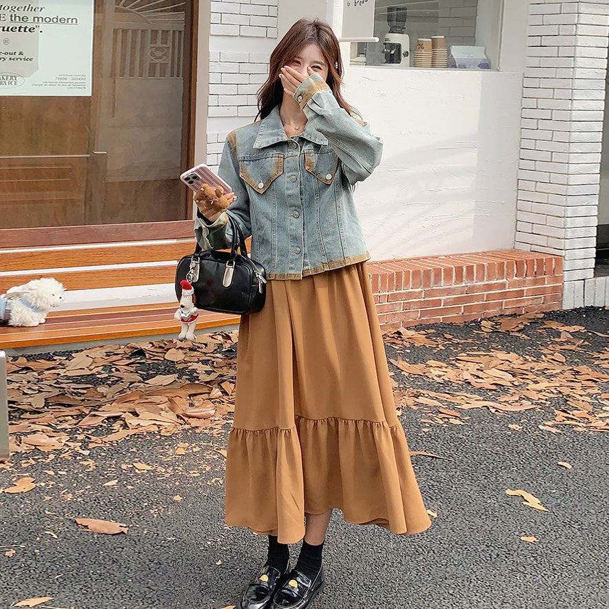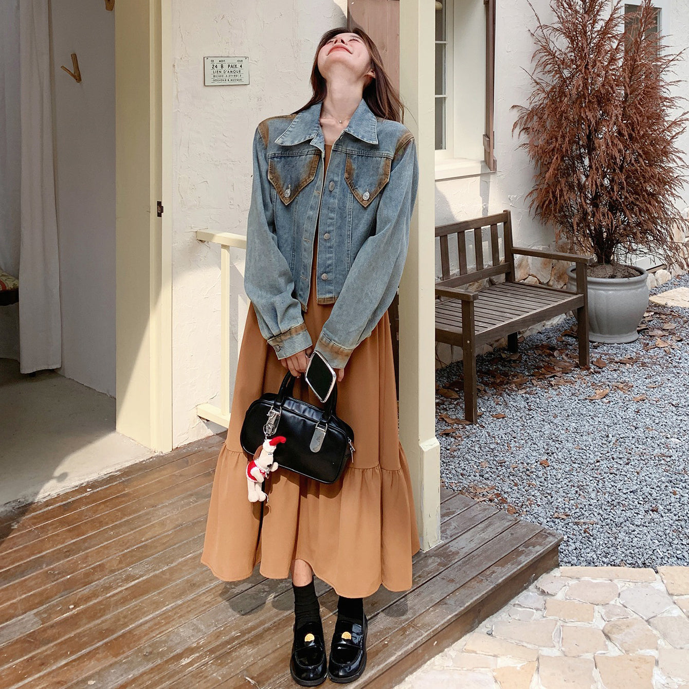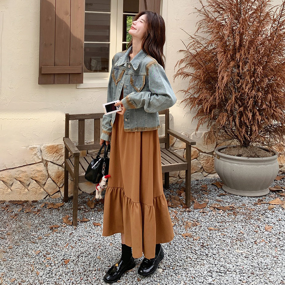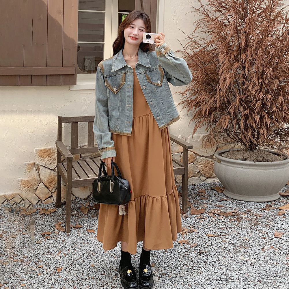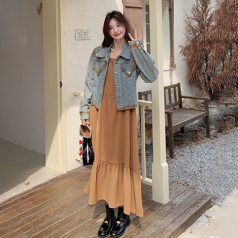 【セットアップ】初秋 韓国風コーデ レトロ デニム ジャケット+ノースリーブワンピース 細見え 2点セット【JZシリーズ】