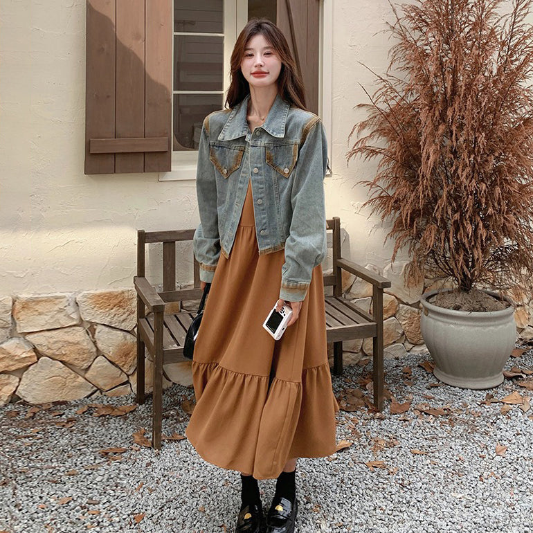 【商品名】【セットアップ】初秋 韓国風コーデ レトロ デニム ジャケット+ノースリーブワンピース 細見え 2点セット【JZシリーズ】