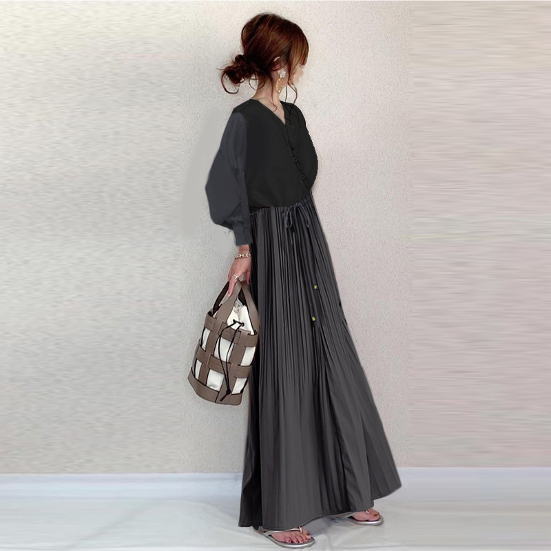 【60%OFF⭐️早い者勝ち】【ワンピース】秋 長袖ワンピース レディース Vネック シャーリング プリーツ ゆったり カジュアル
