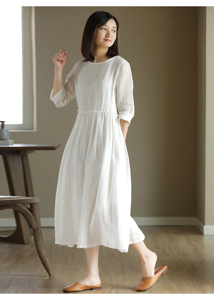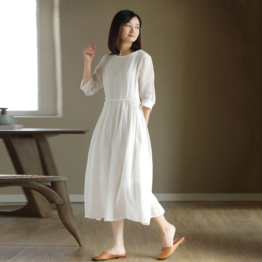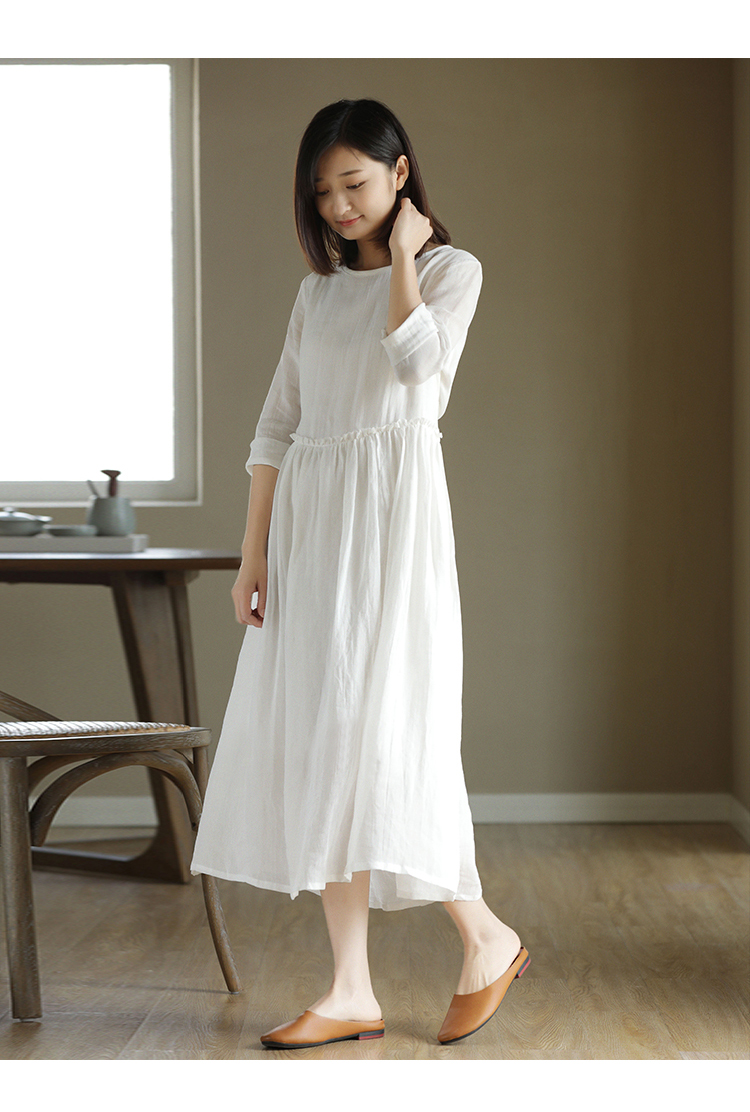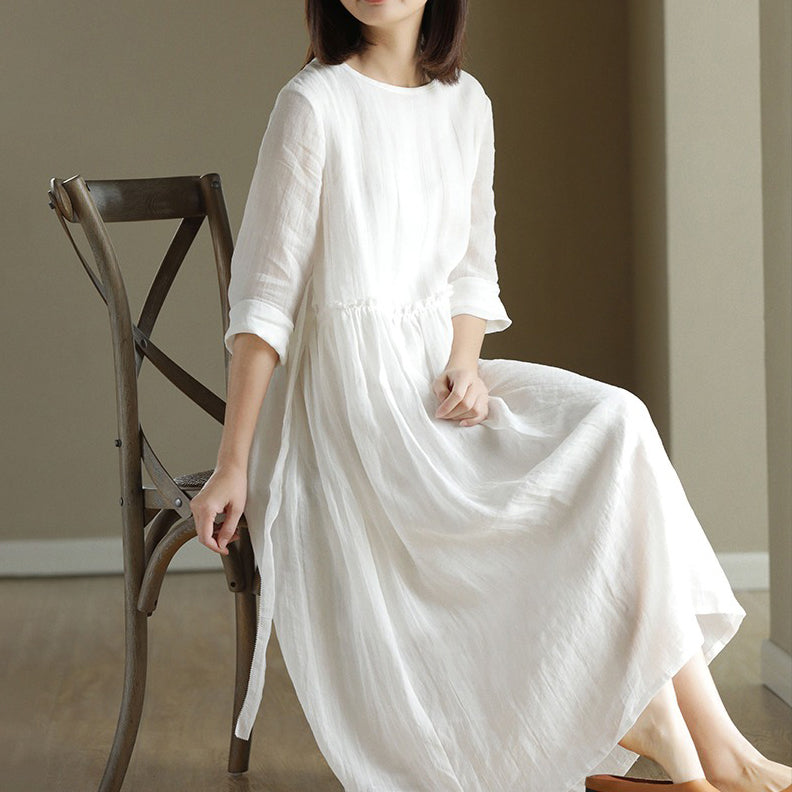 【ワンピース】夏新作 リネン混 白 ロング長袖ワンピース フレンチ風 ゆったりナチュラル