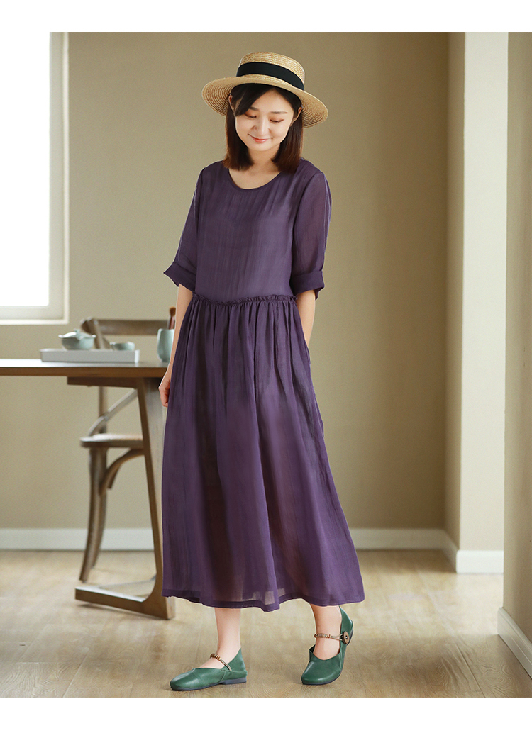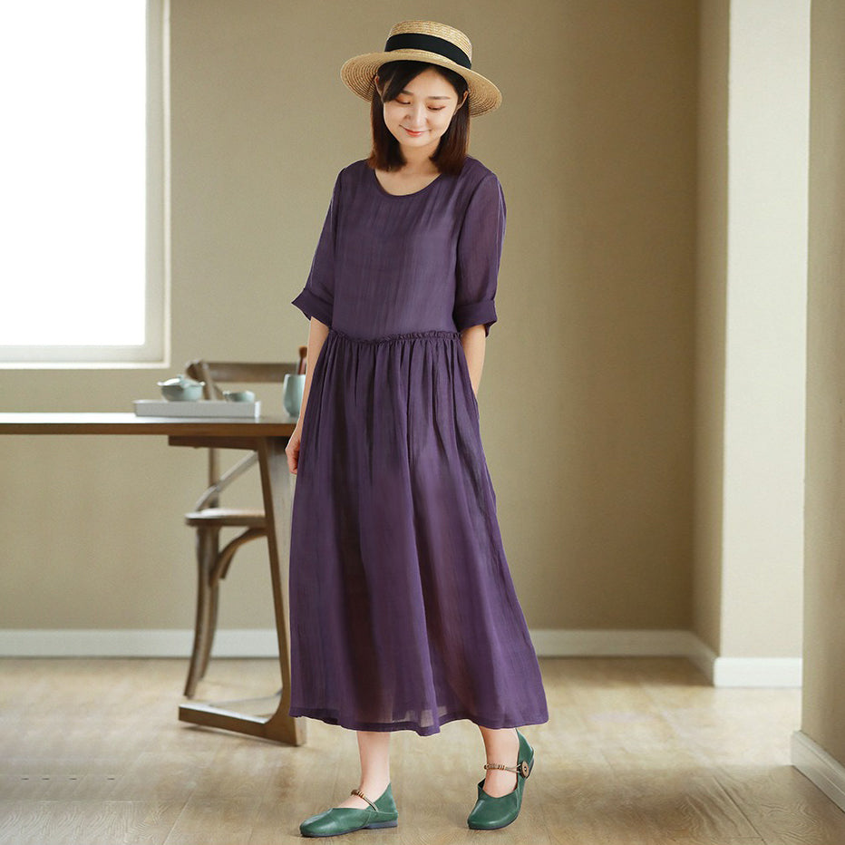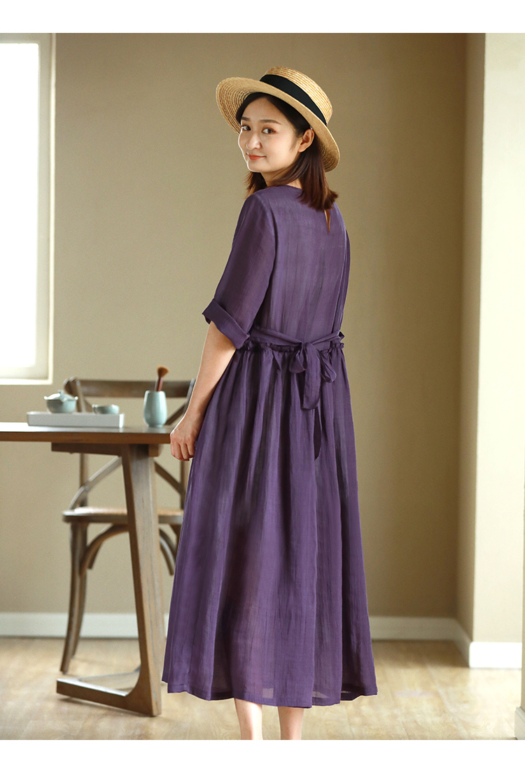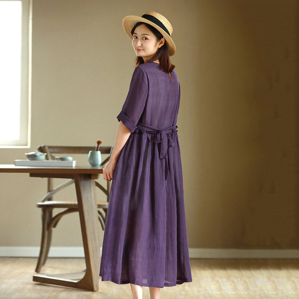 【ワンピース】夏新作 リネン混 白 ロング長袖ワンピース フレンチ風 ゆったりナチュラル