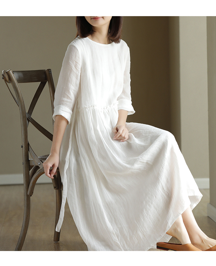 【商品名】【ワンピース】夏新作 リネン混 白 ロング長袖ワンピース フレンチ風 ゆったりナチュラル