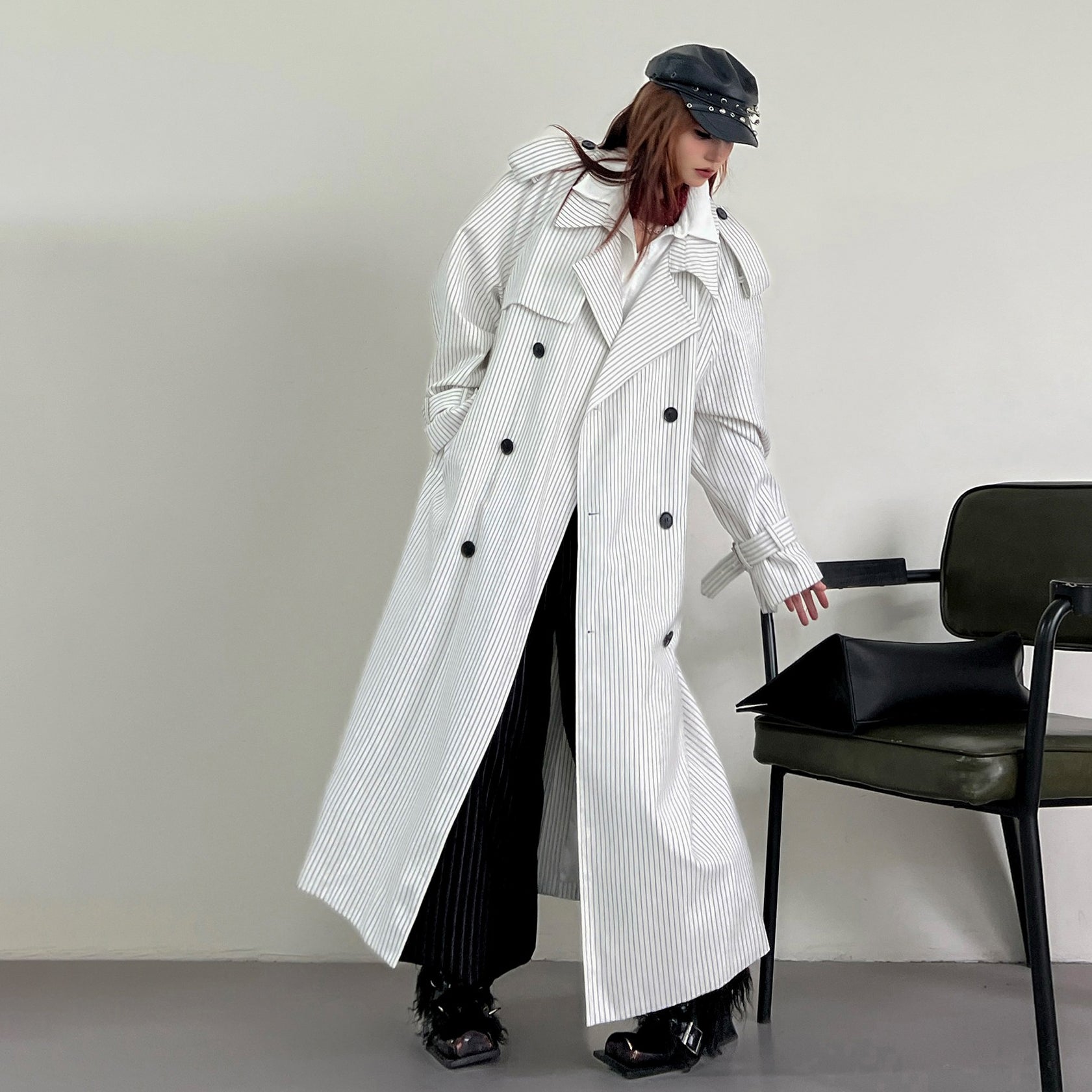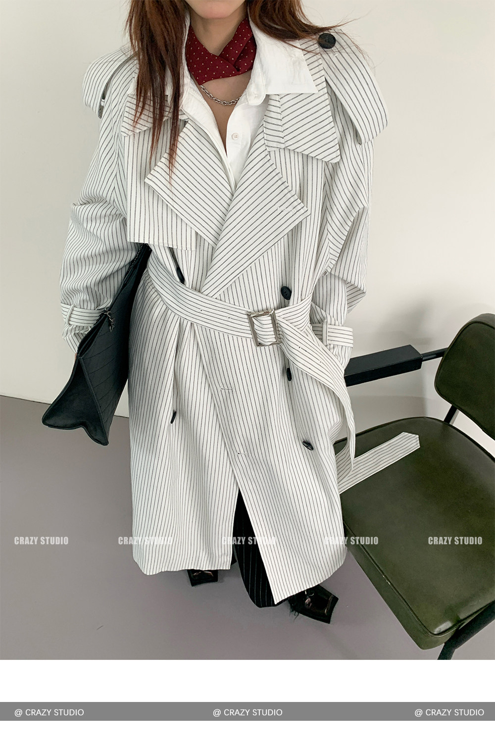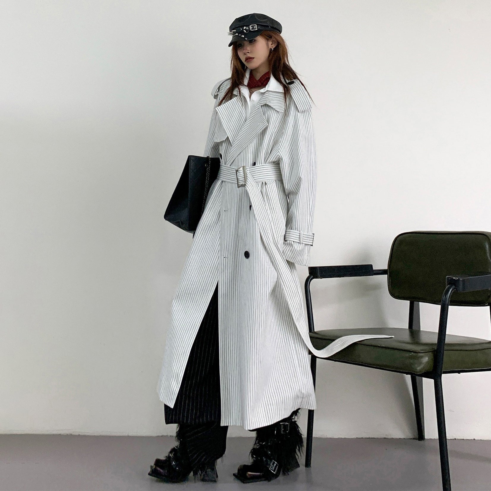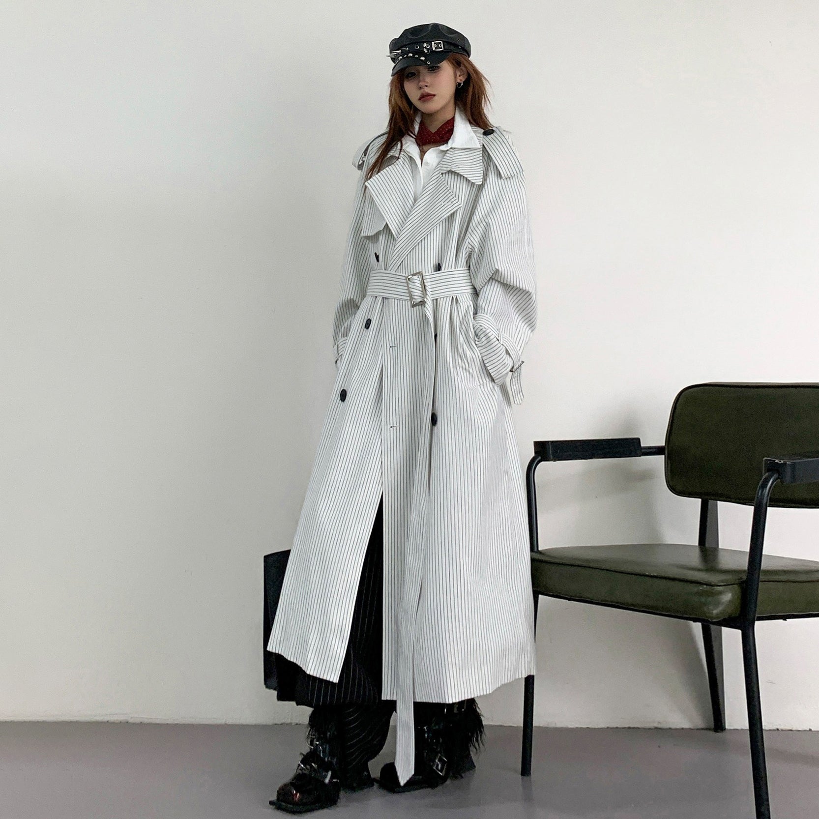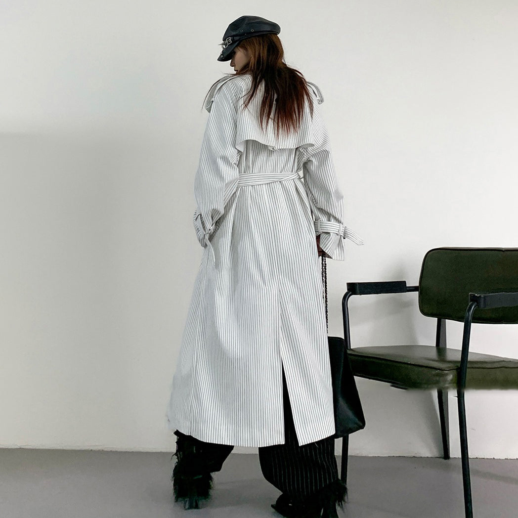 【アウター】韓国風 ストライプ ダブルボタン ベルト付き ロングトレンチコート【FCシリーズ】【10~15日内発送】