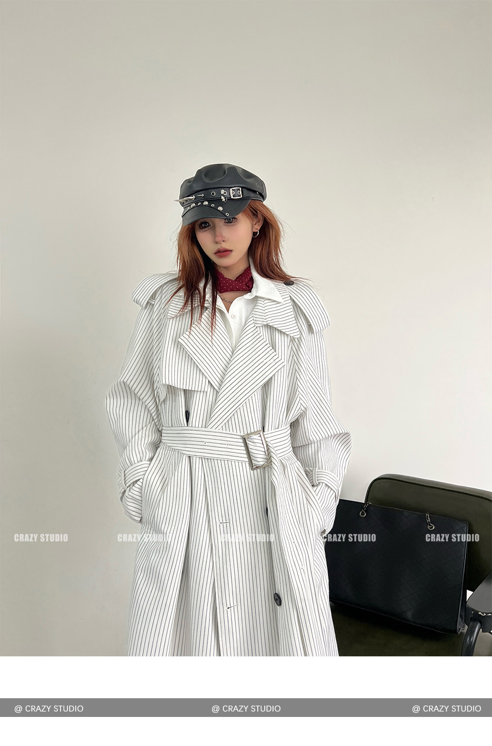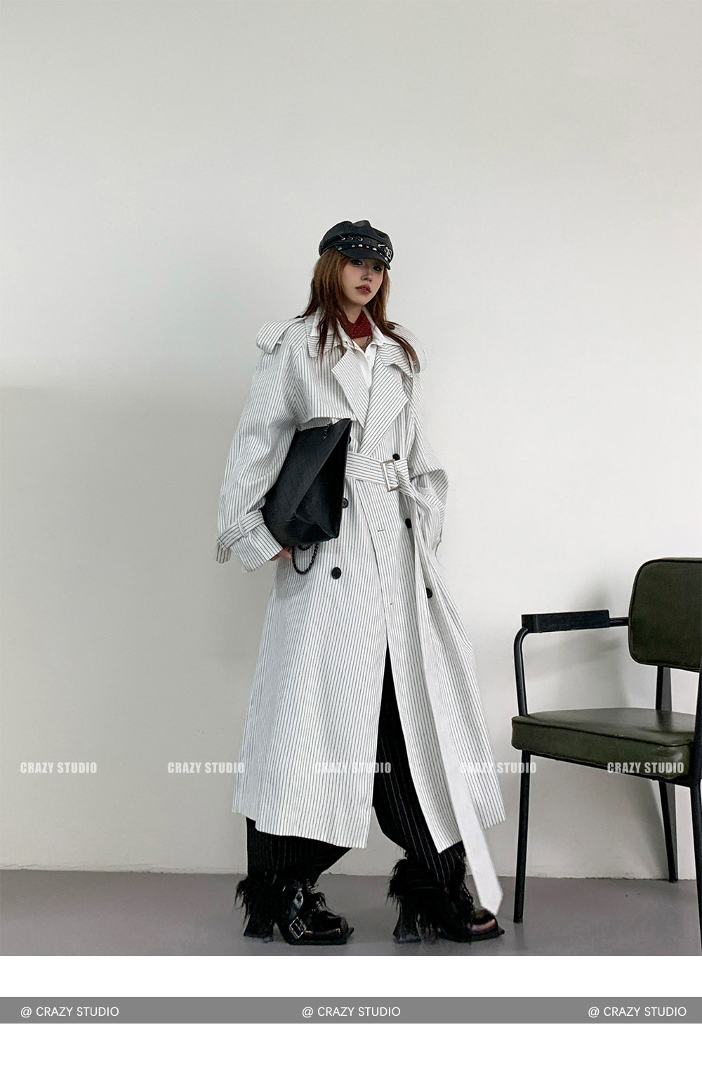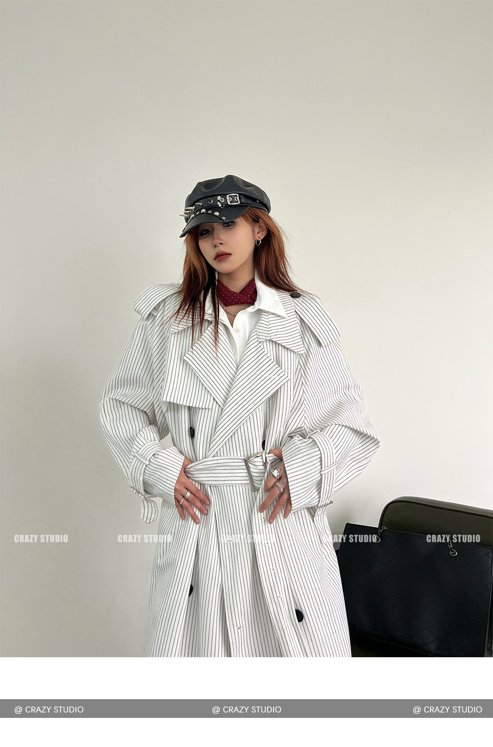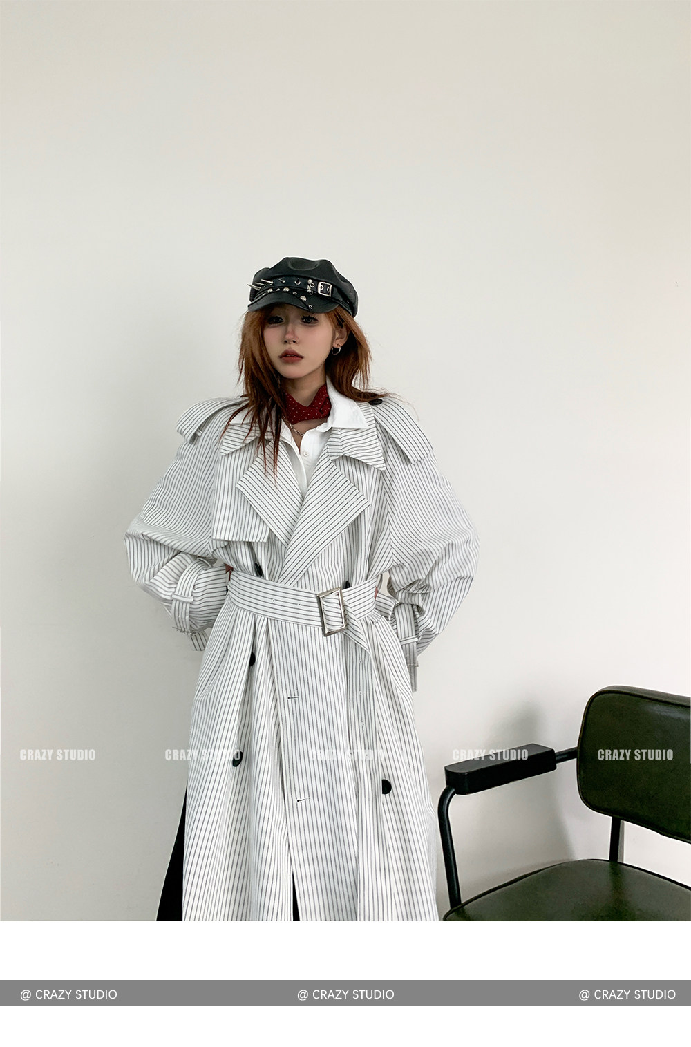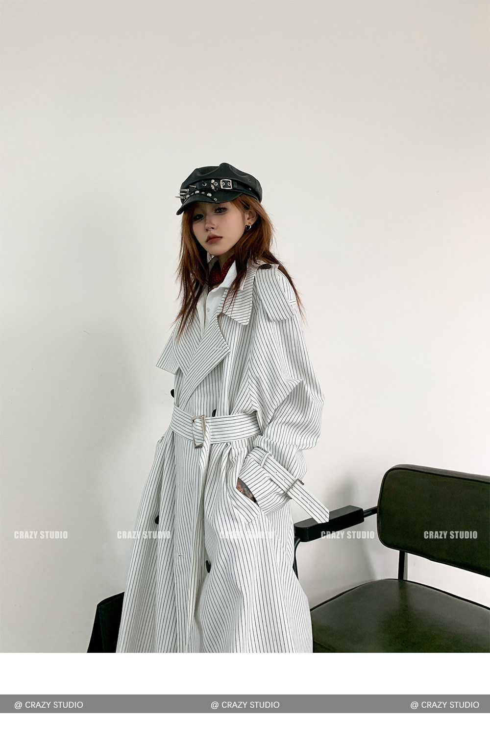 【アウター】韓国風 ストライプ ダブルボタン ベルト付き ロングトレンチコート【FCシリーズ】【10~15日内発送】