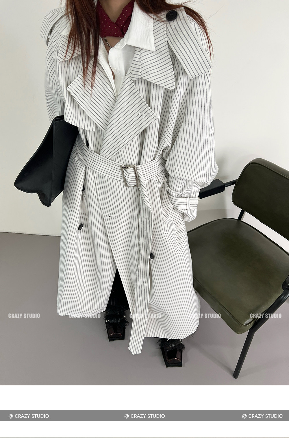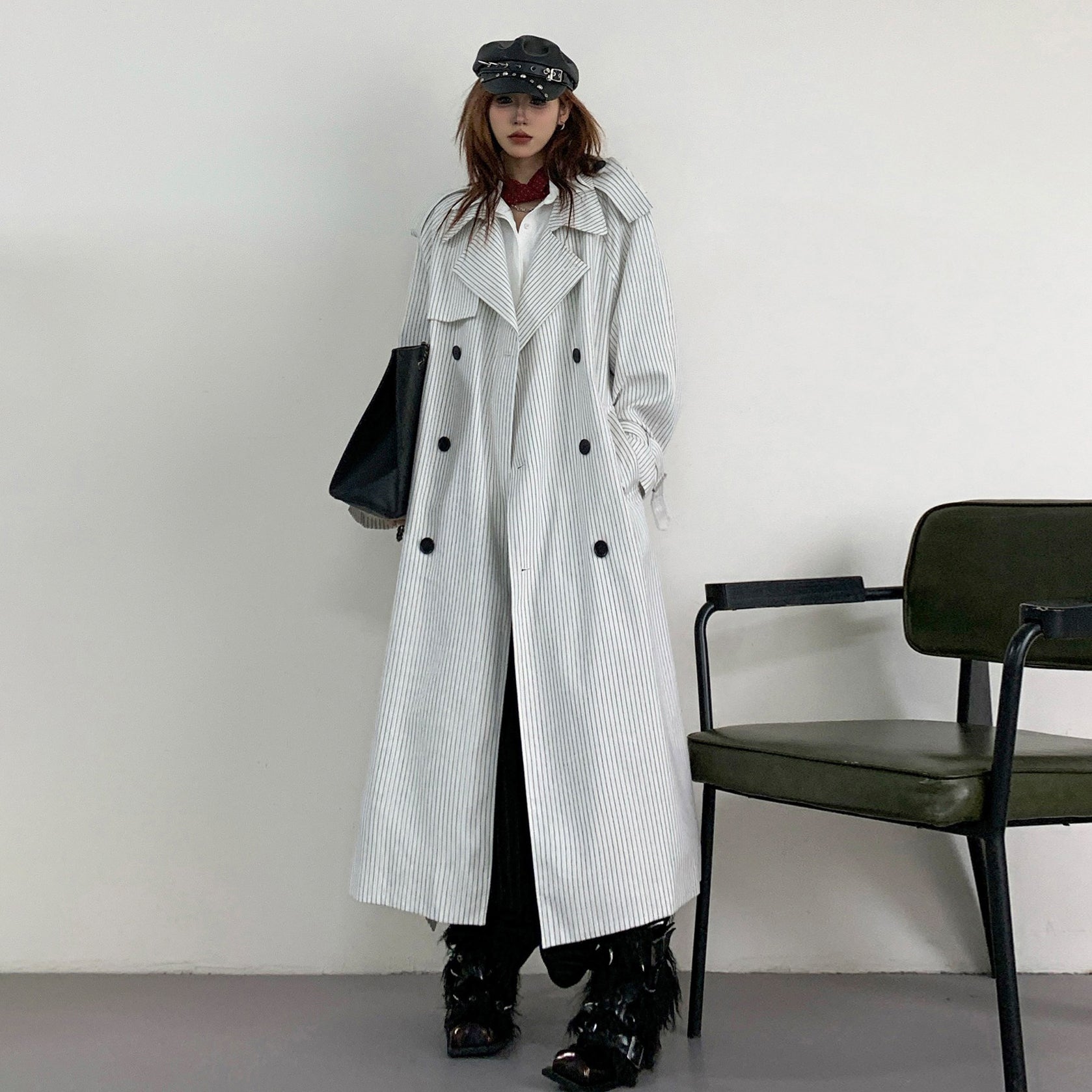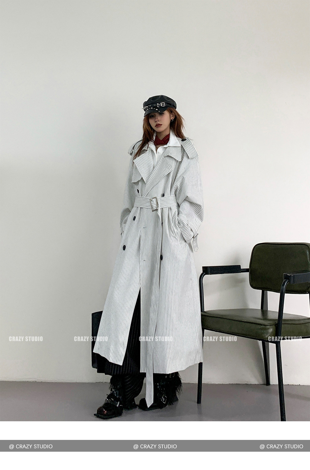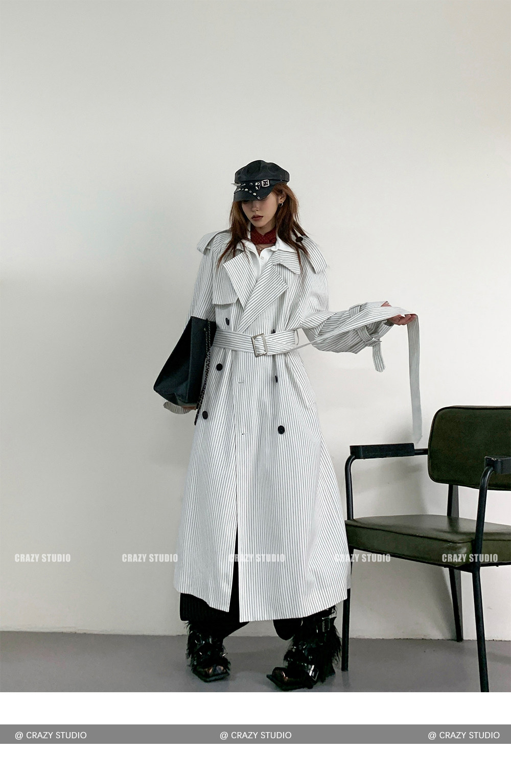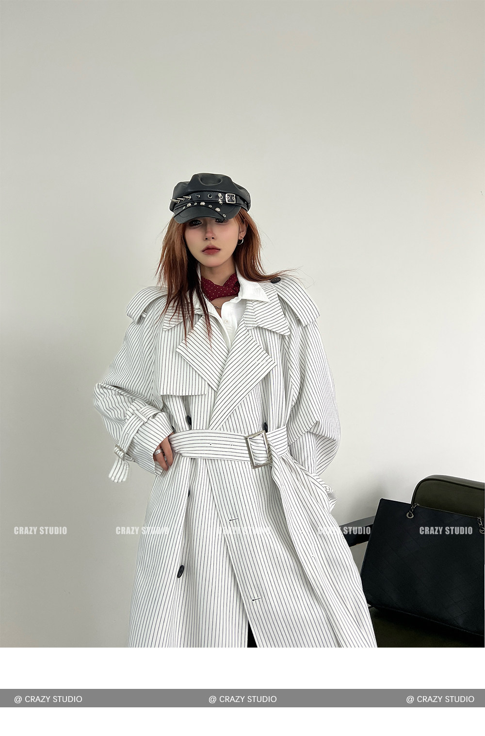 【アウター】韓国風 ストライプ ダブルボタン ベルト付き ロングトレンチコート【FCシリーズ】【10~15日内発送】
