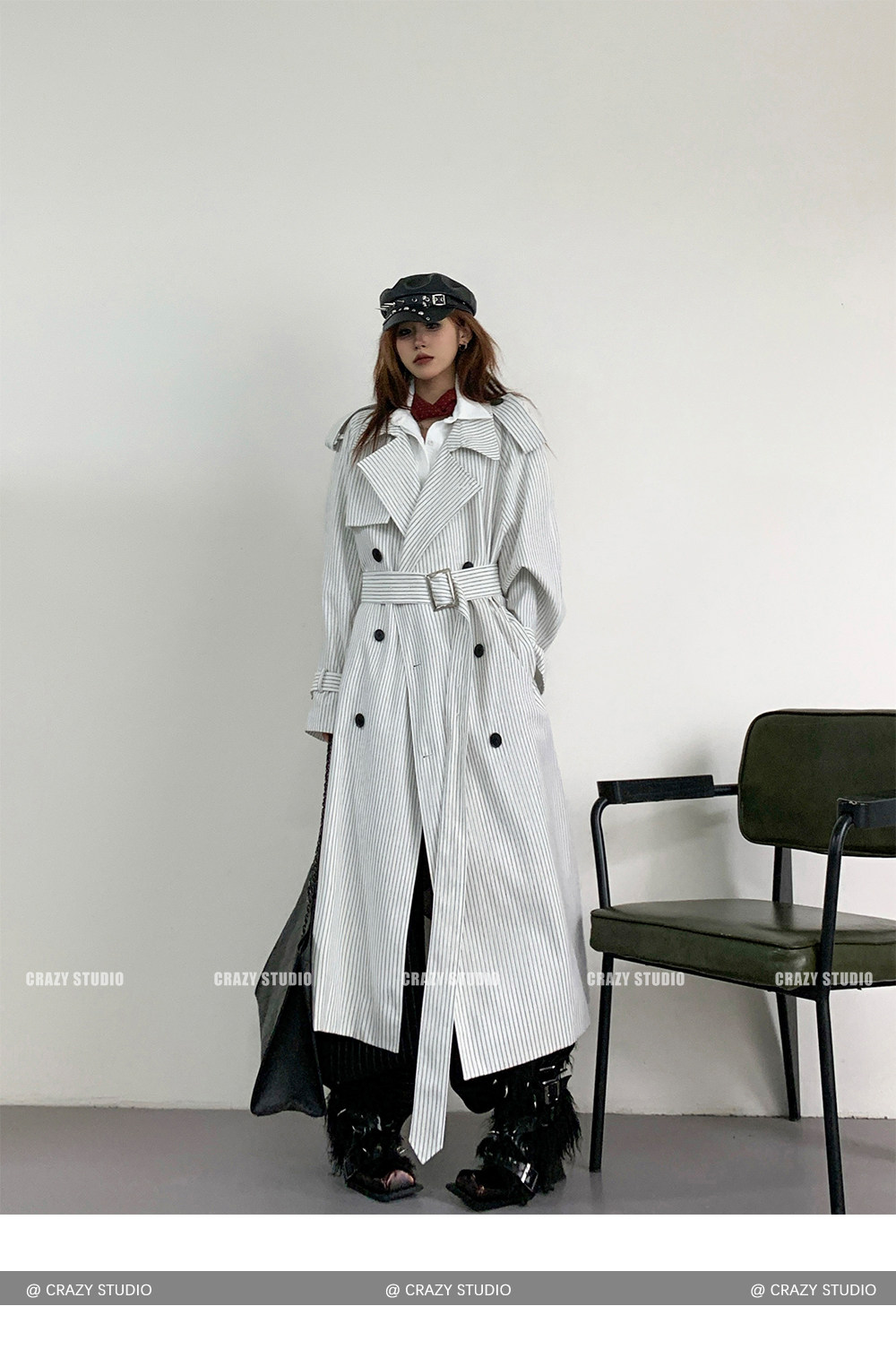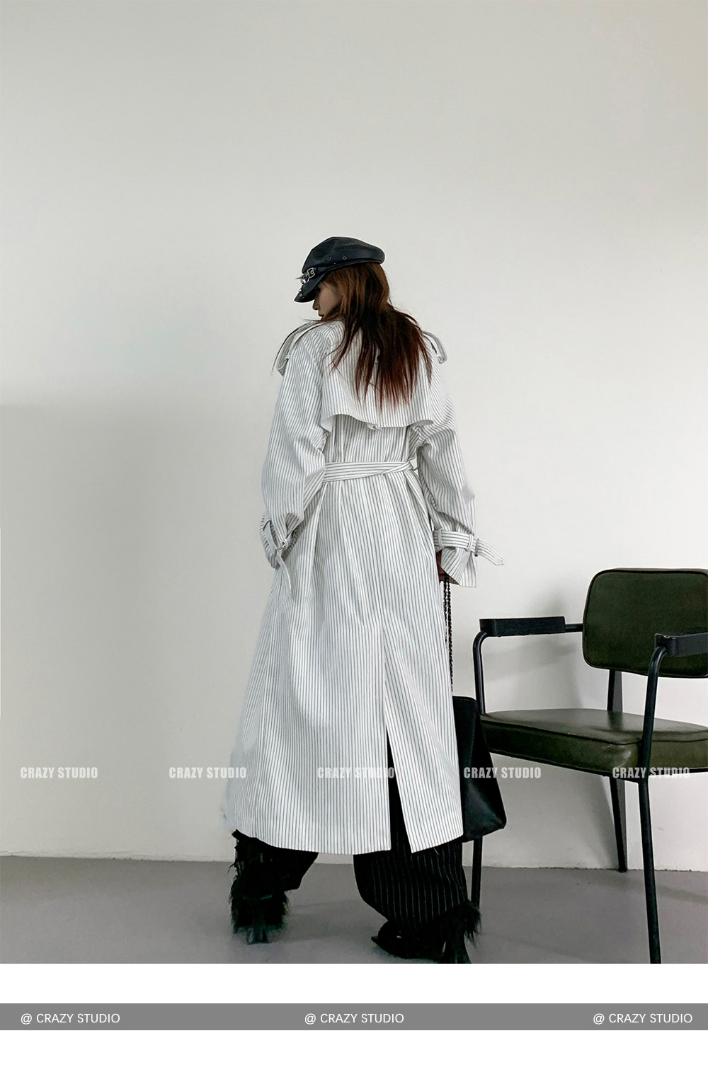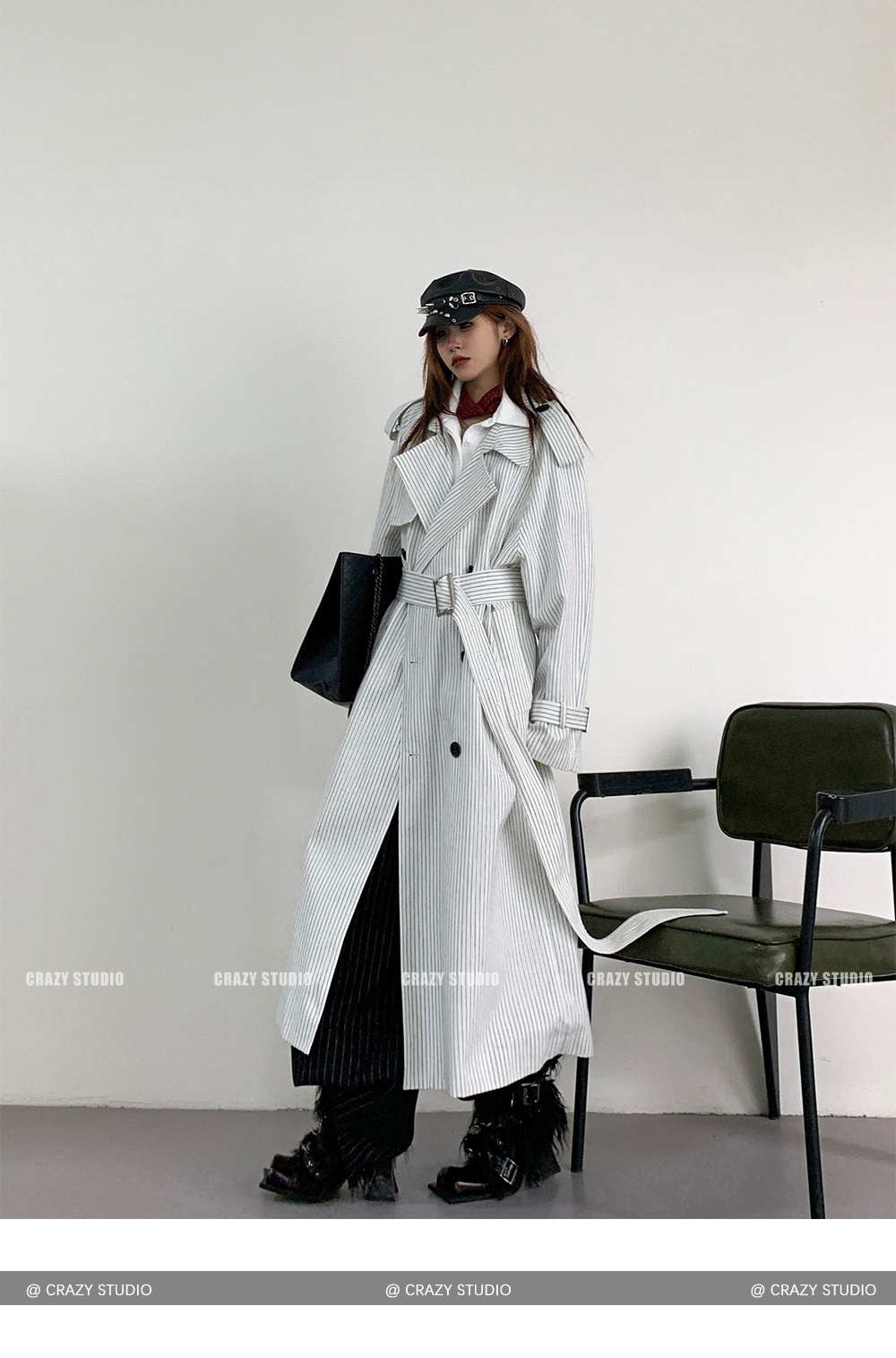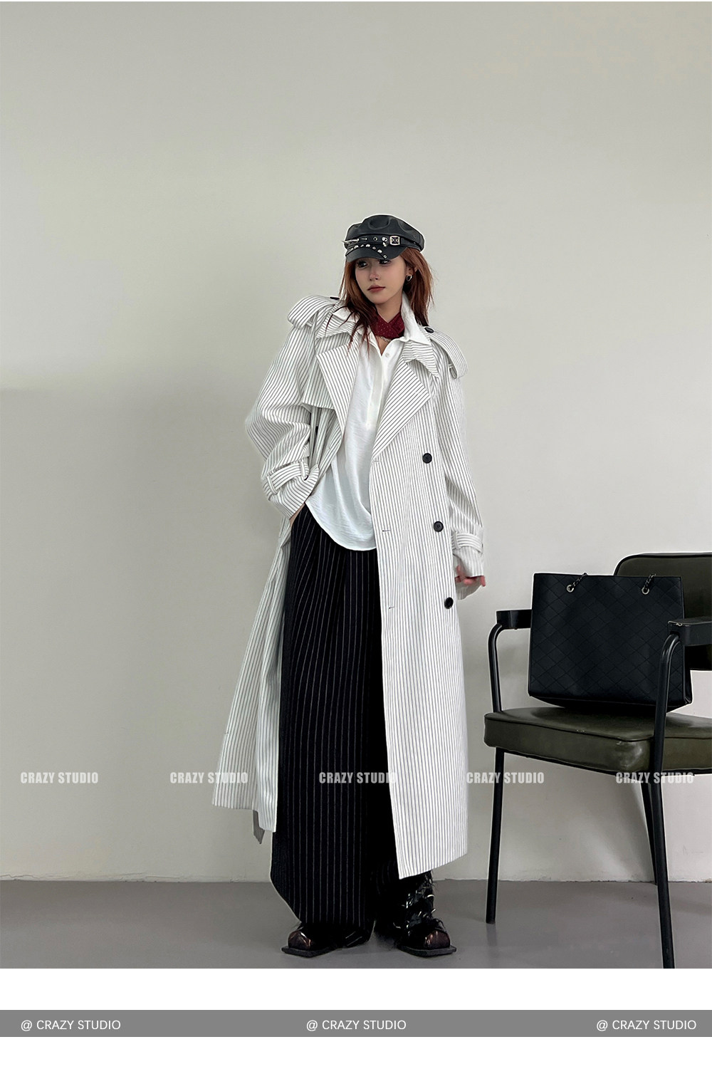 【アウター】韓国風 ストライプ ダブルボタン ベルト付き ロングトレンチコート【FCシリーズ】【10~15日内発送】