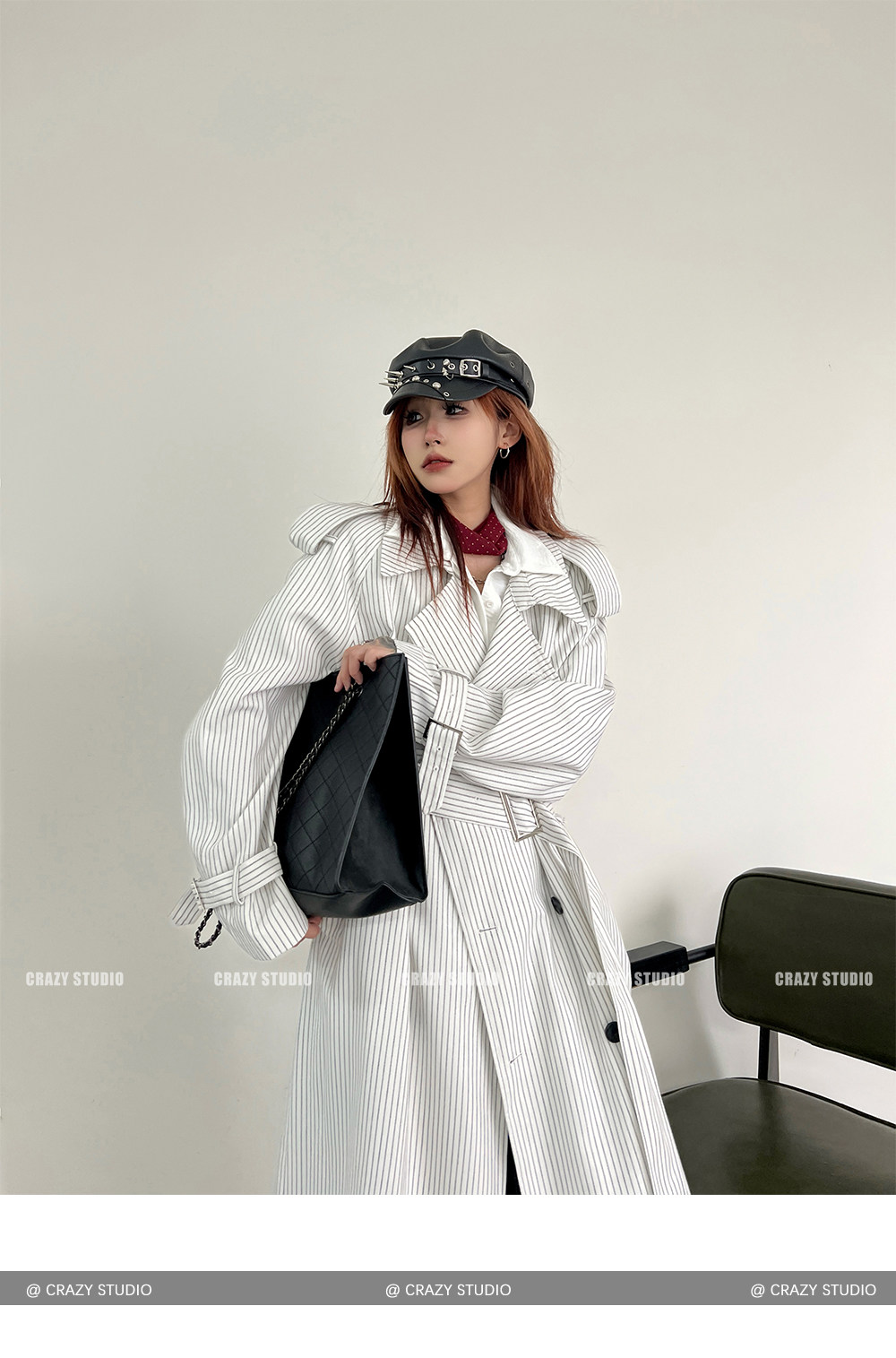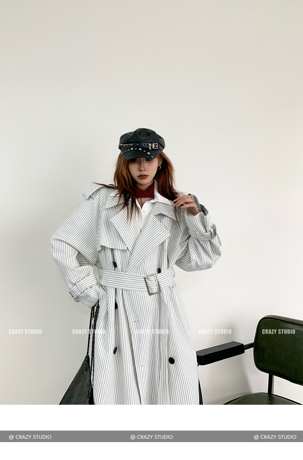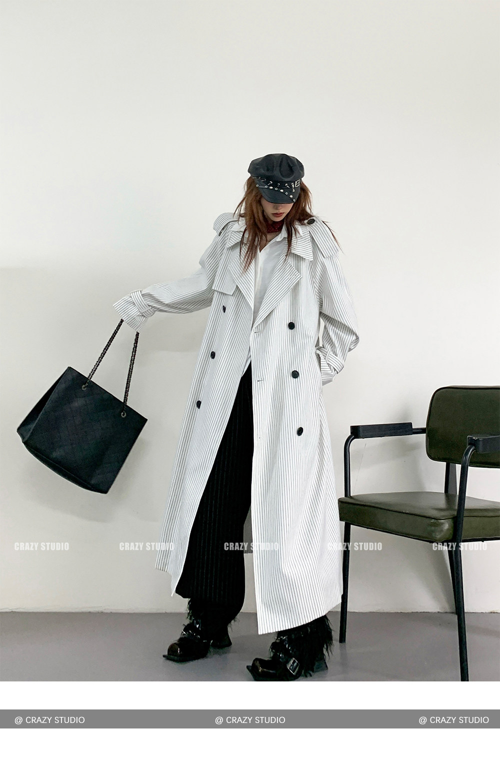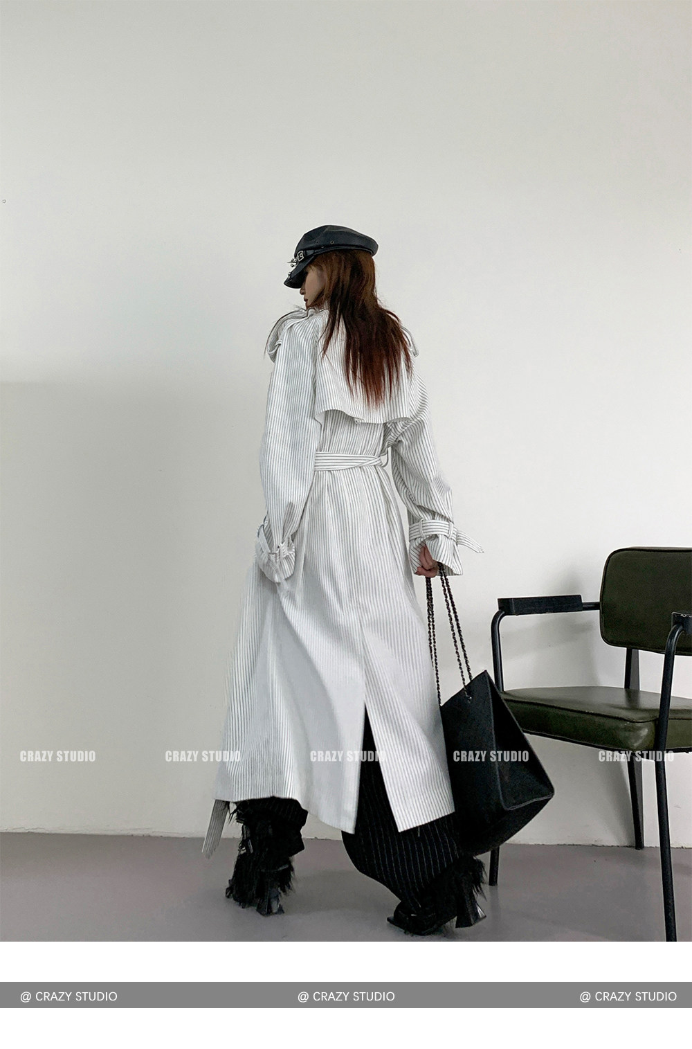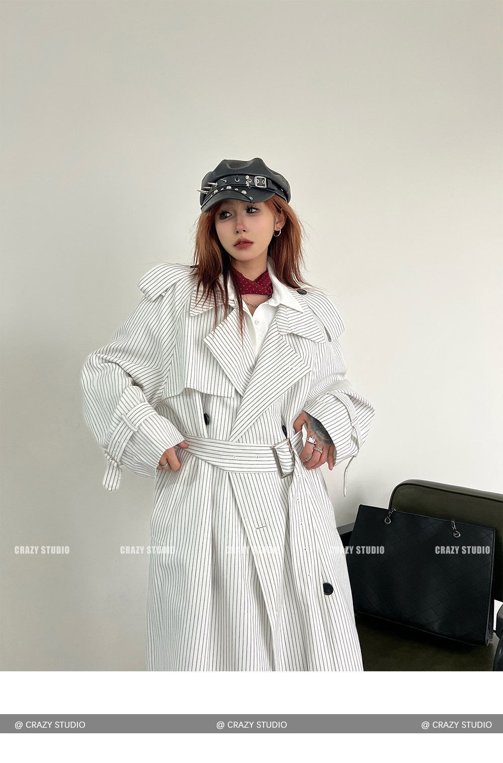 【アウター】韓国風 ストライプ ダブルボタン ベルト付き ロングトレンチコート【FCシリーズ】【10~15日内発送】