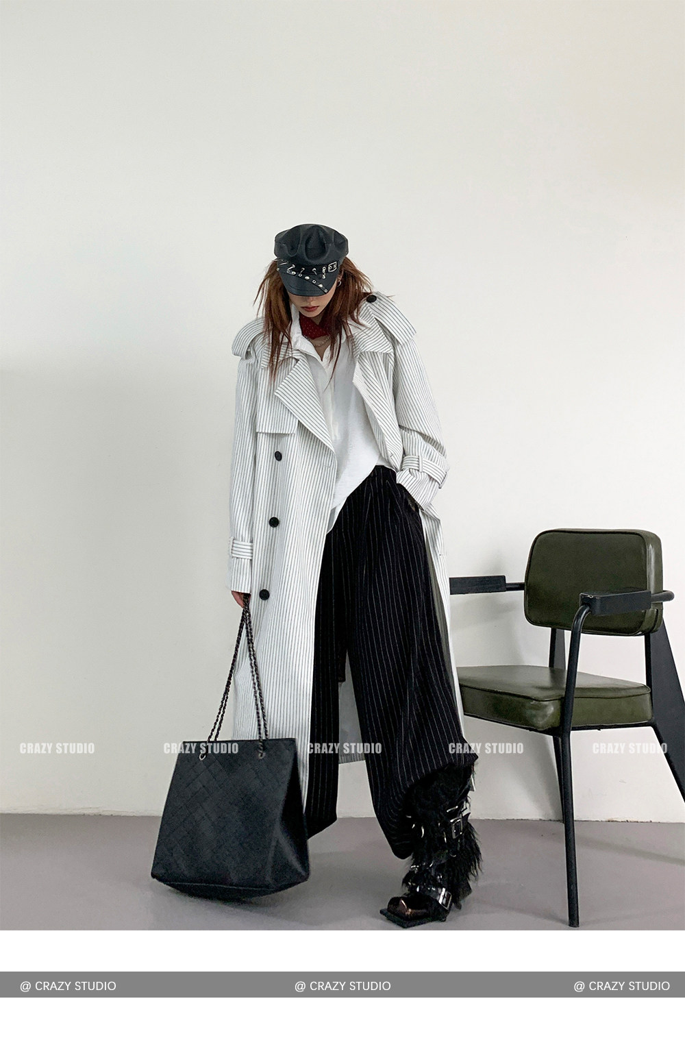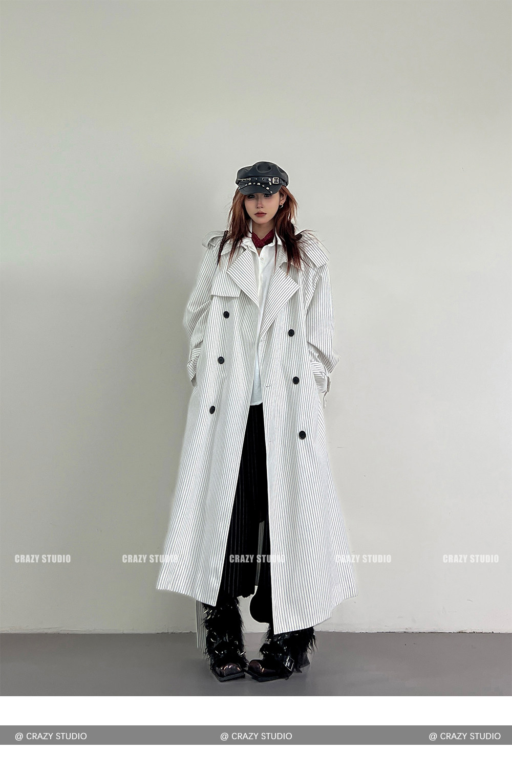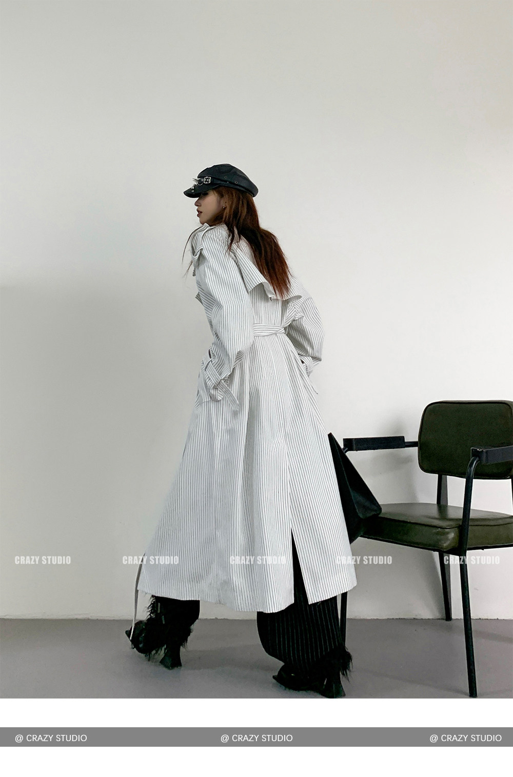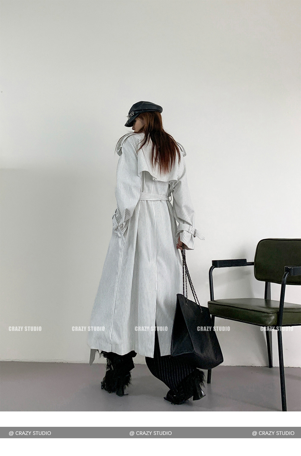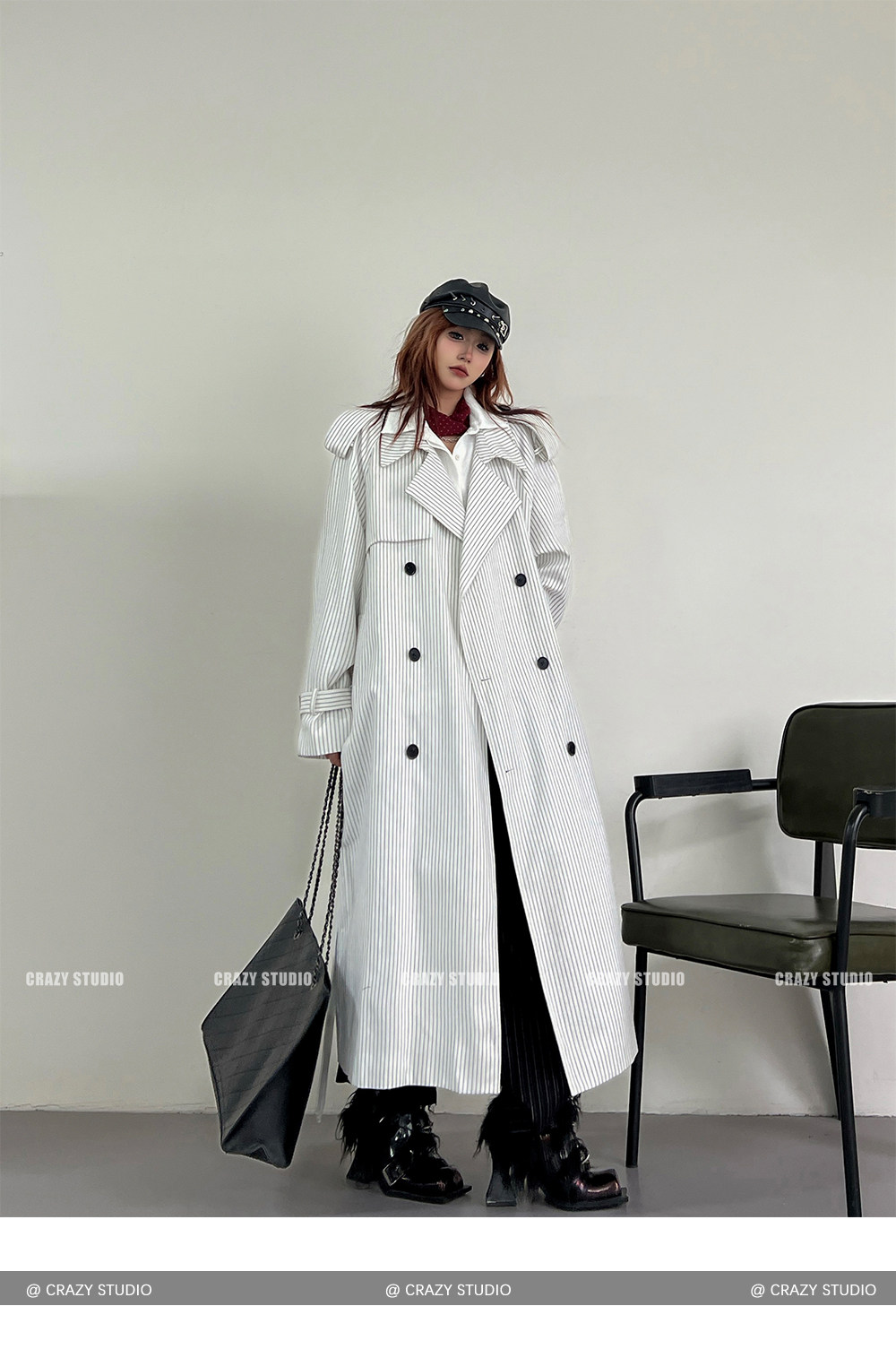 【アウター】韓国風 ストライプ ダブルボタン ベルト付き ロングトレンチコート【FCシリーズ】【10~15日内発送】