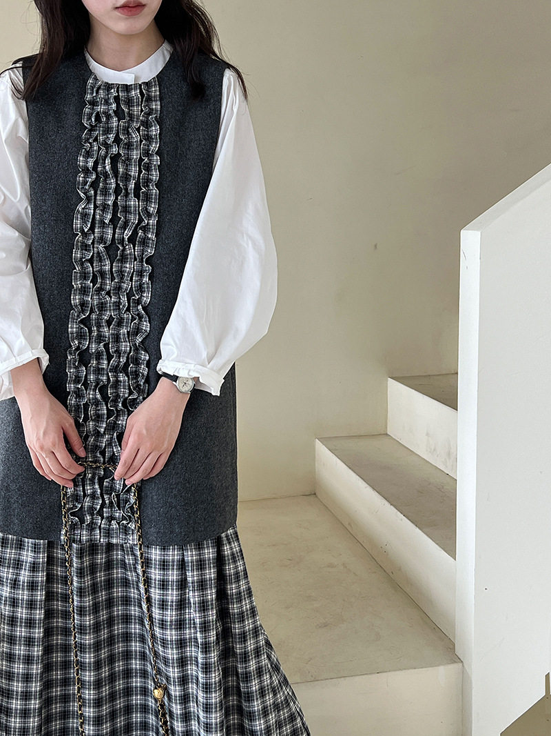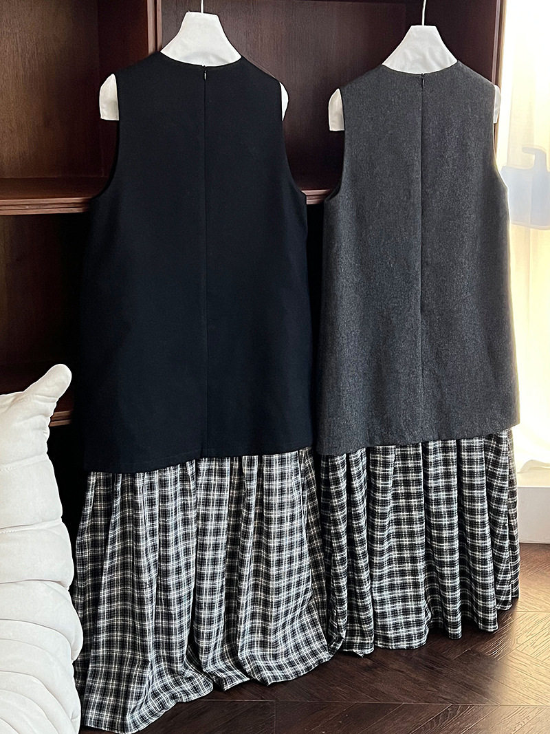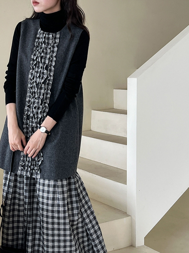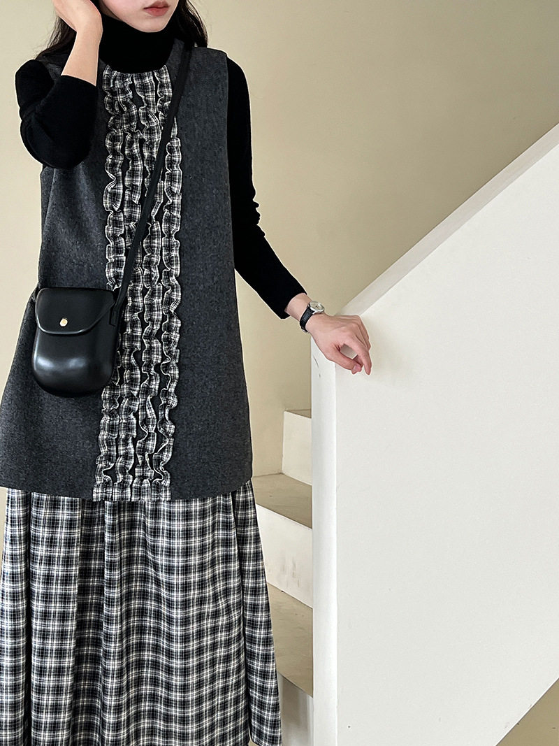 【商品名】【ワンピース】春 秋 冬 チェック柄 マーメイド 花びらツイード ベスト型 ワンピース 【JZシリーズ】