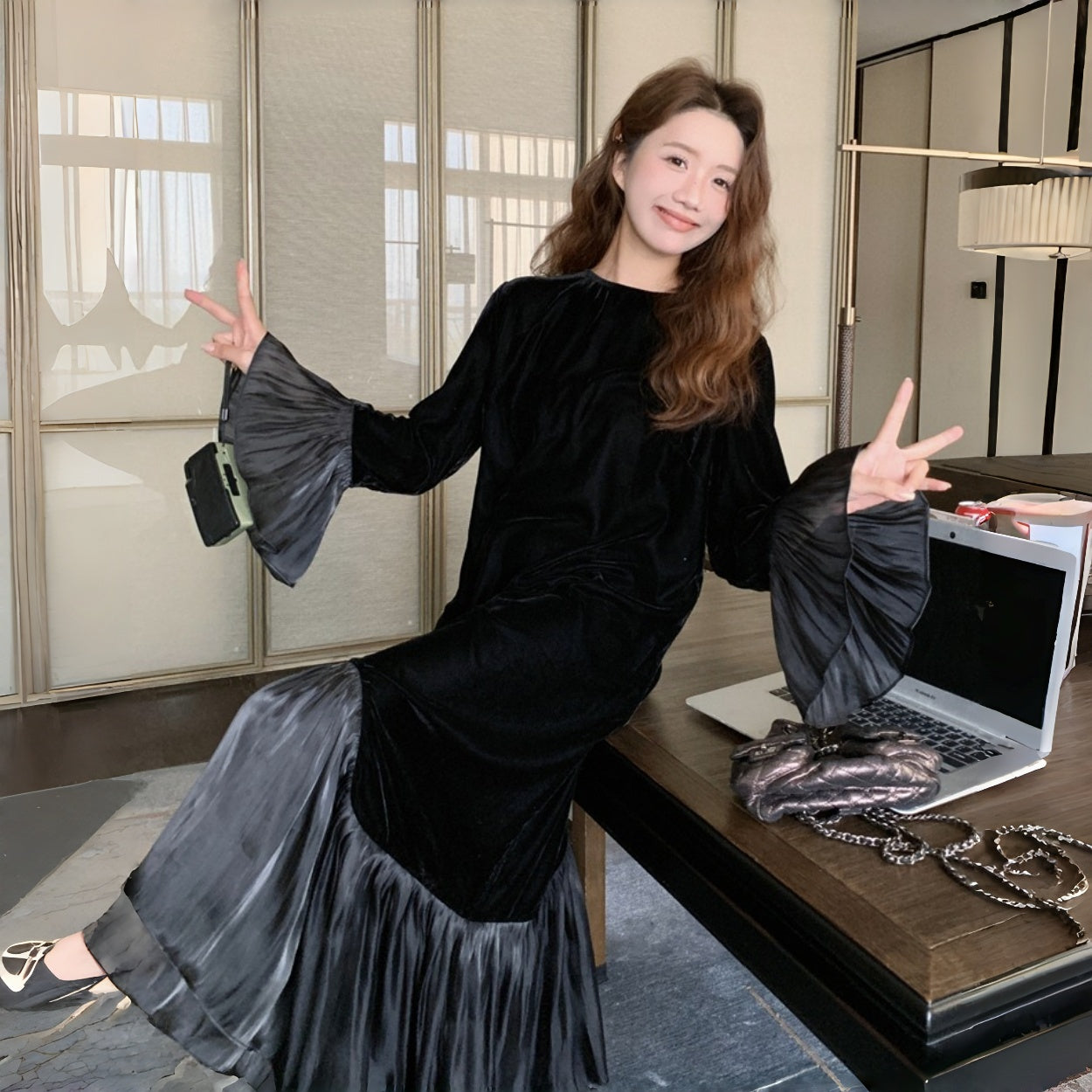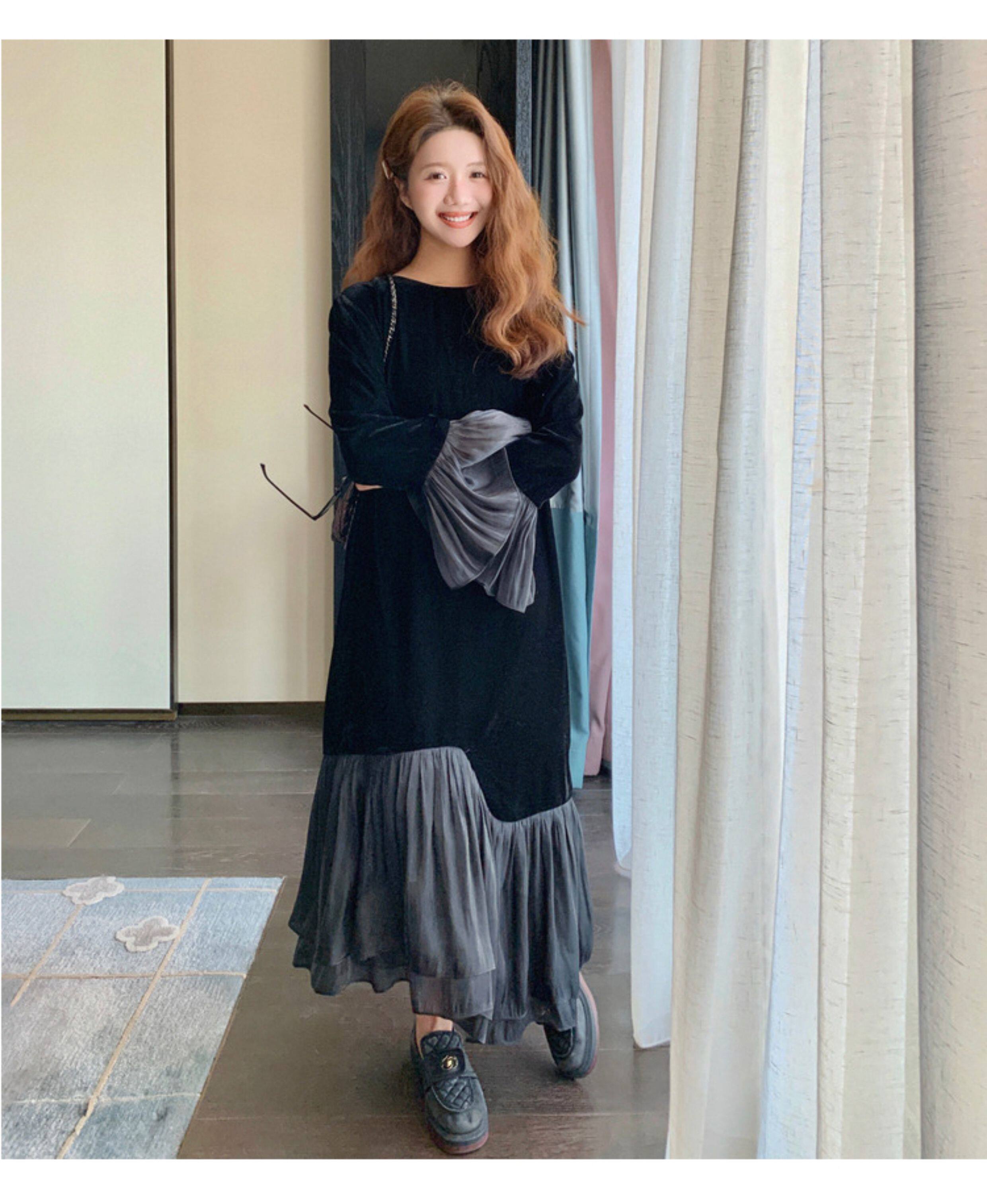 【ワンピース】春 秋 冬 フレンチ 高級感 気質よい フリル ベルベット 長袖ワンピース【JZシリーズ】