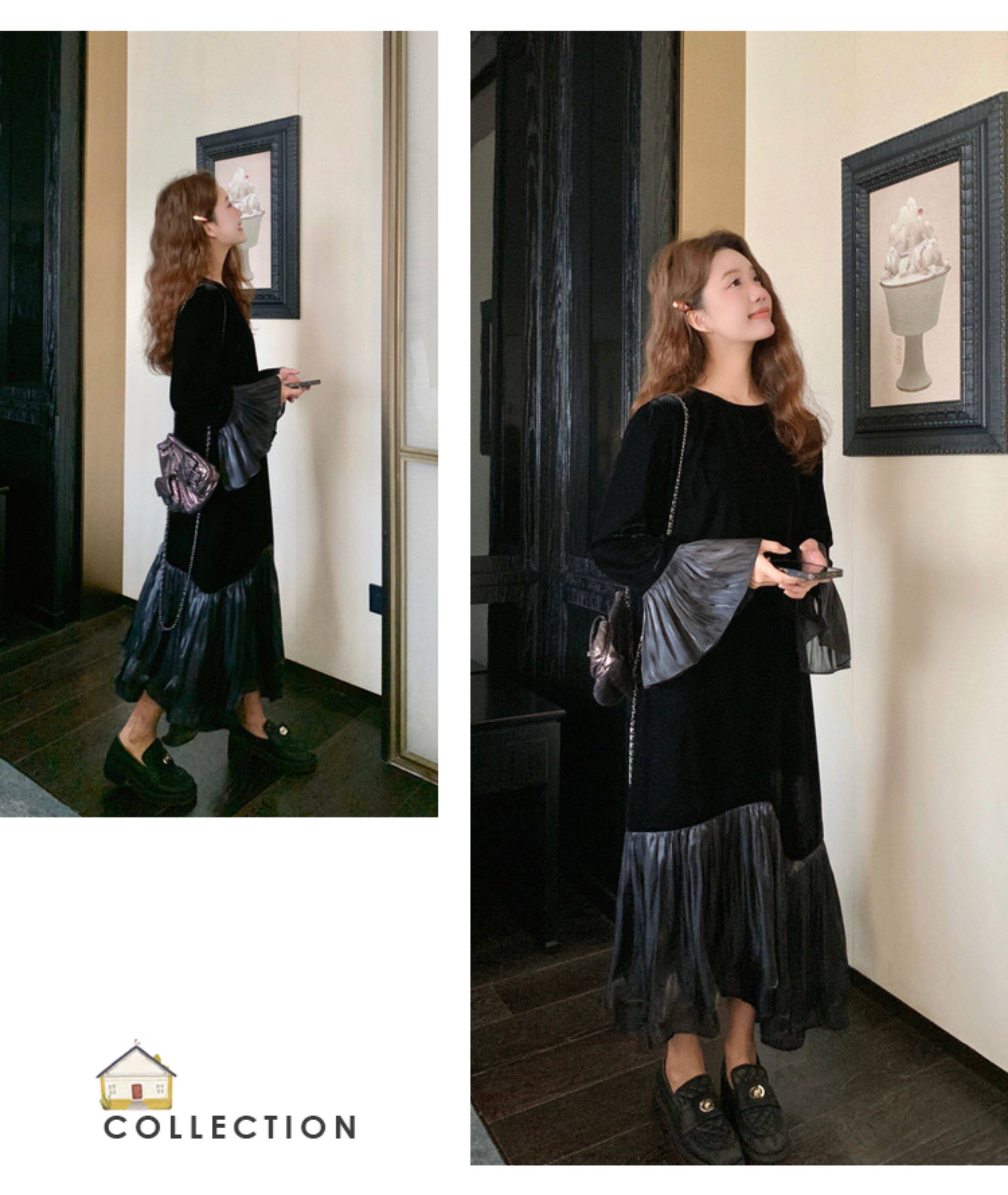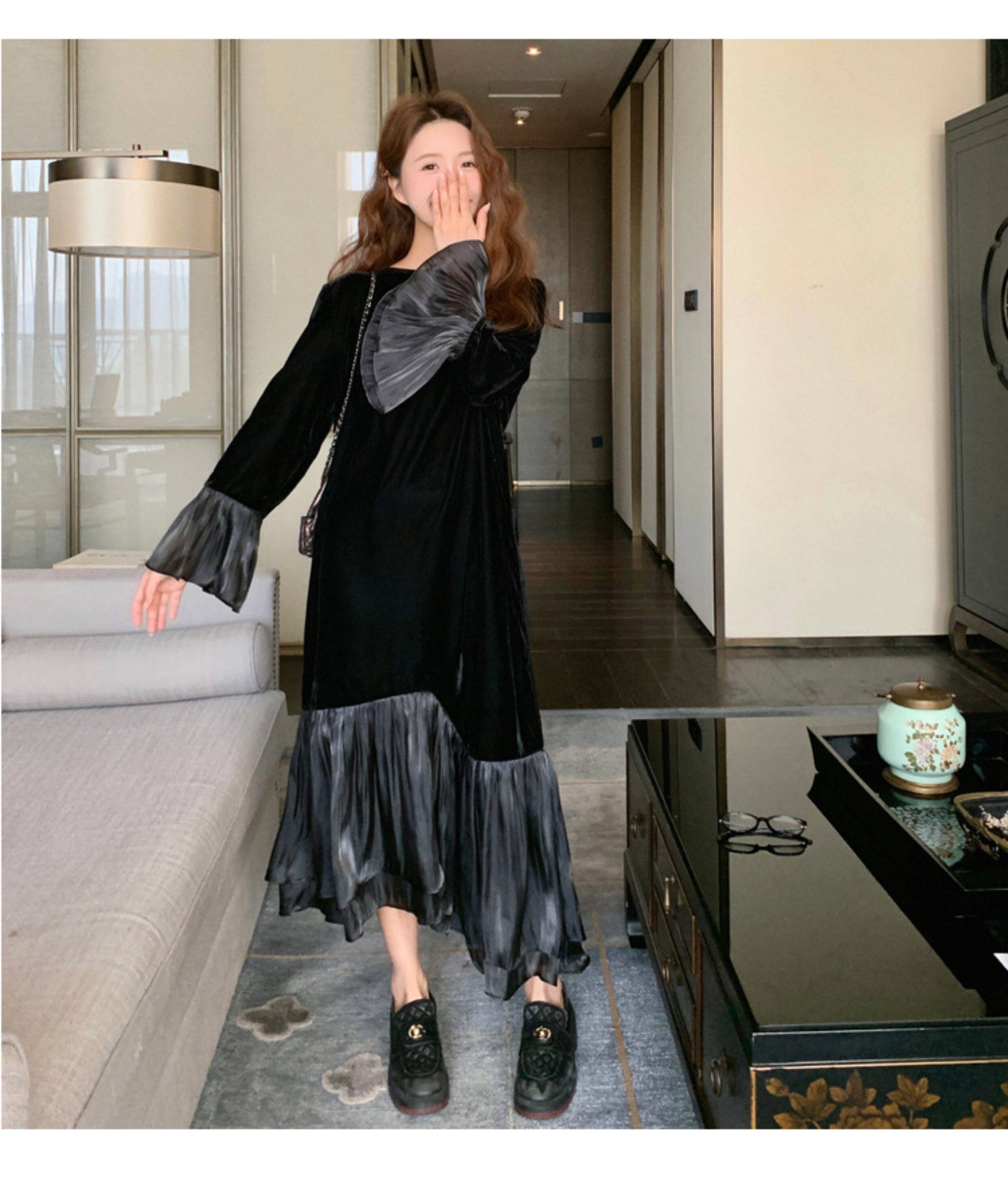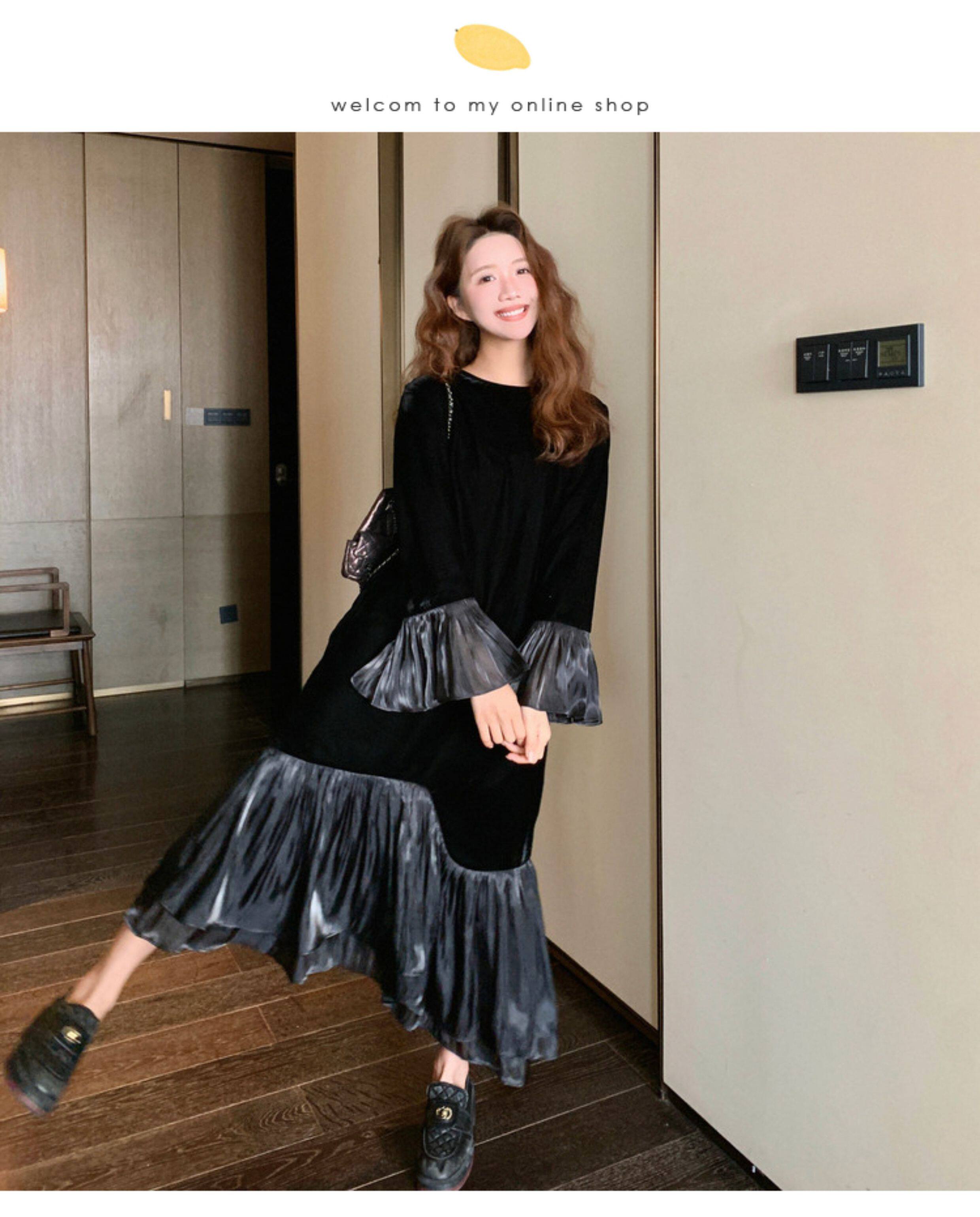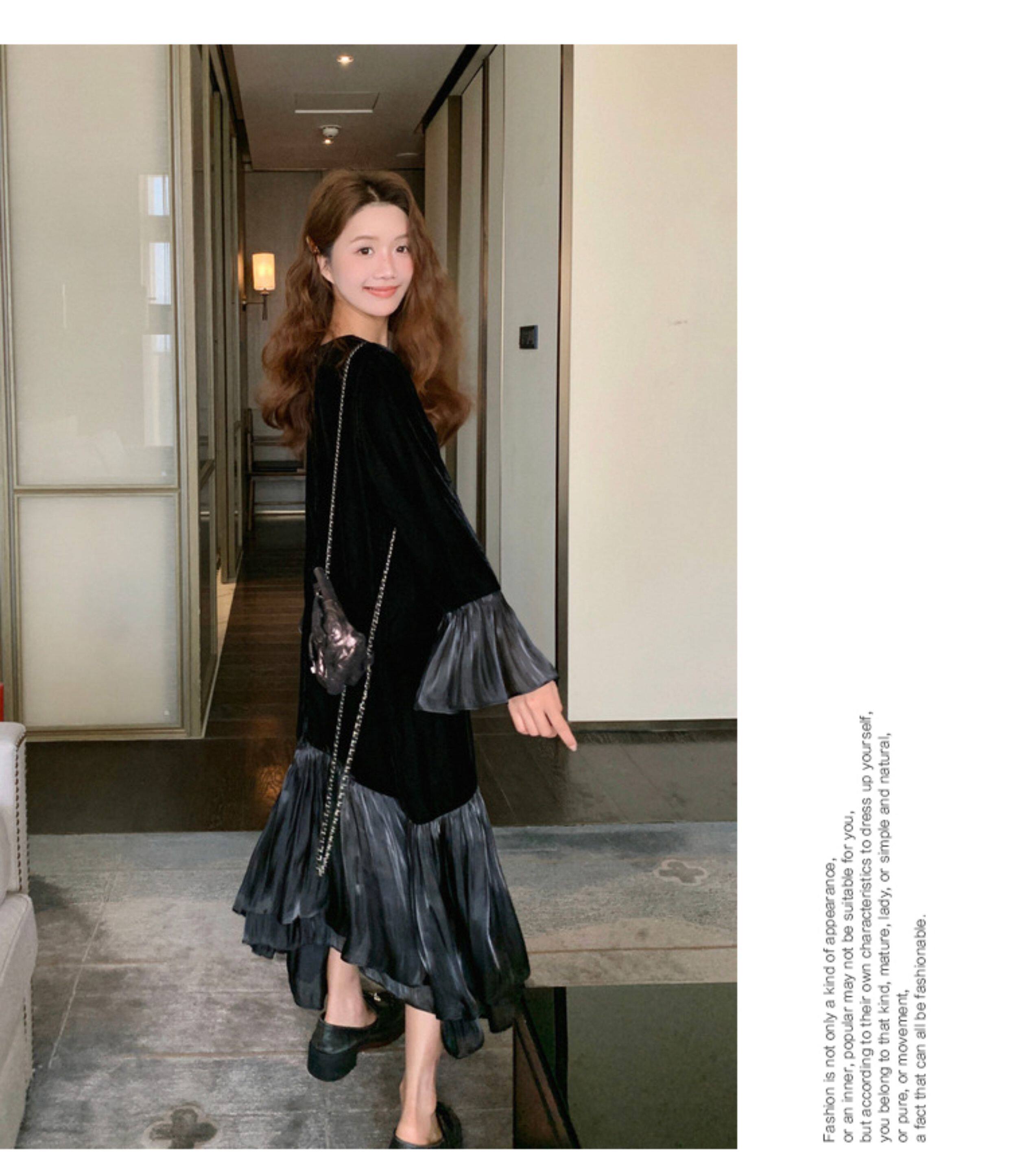 【商品名】【ワンピース】春 秋 冬 フレンチ 高級感 気質よい フリル ベルベット 長袖ワンピース