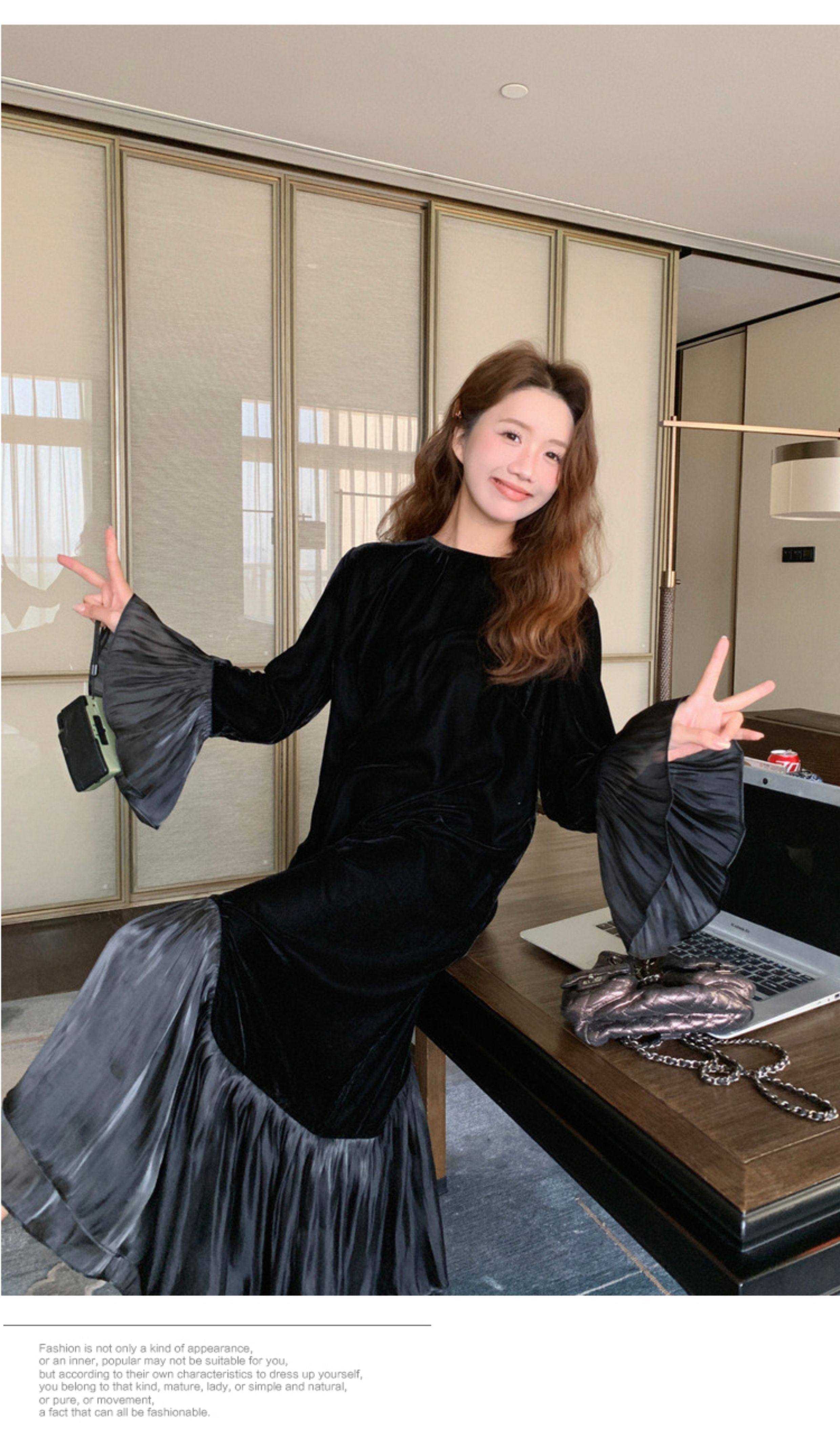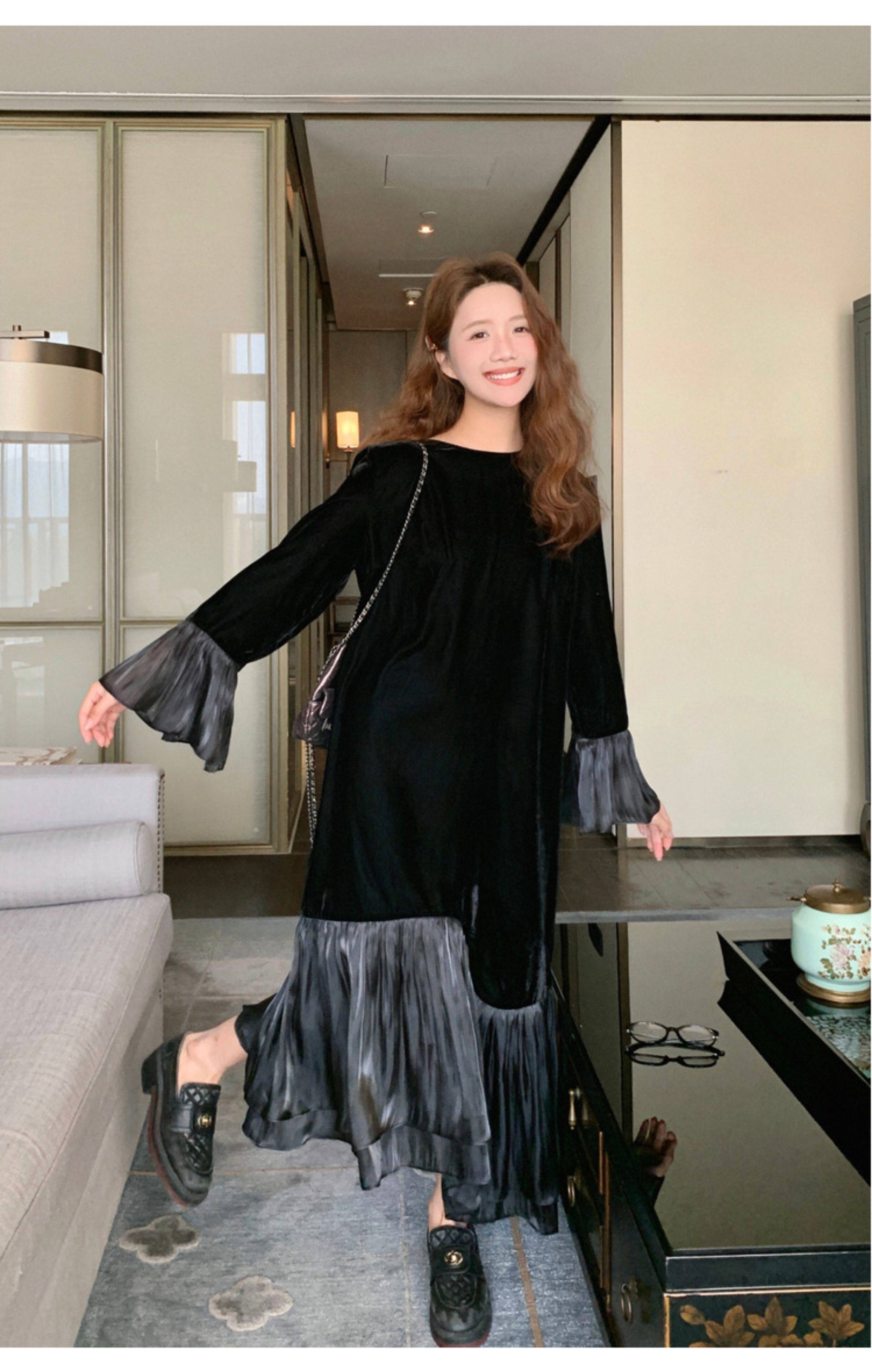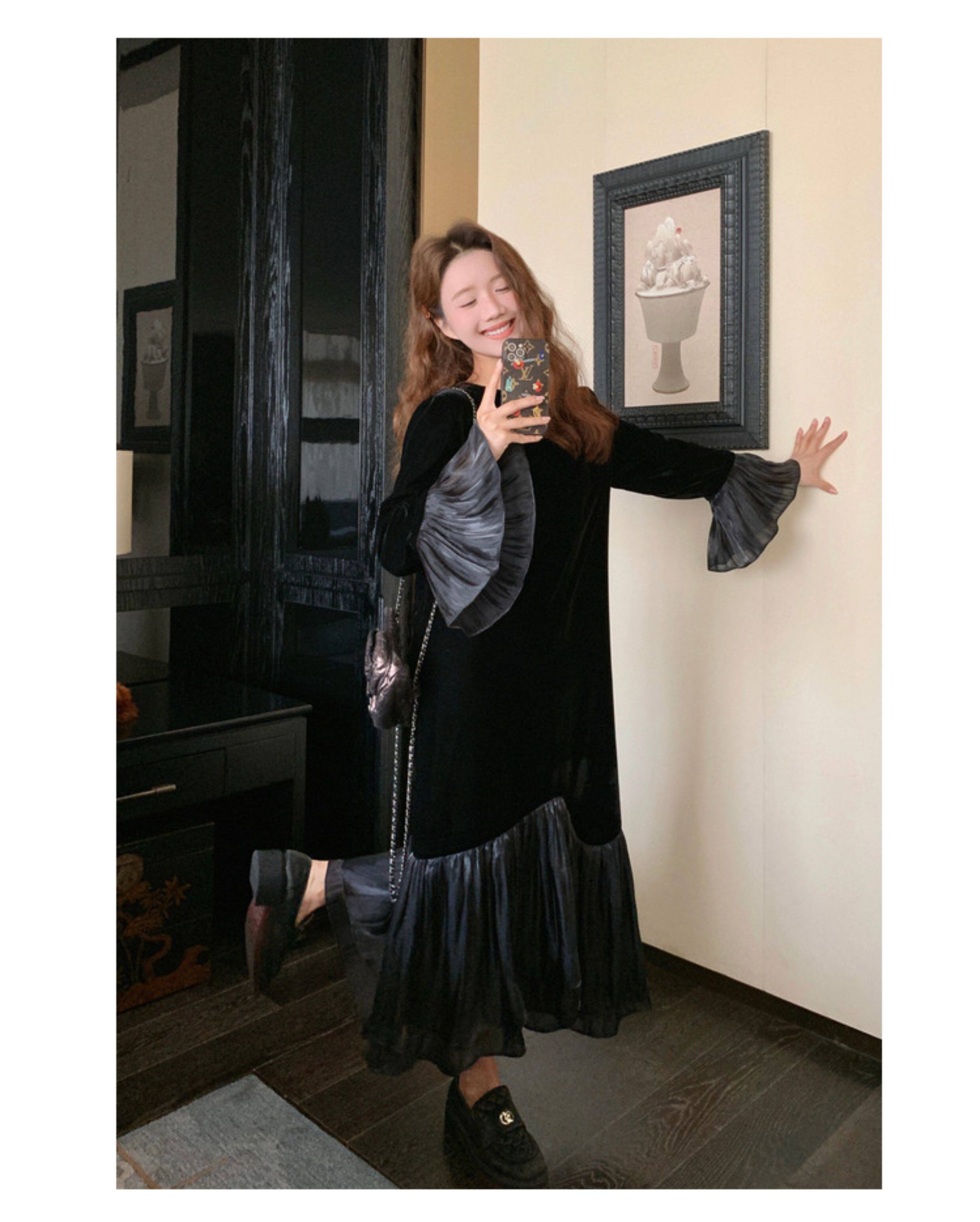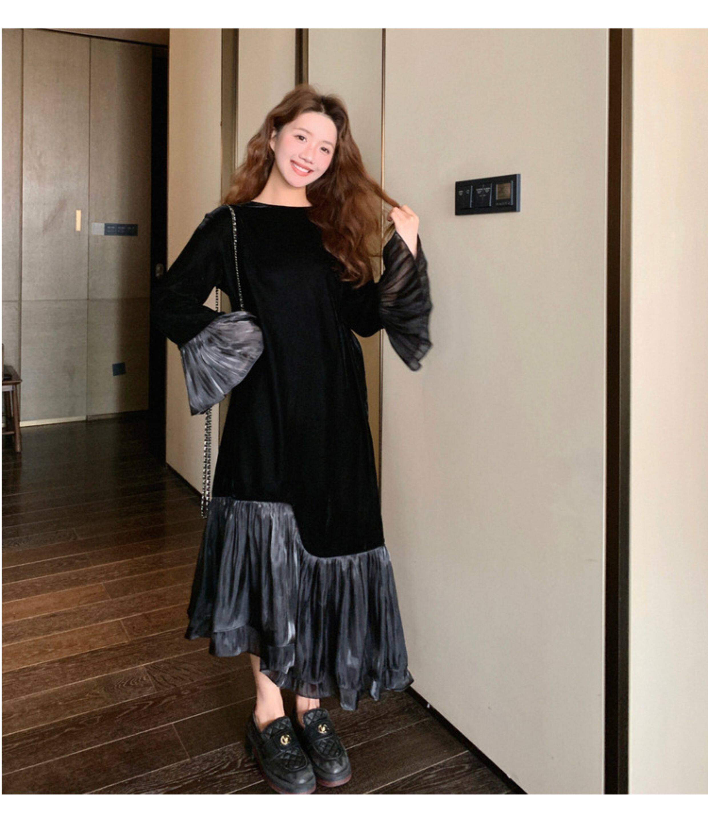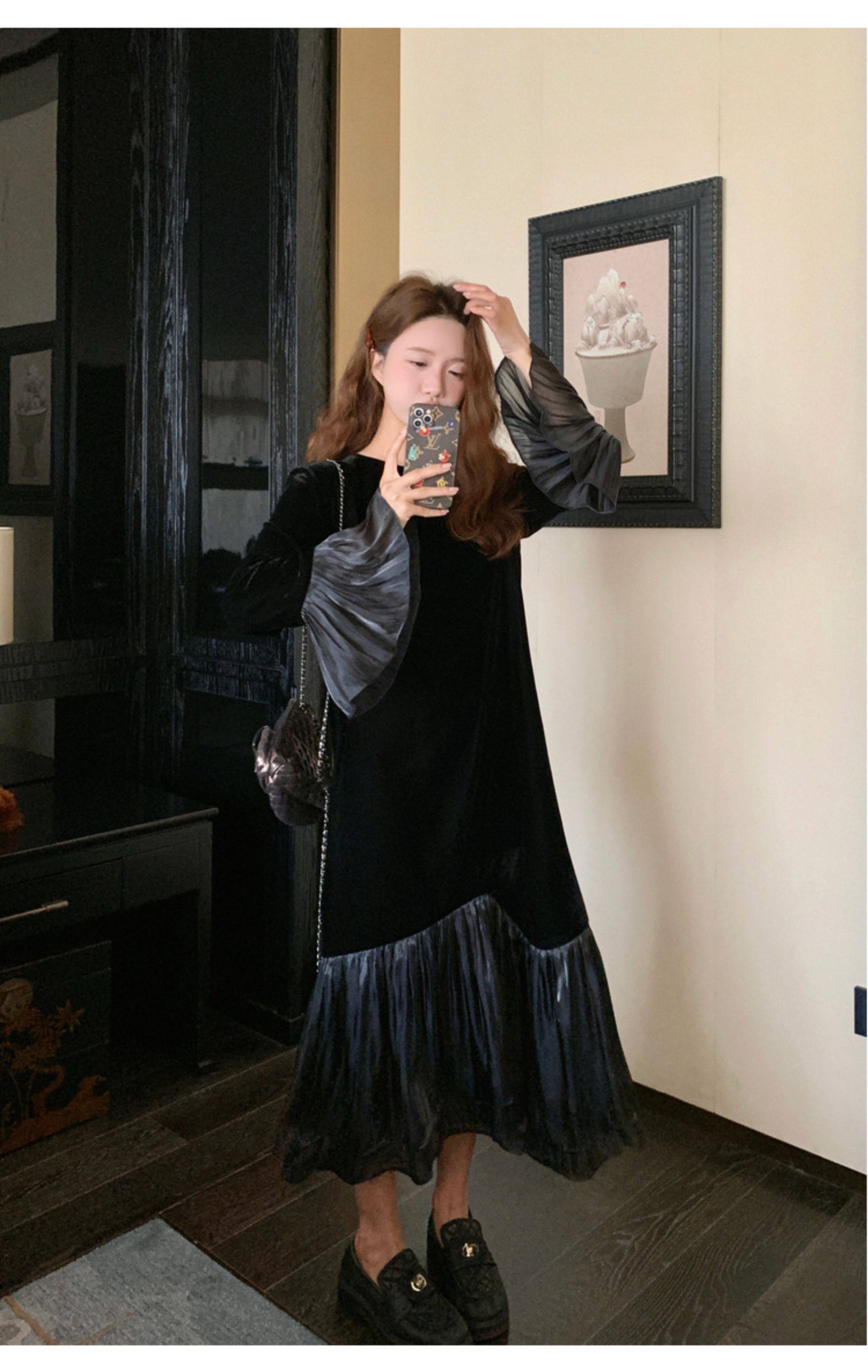 【商品名】【ワンピース】春 秋 冬 フレンチ 高級感 気質よい フリル ベルベット 長袖ワンピース