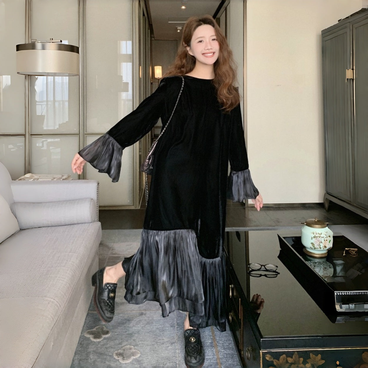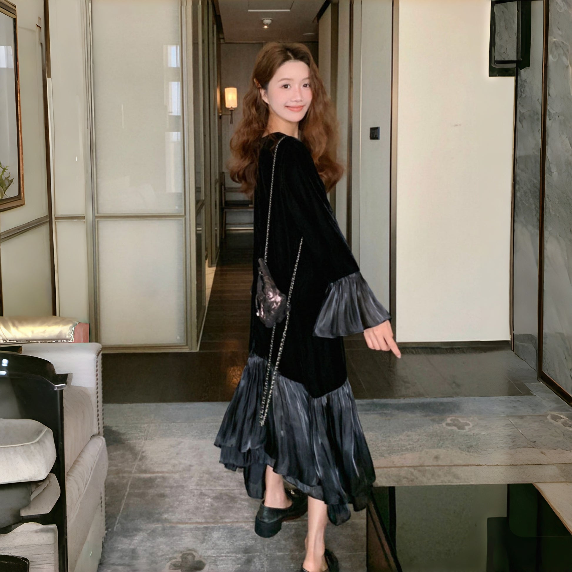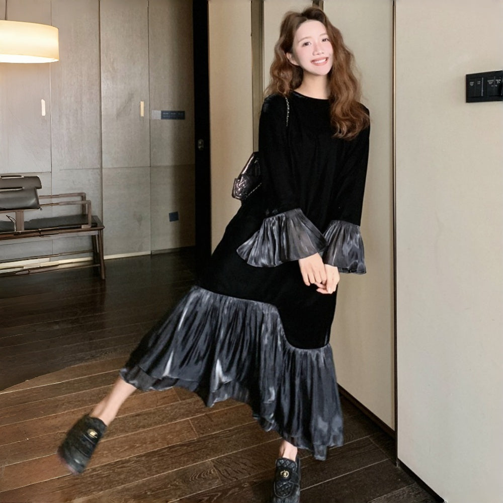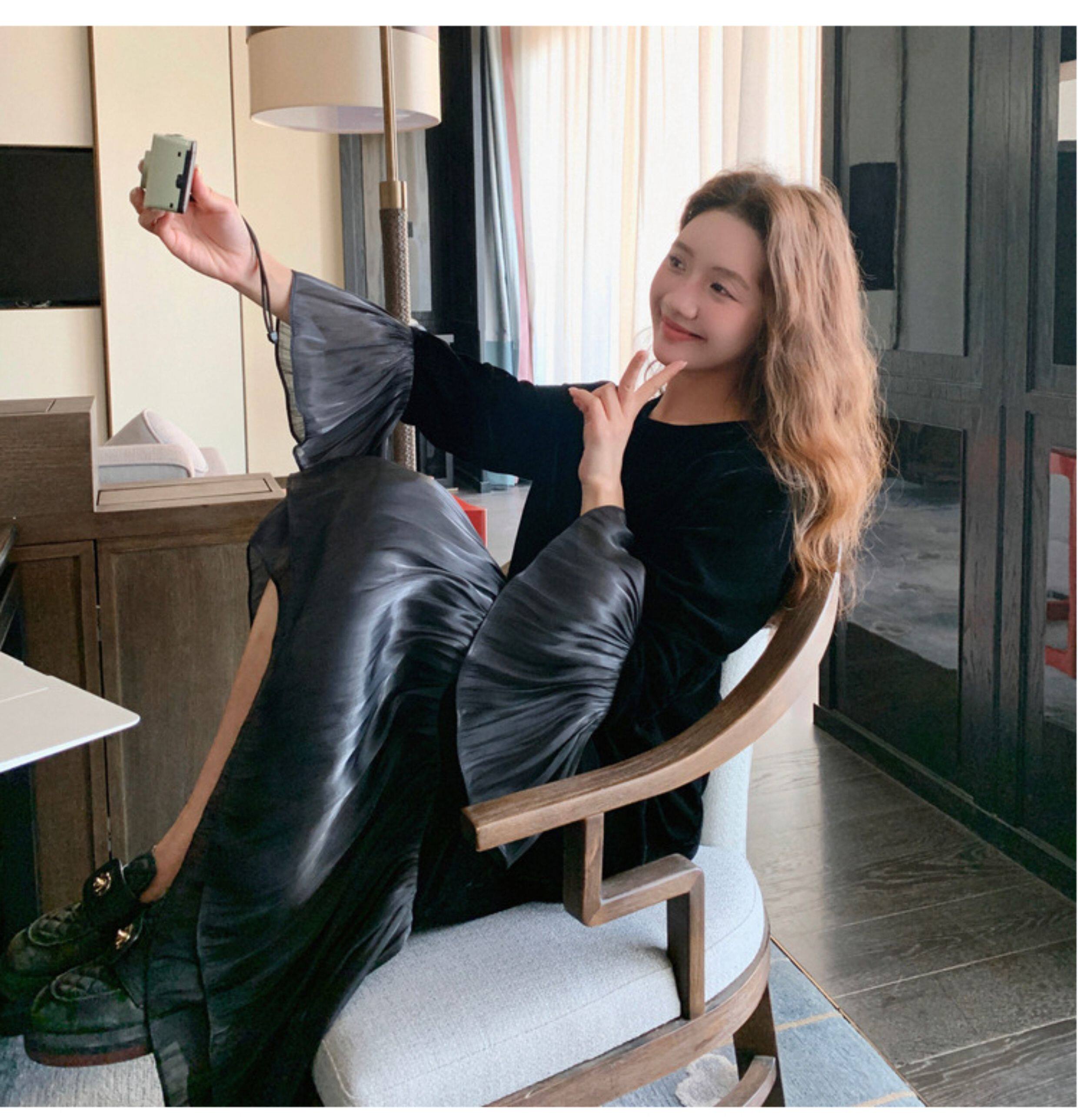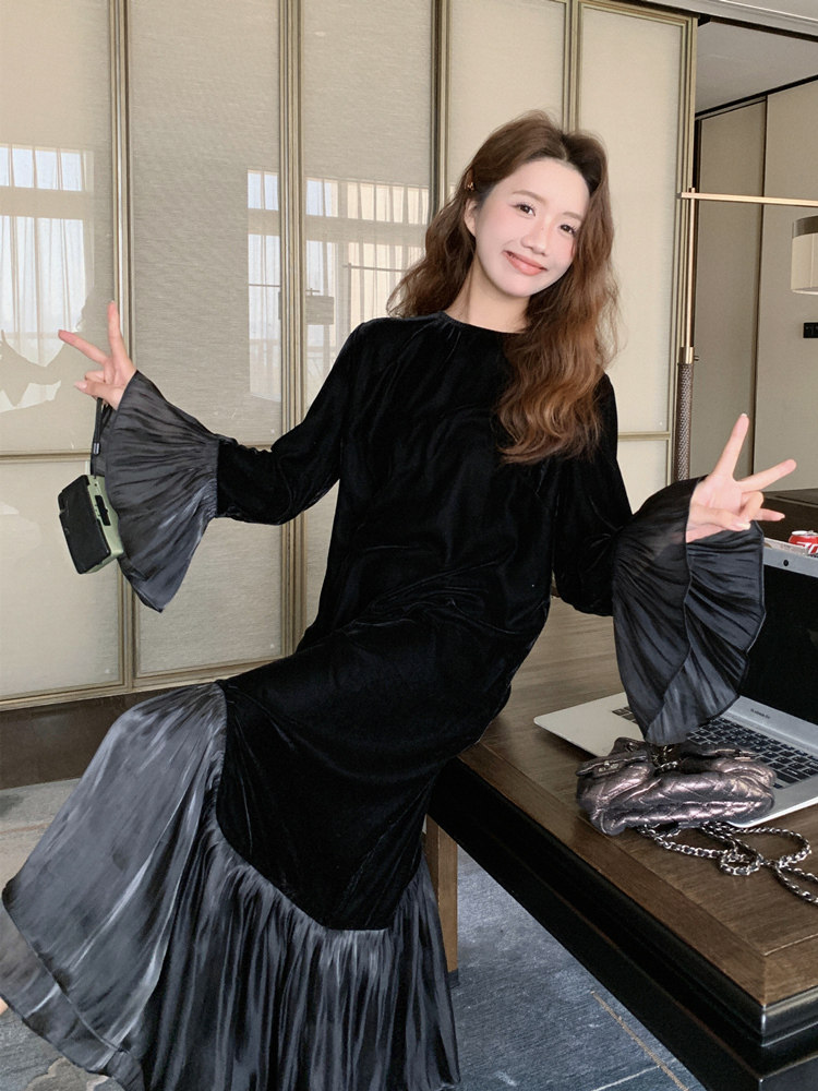 【商品名】【ワンピース】春 秋 冬 フレンチ 高級感 気質よい フリル ベルベット 長袖ワンピース
