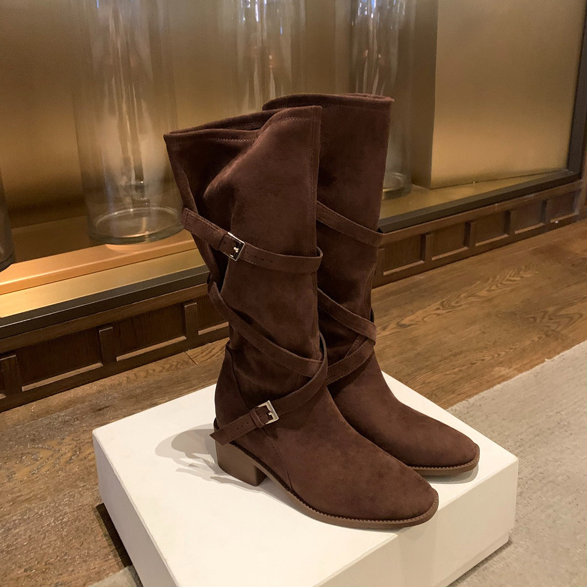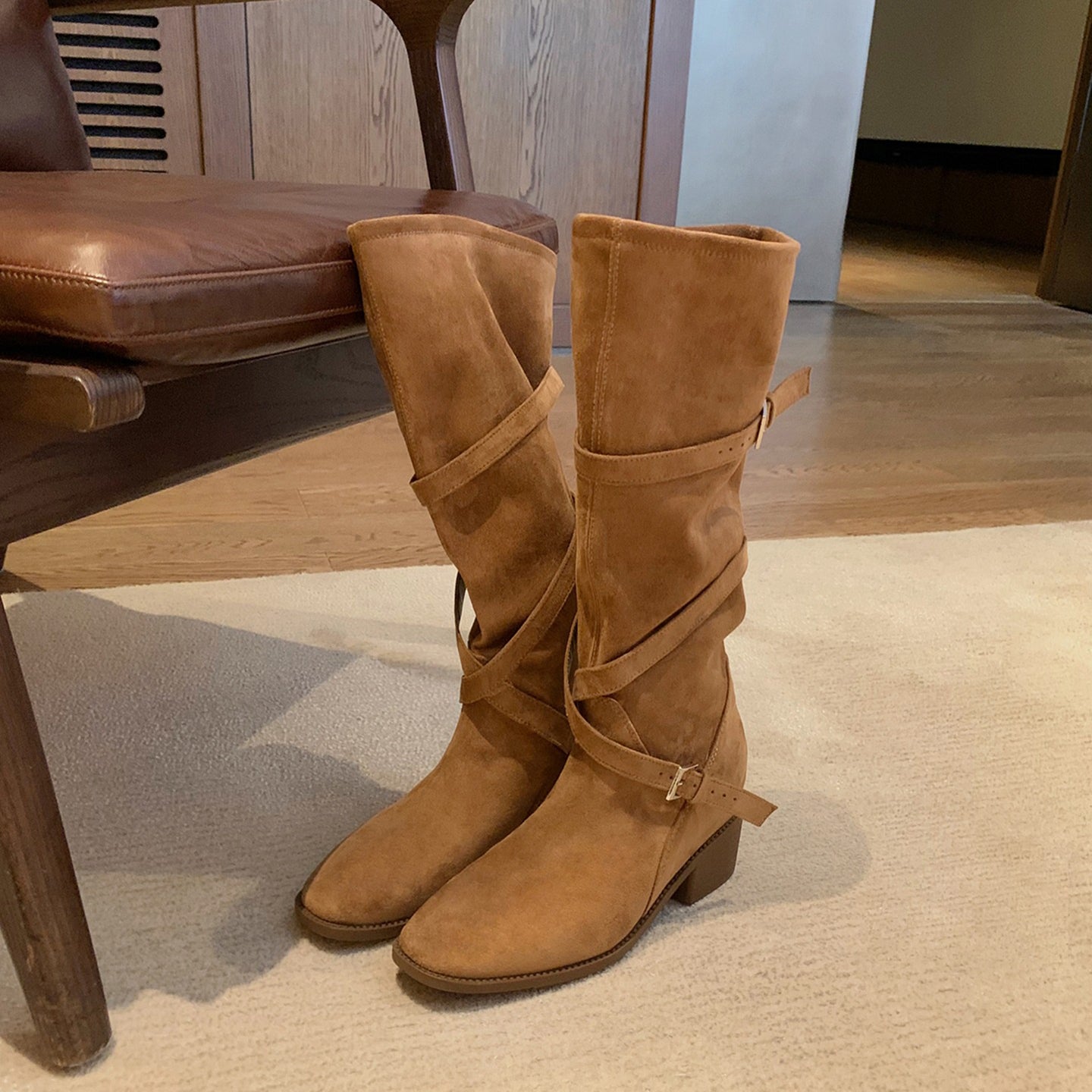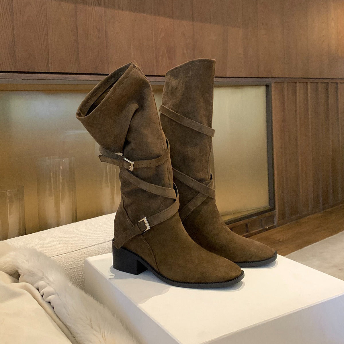 【商品名】【シューズ】美脚効果 尖丸トゥ クロスベルト 太ヒール ミドルブーツ