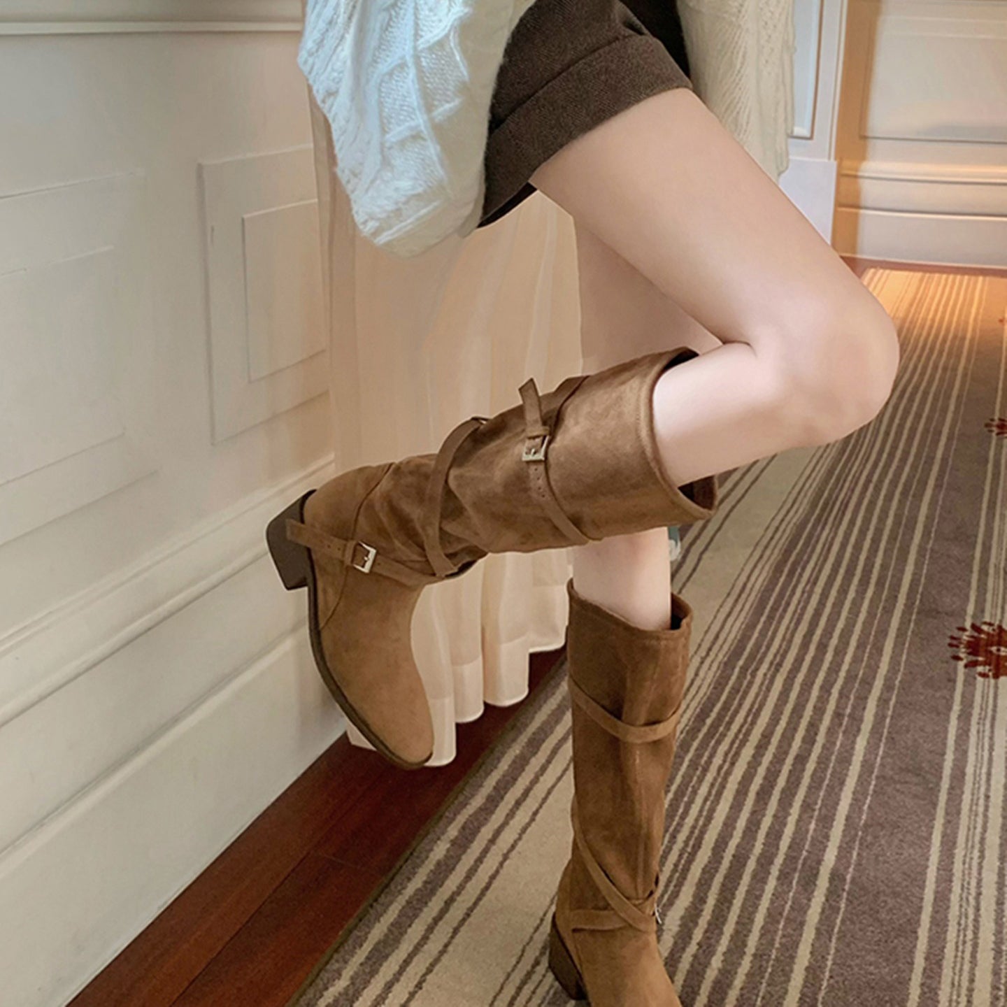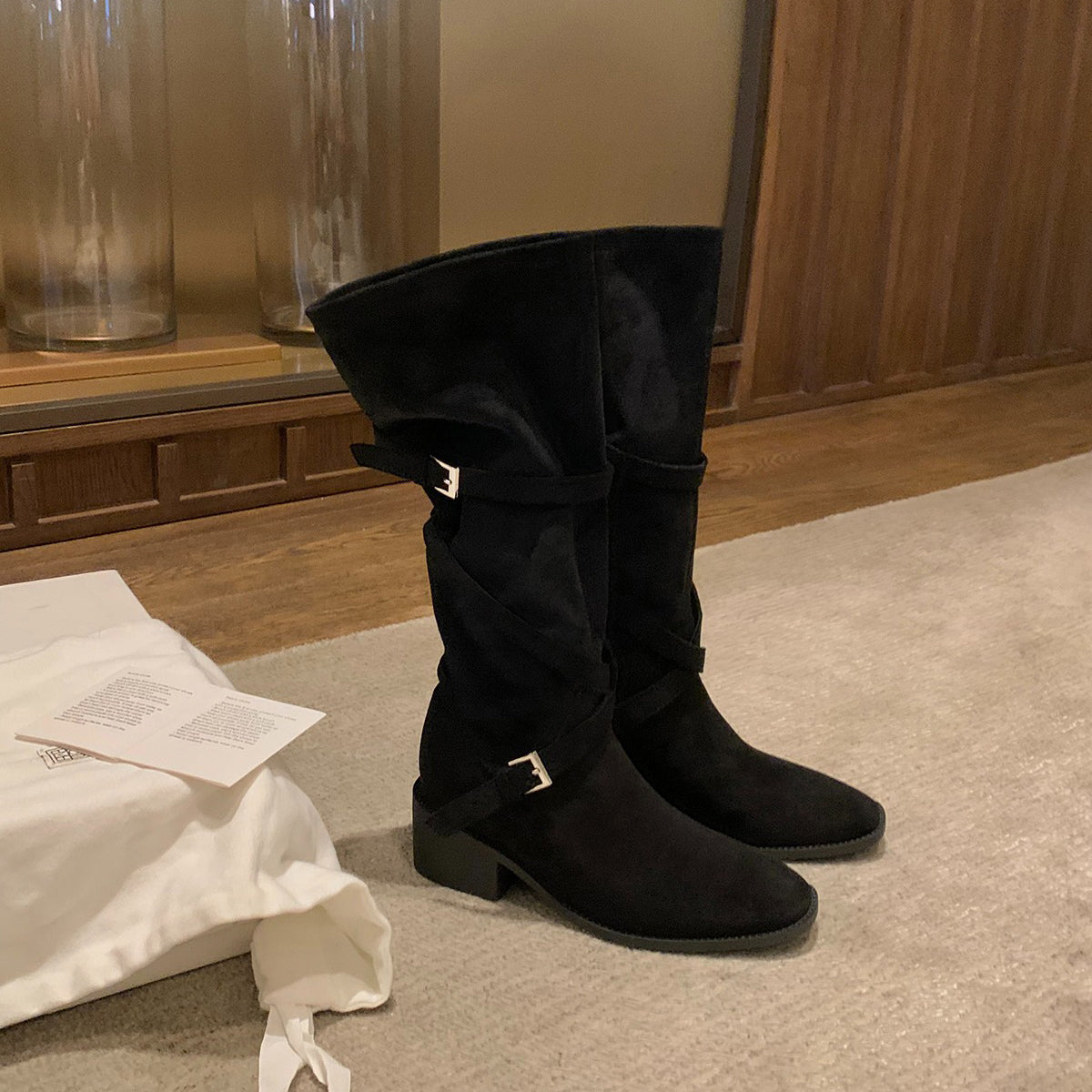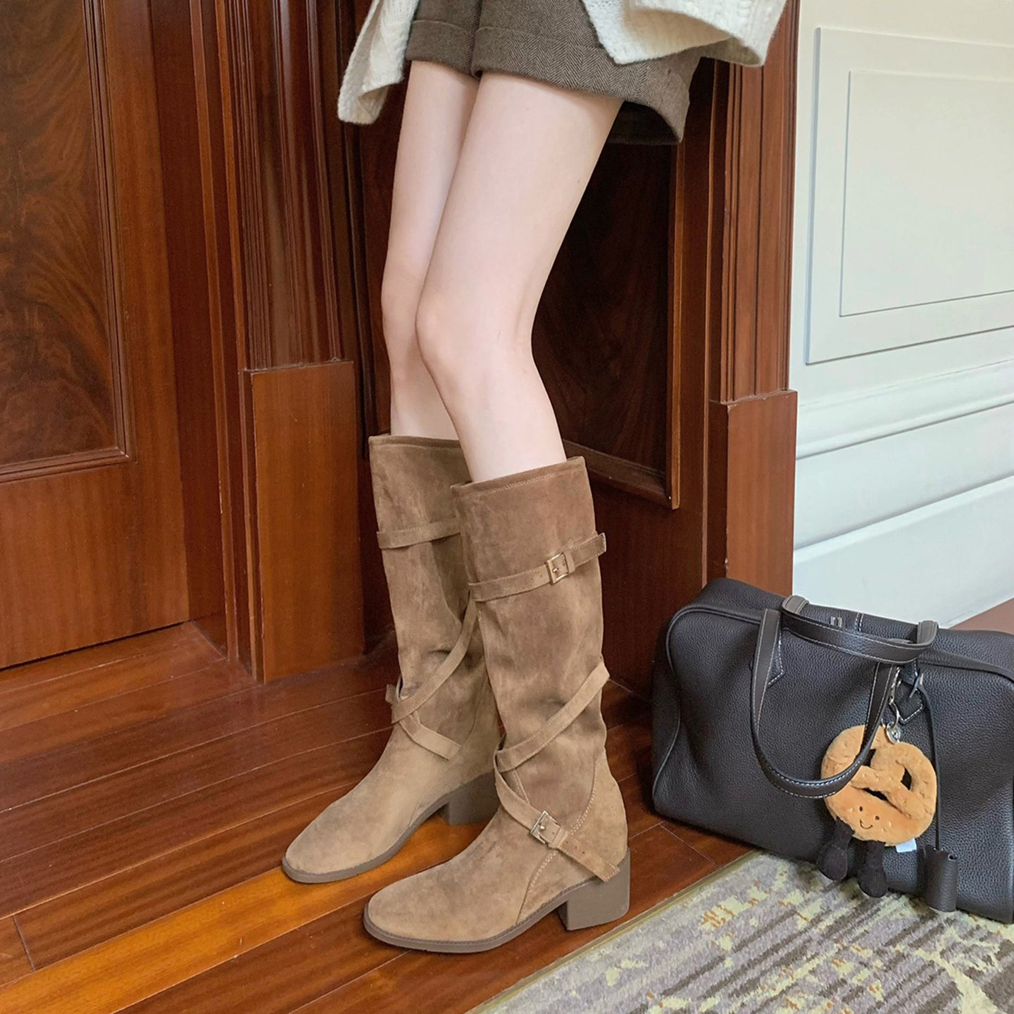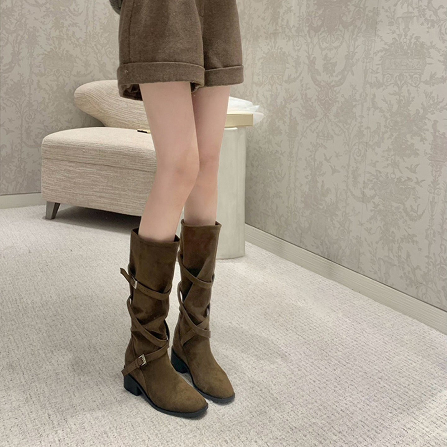 【商品名】【シューズ】美脚効果 尖丸トゥ クロスベルト 太ヒール ミドルブーツ