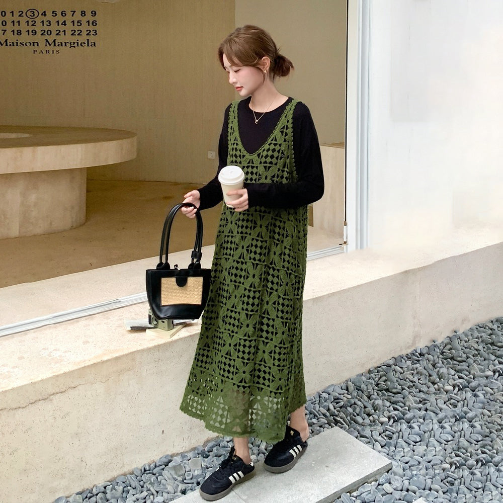 【セットアップ】透かし編みニットワンピースセット レイヤード風 レディース 韓国風 雰囲気2点セット【JZシリーズ】