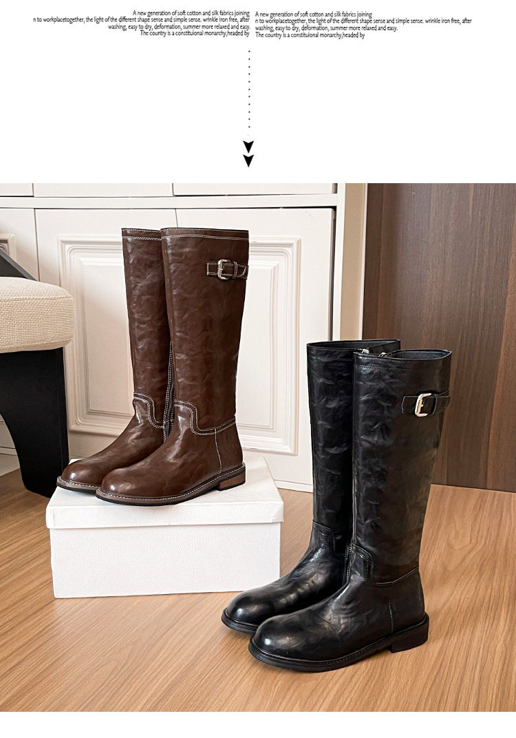 【商品名】【シューズ】🌟ウォッシュドホースレザー厚底ブーツ💜中筒・長靴 サイドジッパー ベルト付き レディース 秋冬新作