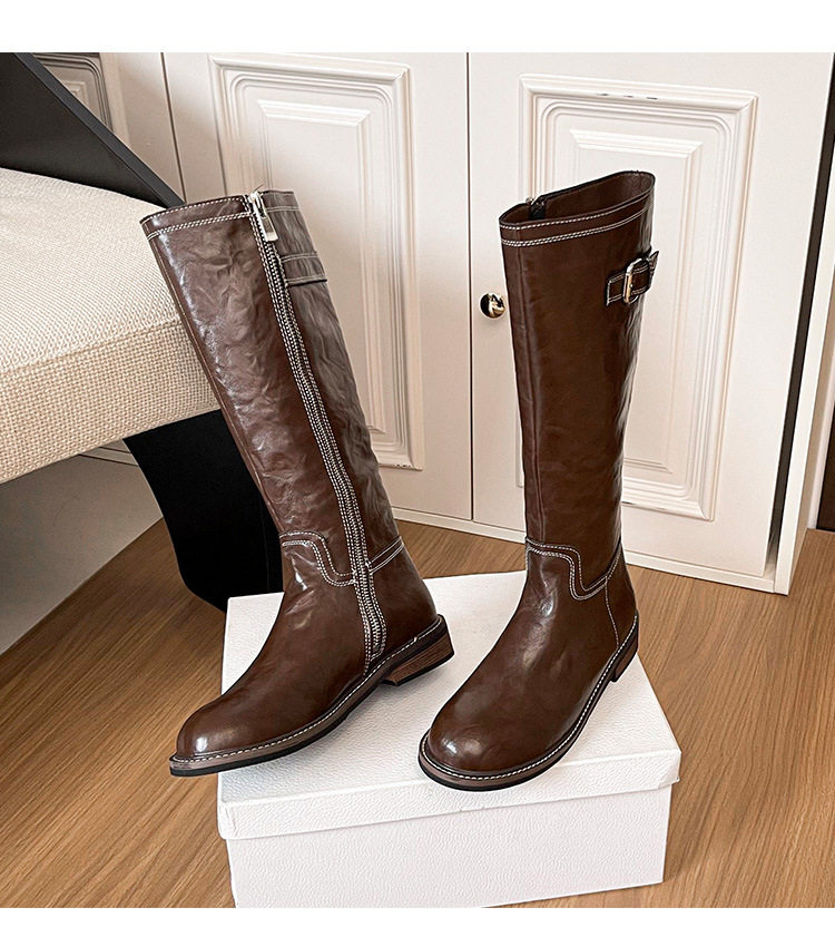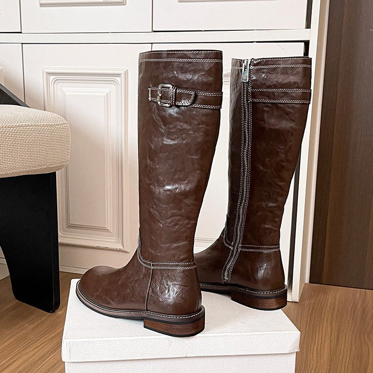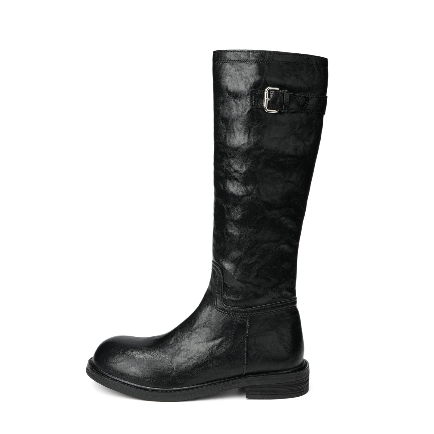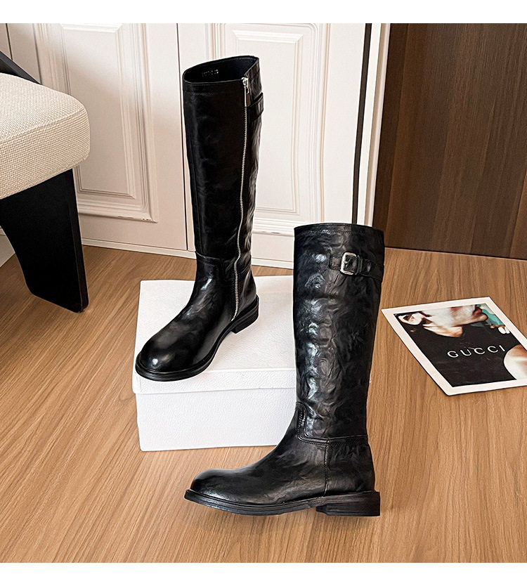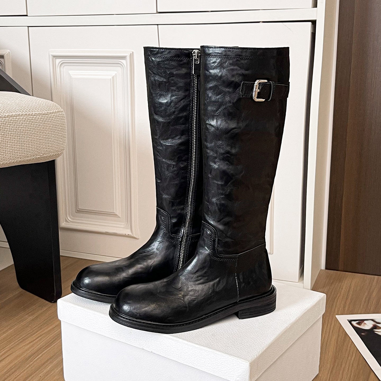 【シューズ】🌟ウォッシュドホースレザー厚底ブーツ💜中筒・長靴 サイドジッパー ベルト付き レディース 秋冬新作