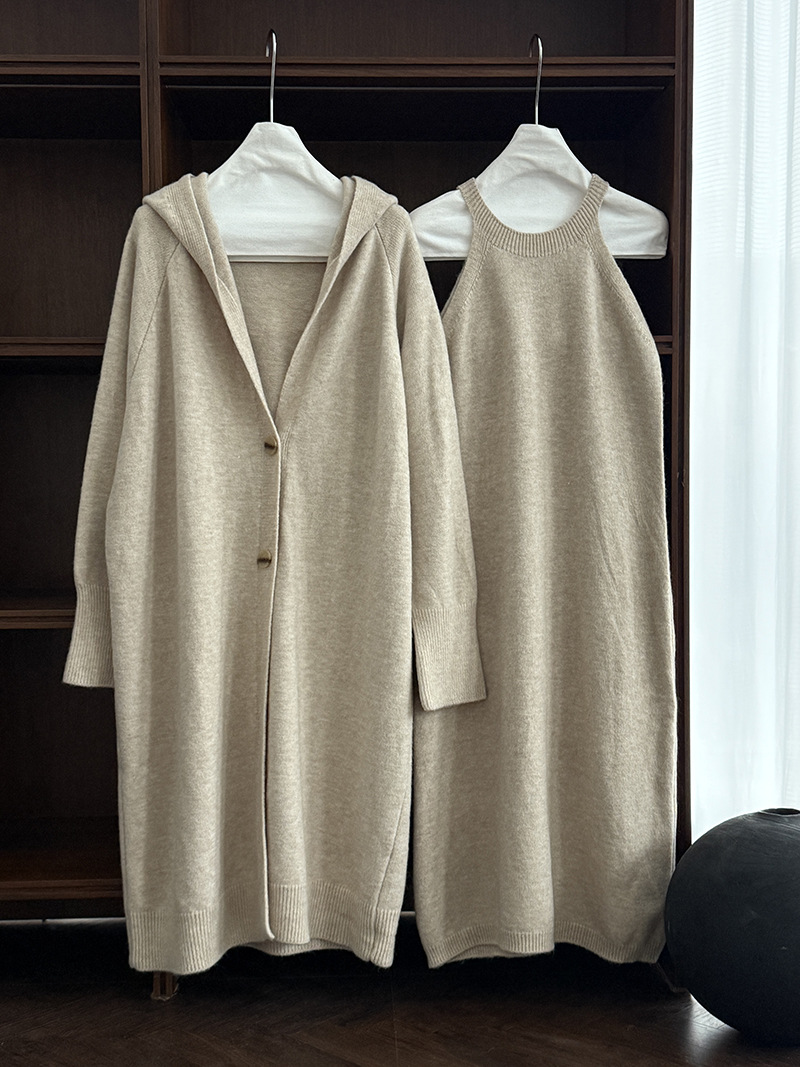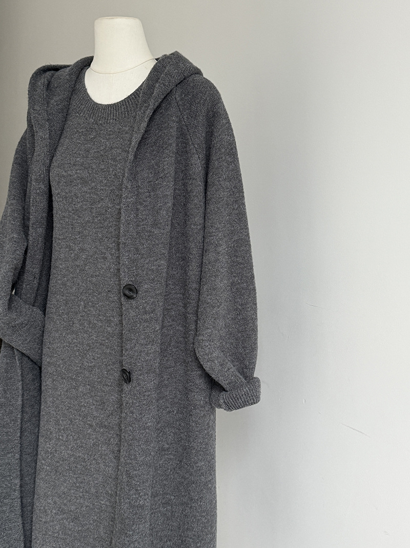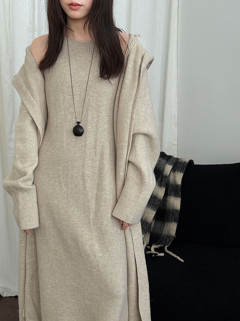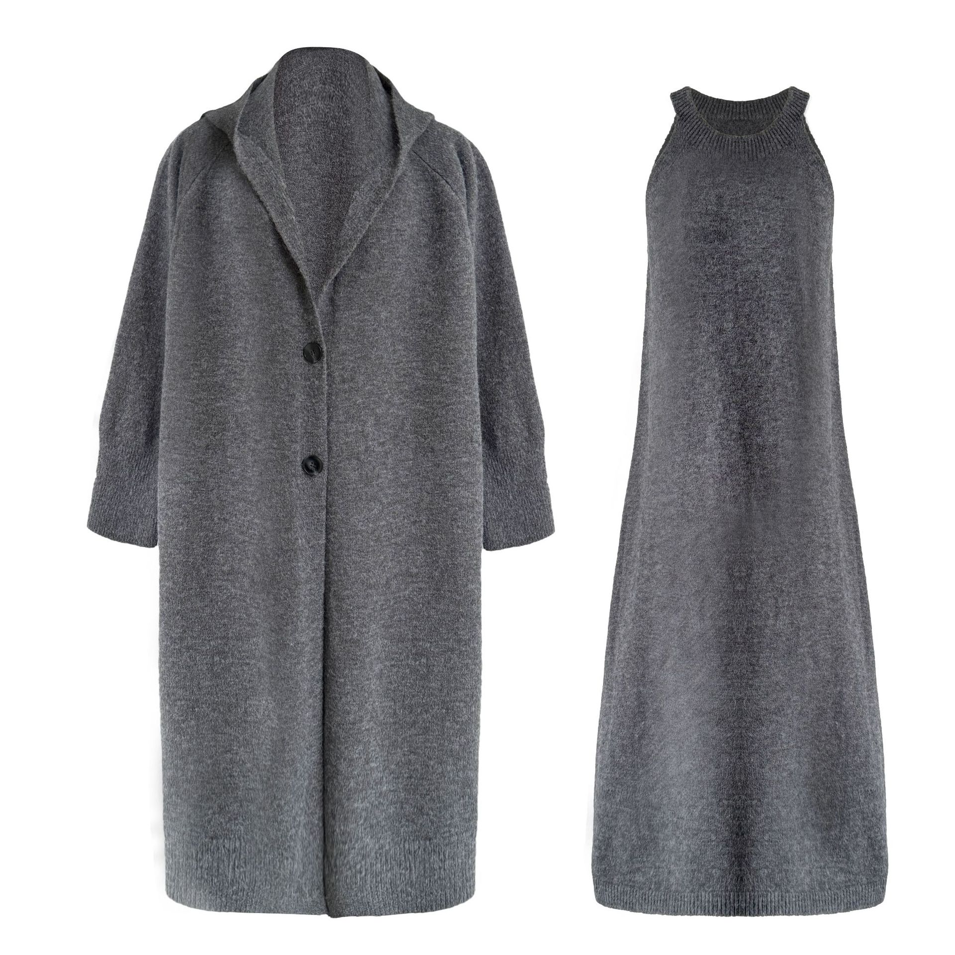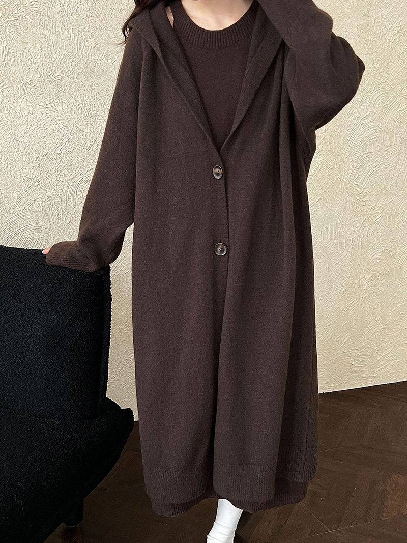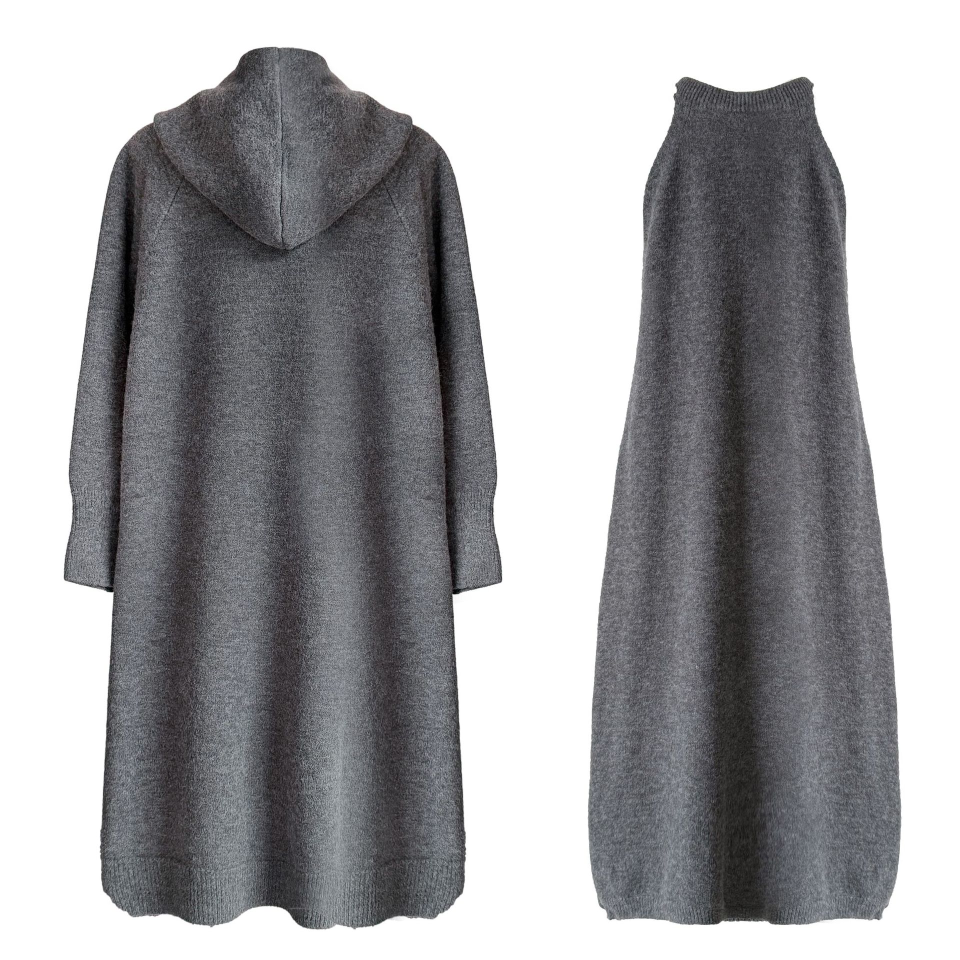 【商品名】【セットアップ】ゆったり風 ロング丈 春 秋 冬 フード付き カーディガン + ノースリーブ ワンピース 2点ワンピースセット 【JZシリーズ】