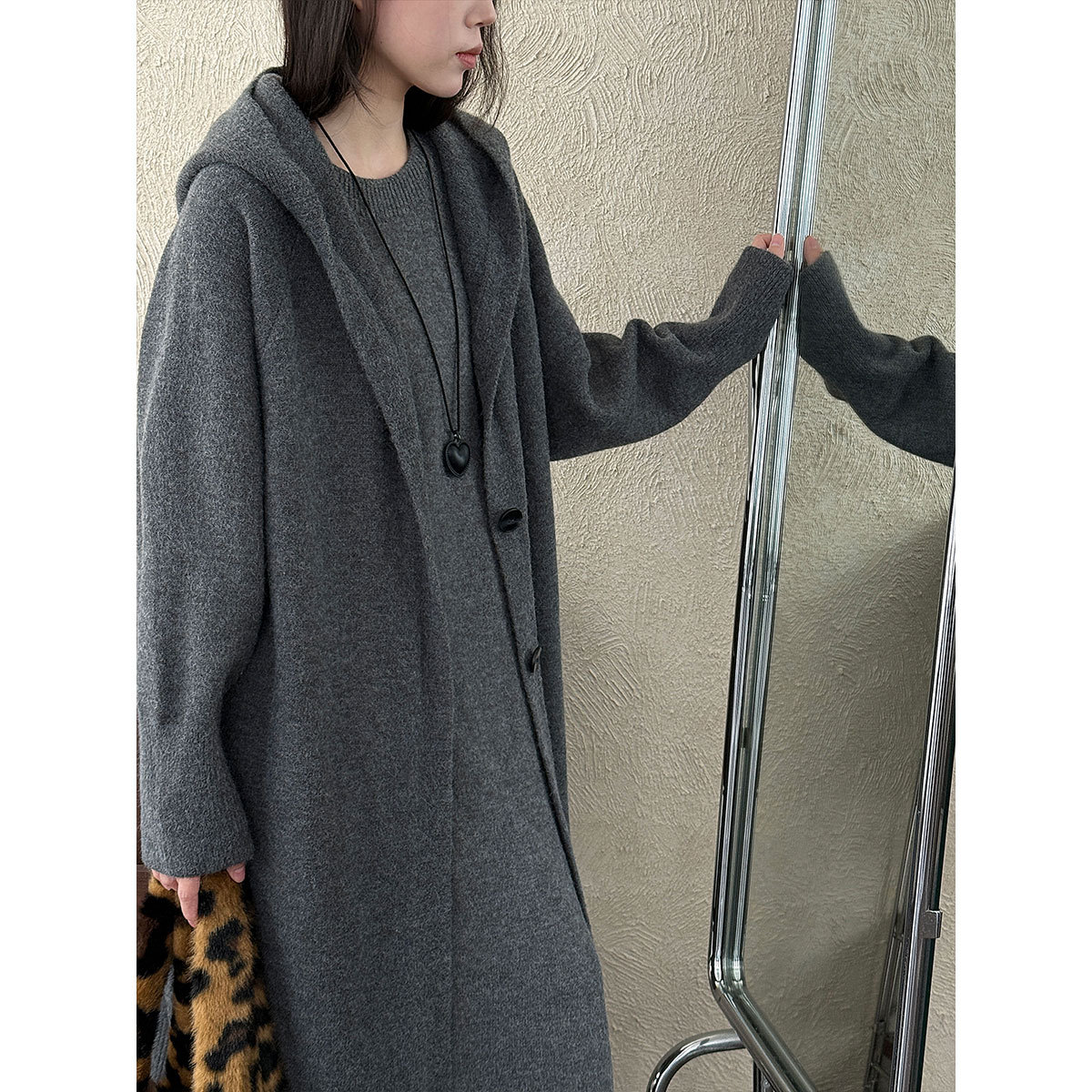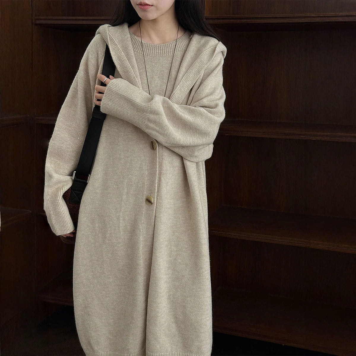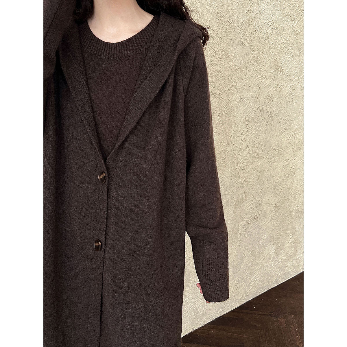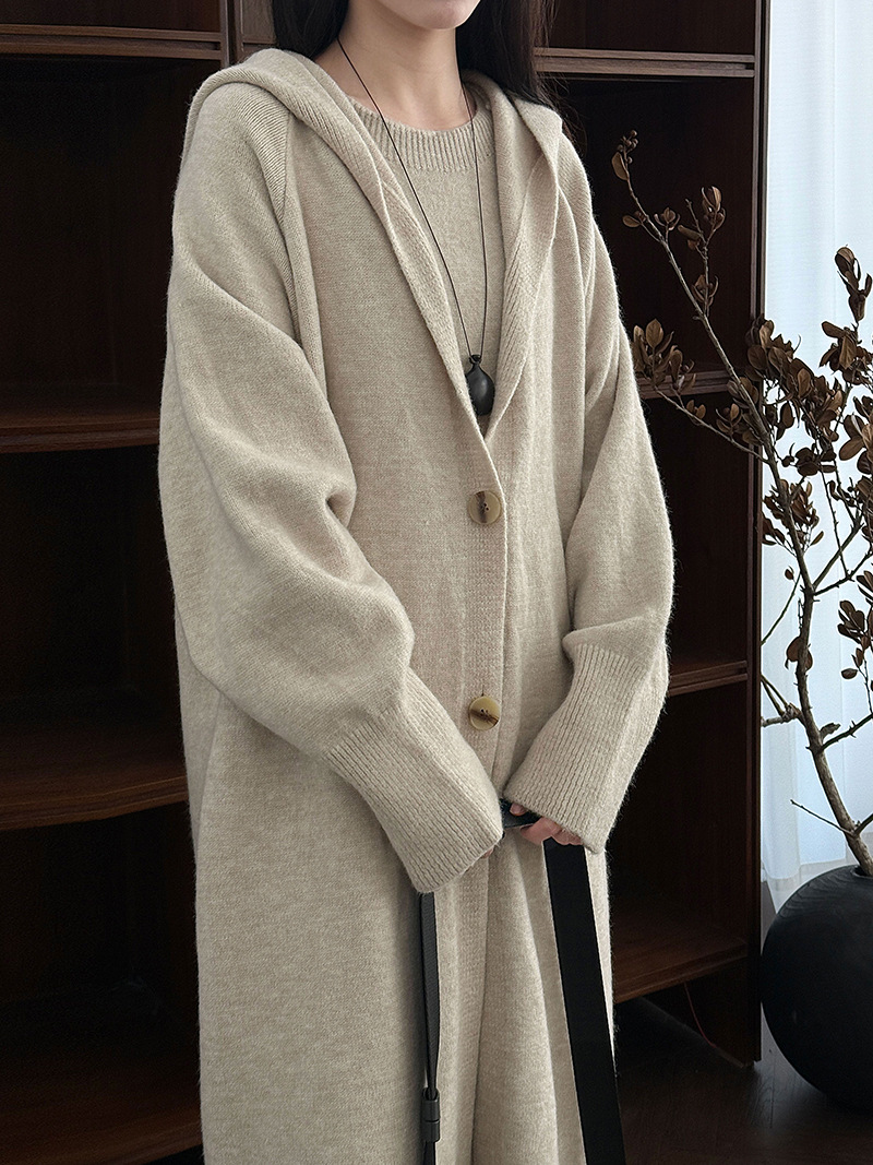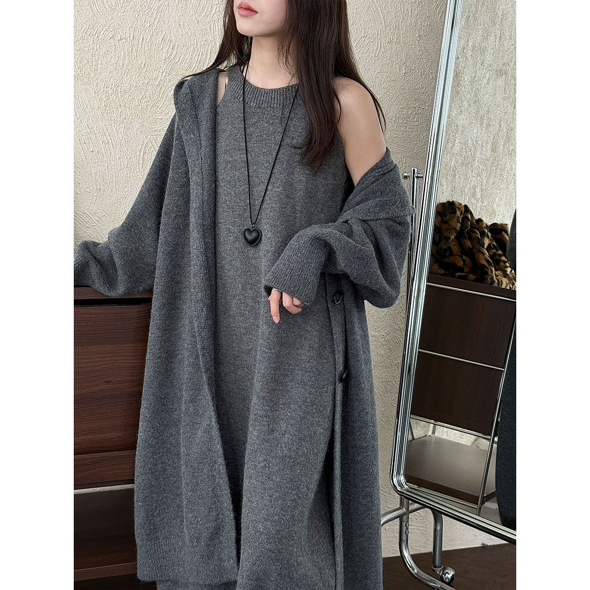 【商品名】【セットアップ】ゆったり風 ロング丈 春 秋 冬 フード付き カーディガン + ノースリーブ ワンピース 2点ワンピースセット 【JZシリーズ】