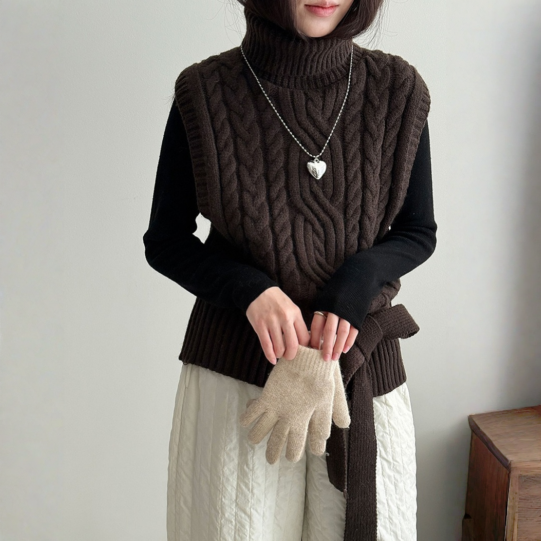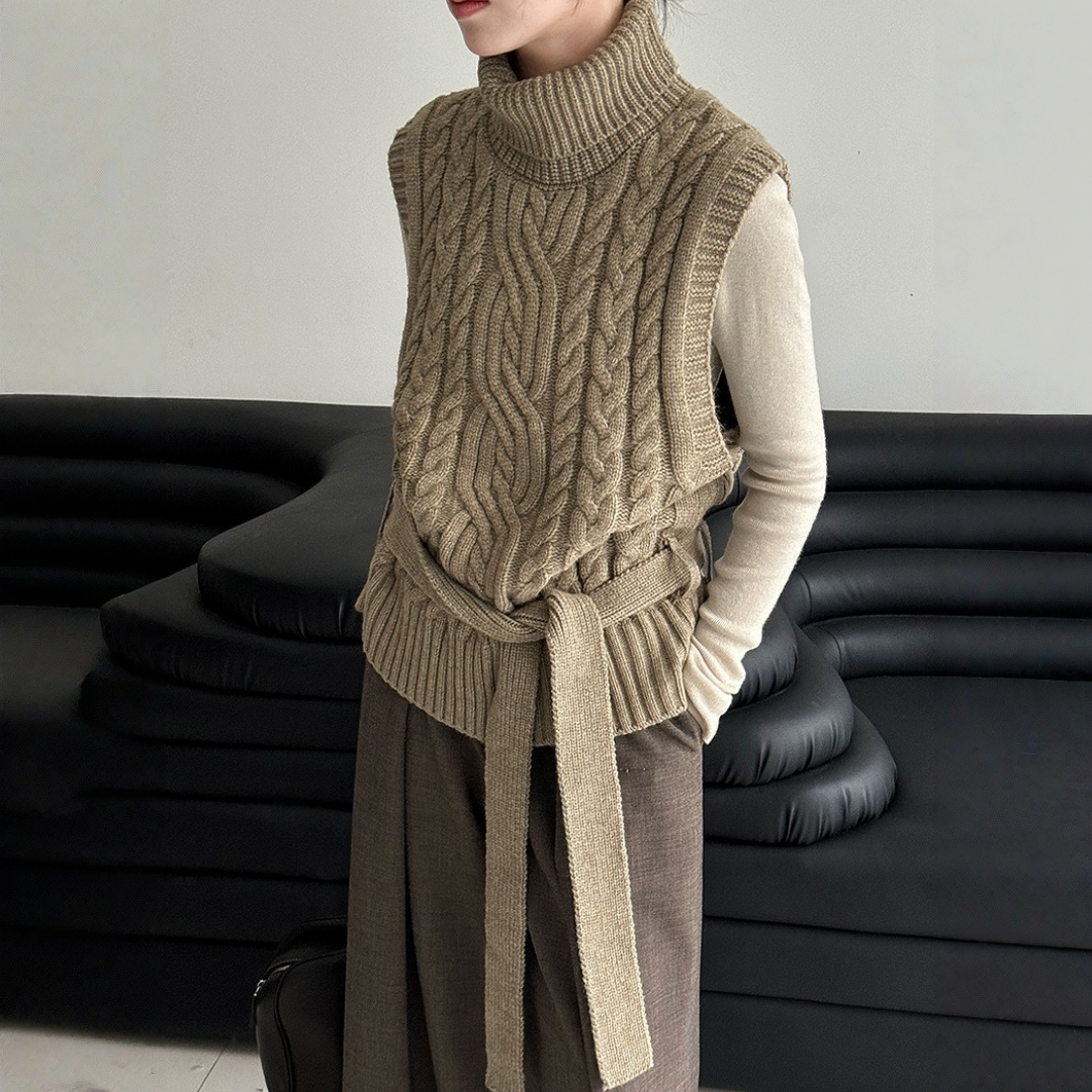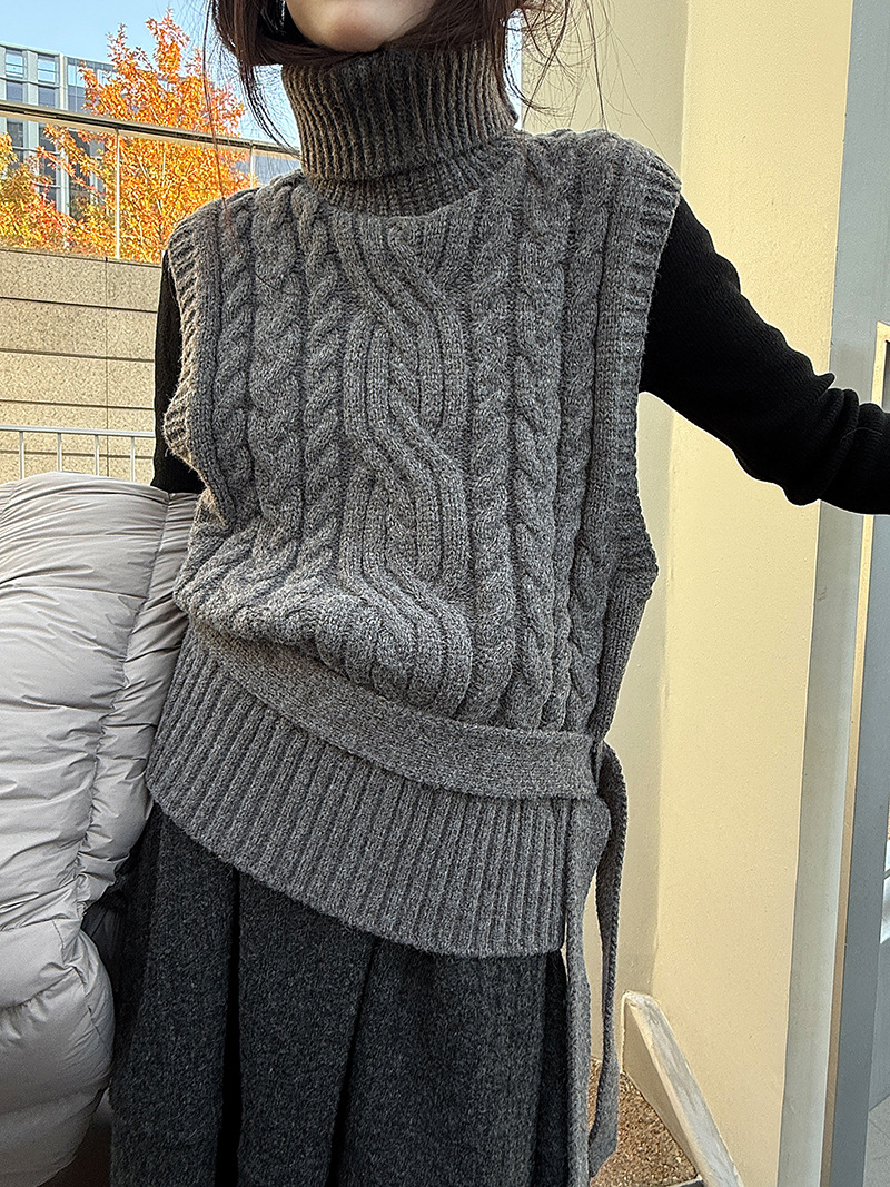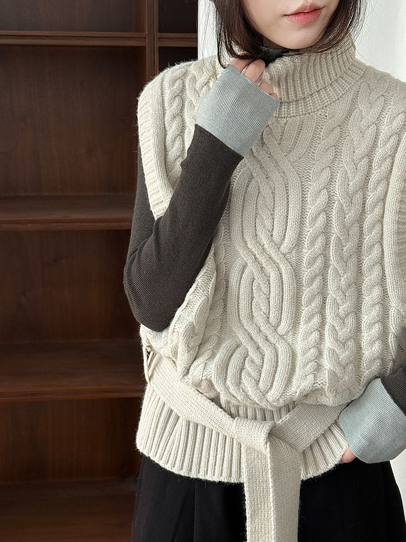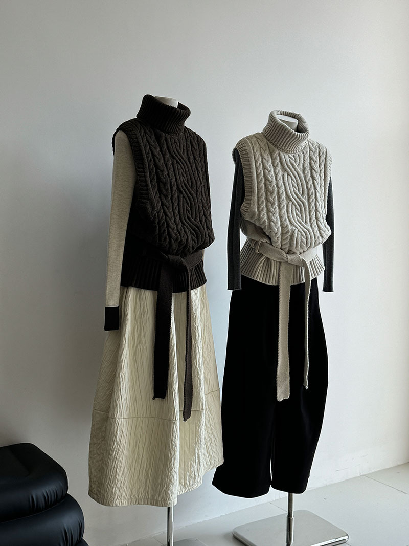【トップス】春 秋 冬 ハイネック ケーブル ベルト付き ノースリーブ セーター 【JZシリーズ】