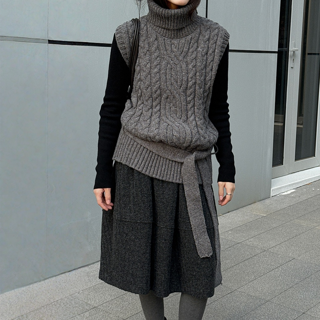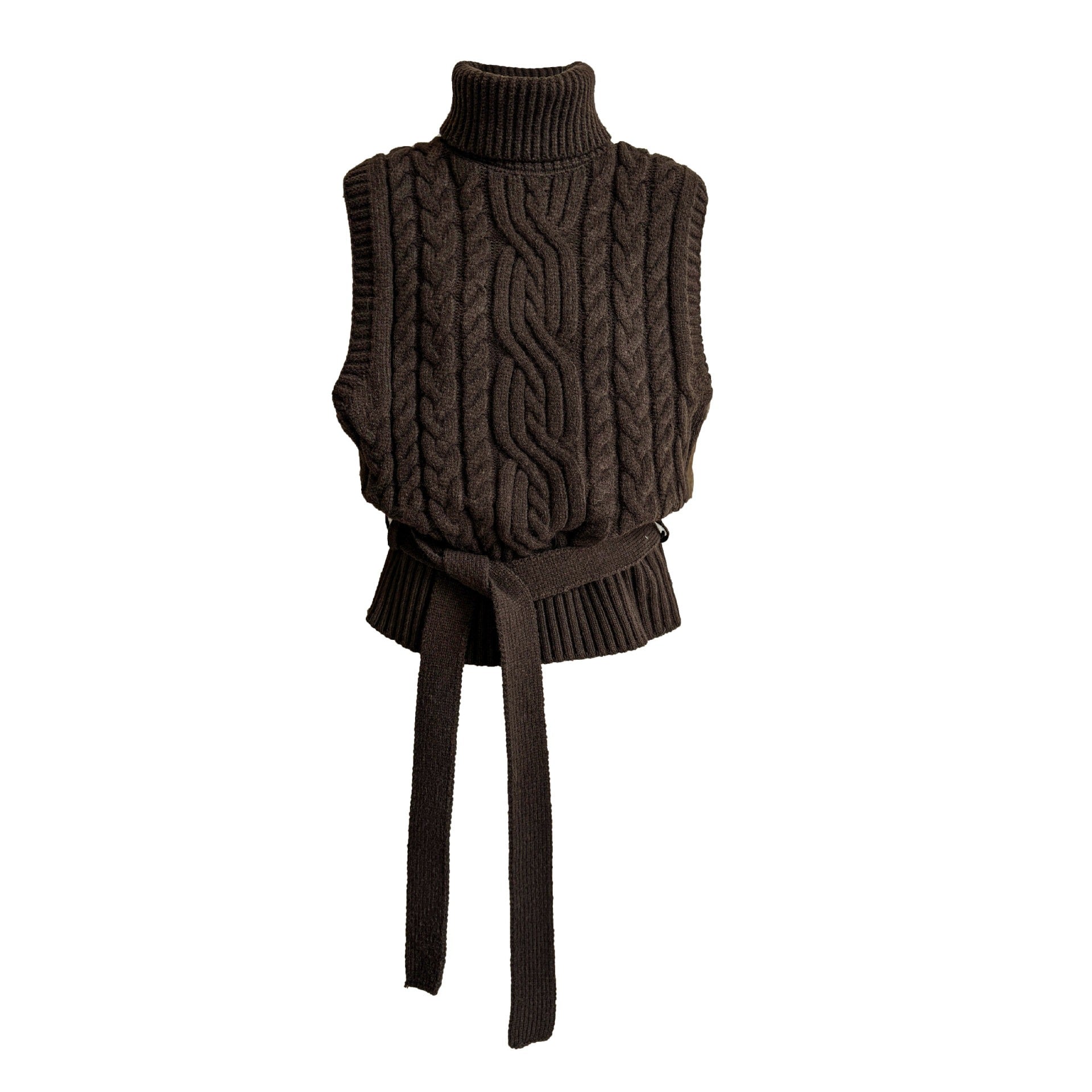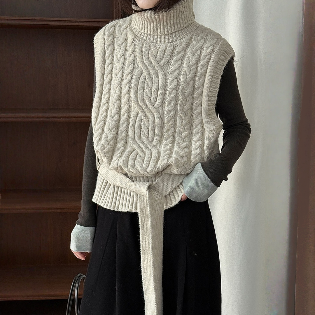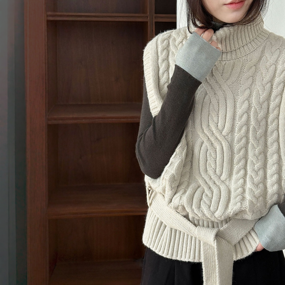 【トップス】春 秋 冬 ハイネック ケーブル ベルト付き ノースリーブ セーター 【JZシリーズ】