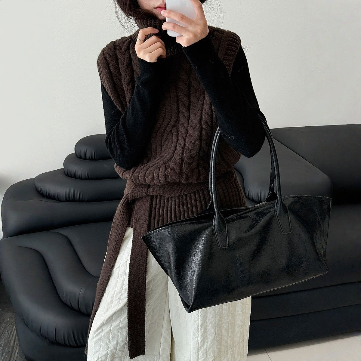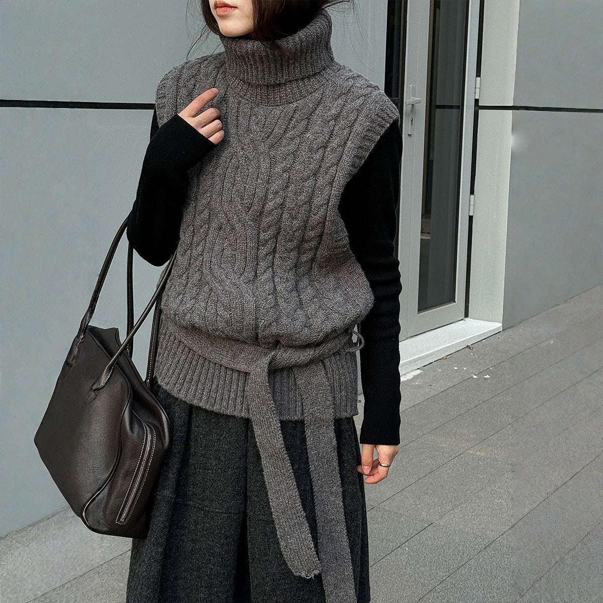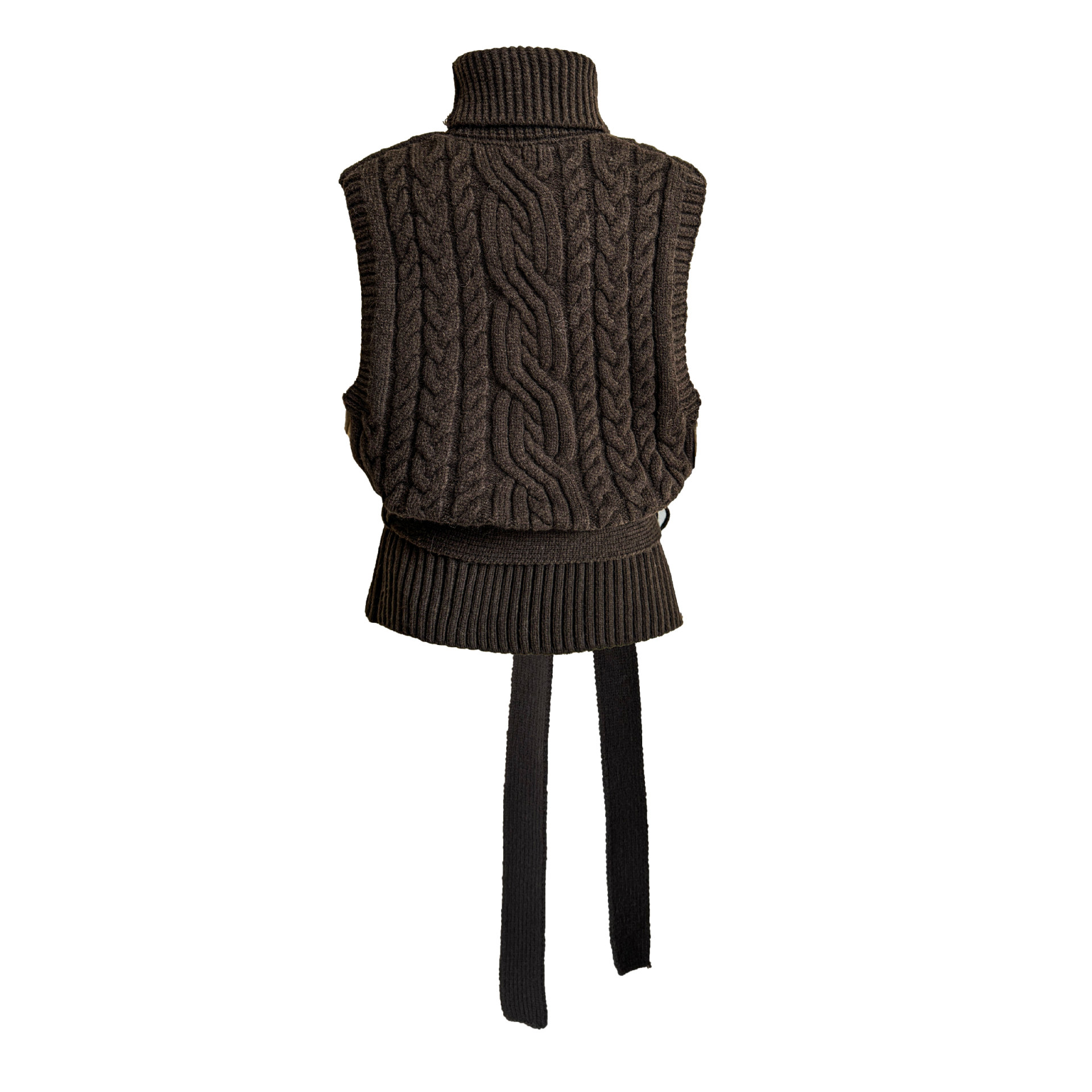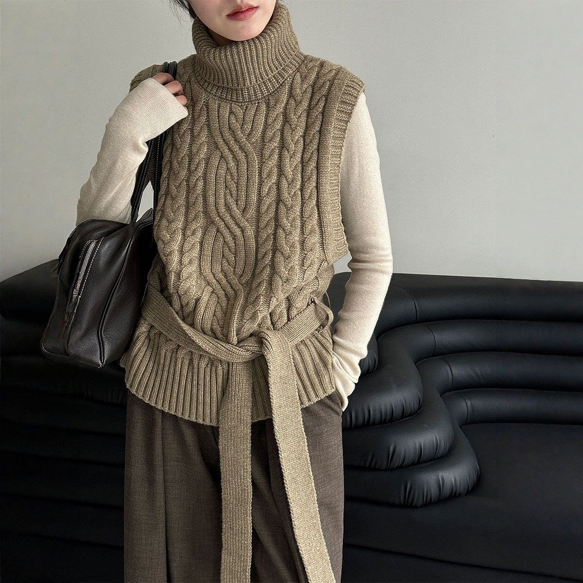 【トップス】春 秋 冬 ハイネック ケーブル ベルト付き ノースリーブ セーター 【JZシリーズ】